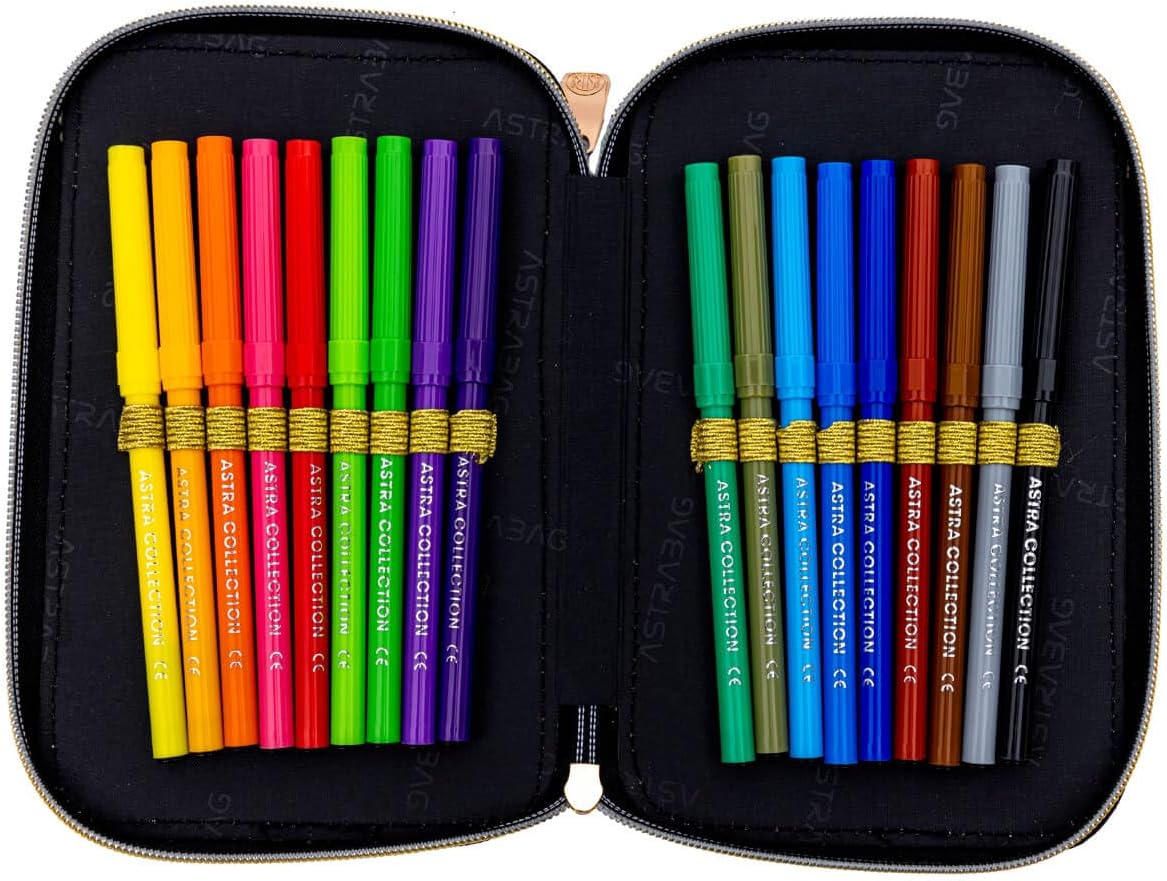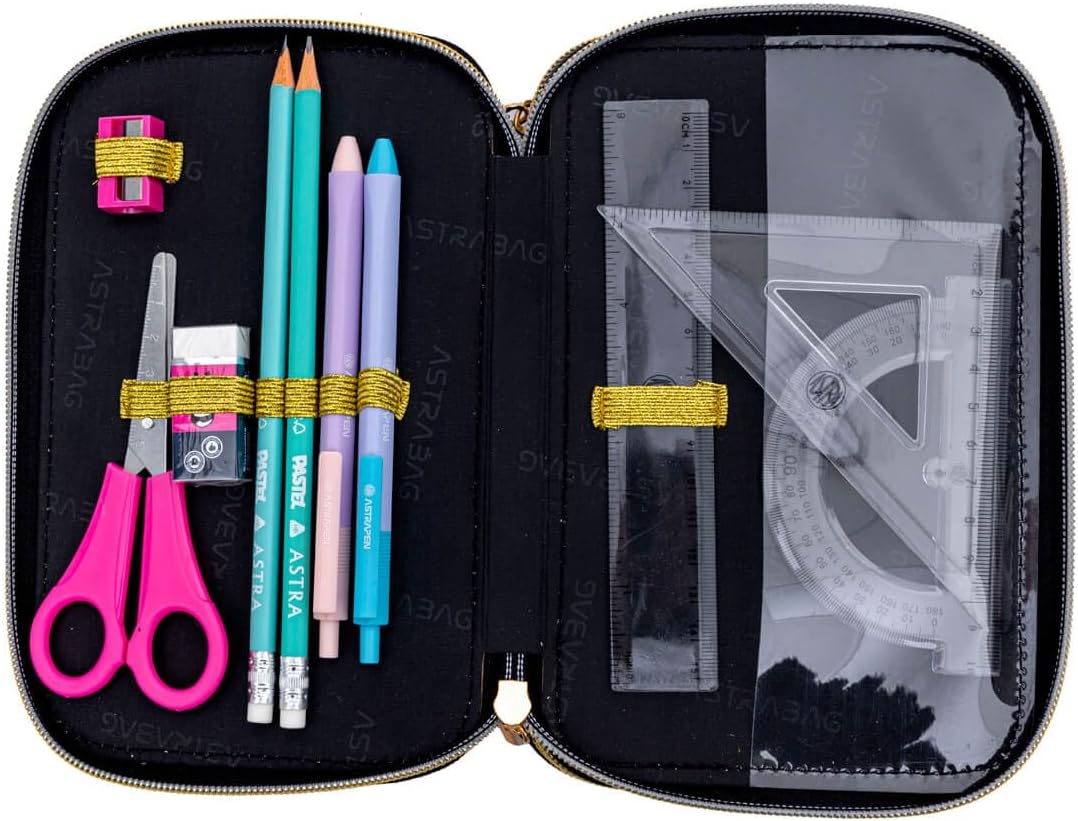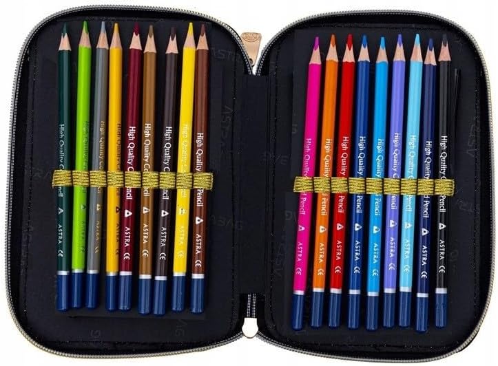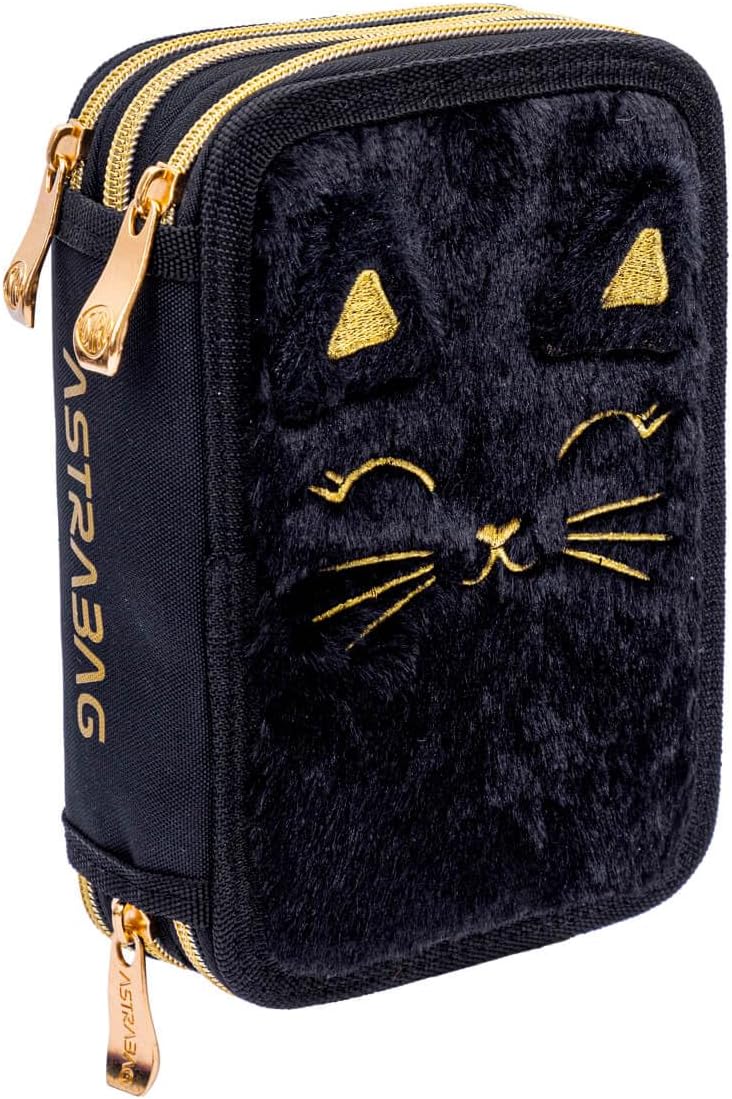 Questo astuccio ha tre scomparti pieni. L'astuccio è realizzato in materiale impermeabile. Questo astuccio per matite ha cerniere di alta qualità e pratici manici. Descrizione dettagliata del prodotto: 3 scomparti Contenuto: > 18 pennarelli > 18 matite colorate > 2 matite > 2 penne > 1 penna a sfera > forbici > gomma > temperamatite > set geometrico > Dimensioni esterne: 21 x 14 x 6,5 cm > Materiale: 100% poliestere Motivo: FLUFFY KITTY BLACK con peluche e orecchie
