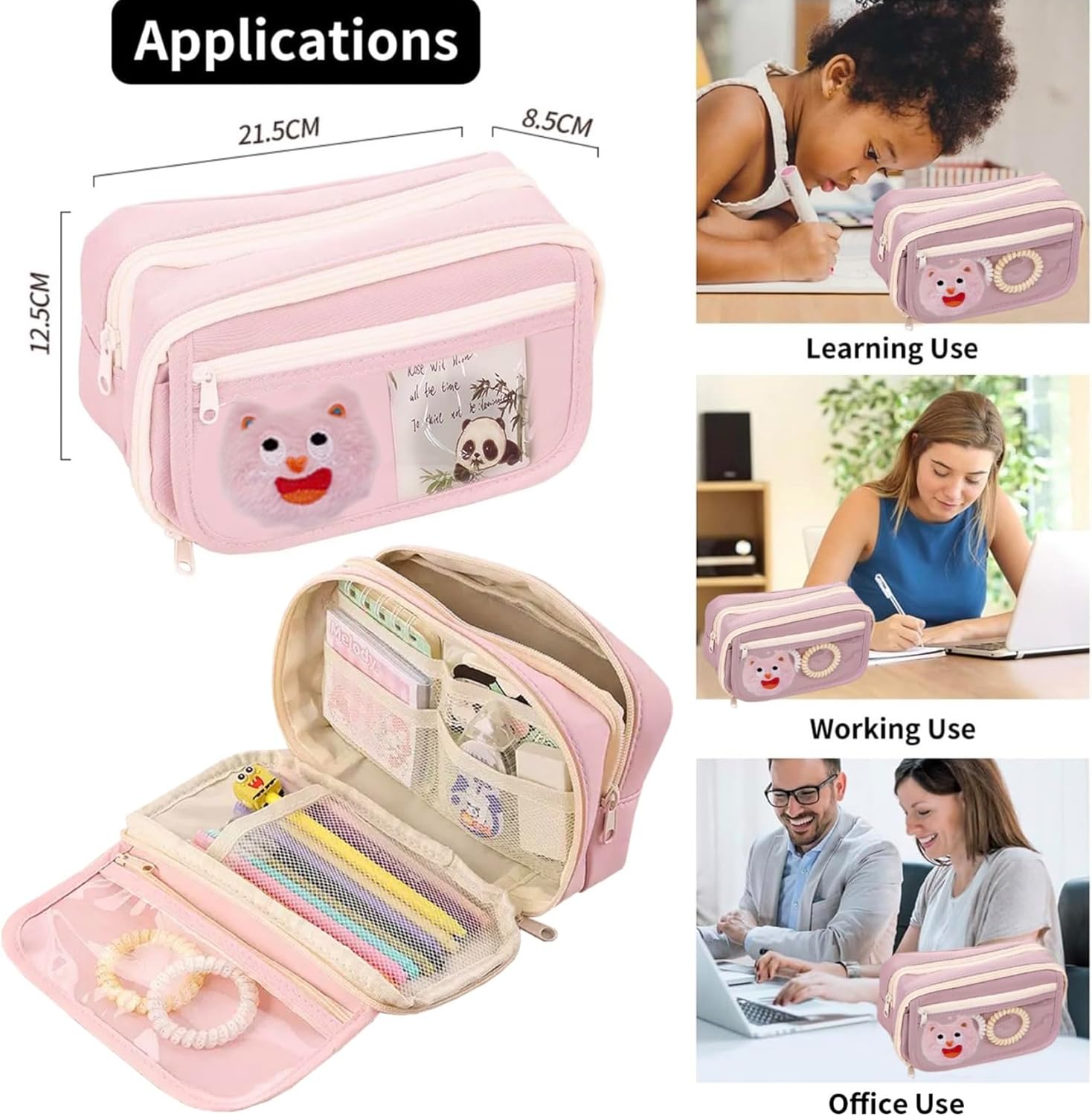 【TRANSPARENT POCKETS FOR DIY PLACEMENT】:The pen pouch has 9 pockets, including 1 transparent pocket with a panda doll. The transparent pocket can not only hold your favorite small objects, but also a memo or punch list to remind yourself of unfinished business. Improve study efficiency 【LARGE CAPACITY】: Holds up to 100 pens and measures 21.5cm x 125cm x 8.5cm. The wide opening ensures easy viewing and quick access to your belongings. No more rummaging through cluttered bins - everything is within easy reach. 【EASY TO CARRY】:Students can effortlessly take it to school, art class, or anywhere else, ensuring that their essential stationery is always with them. 【SOFT FABRIC】:Soft padded fabric is waterproof and durable. UNIQUE DESIGN: Students can use it to express their personal style and preferences. It is perfect for use in the classroom, traveling, study groups and even casual outings. 【QUALITY ASSURANCE】:Made of high quality materials, it fully meets your requirements. If you have any questions about our products, please contact us by email and we will solve your problem within 24 hours.