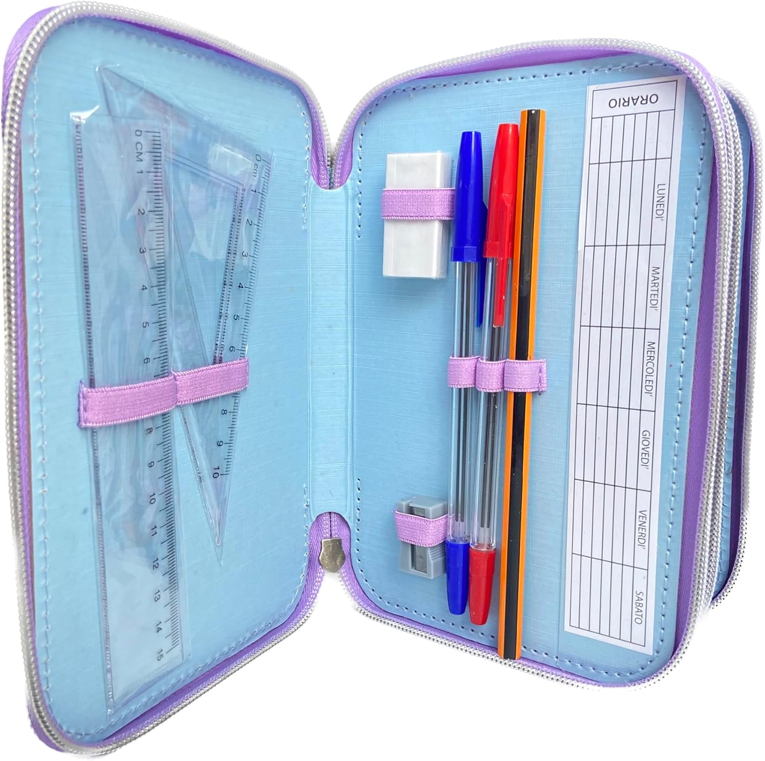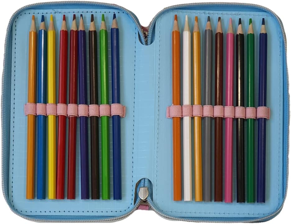 Astuccio ufficiale Disney: Il prodotto è distribuito con licenza originale Disney Perfetto per elementari: questo astuccio personalizzato è ideale per organizzare il materiale scolastico, la cancelleria e il materiale di scrittura e di disegno, dotato di 3 ampi scomparti con chiusura a zip, portapenne, portamatite, scompartimenti per gomme, righelli, temperino ed altro Contenuto: 18 pennarelli Giotto/Carioca, 18 matite colorate, 1 matita, 1 gomma, 1 righello, 1 squadra, temperamatite, penna rossa e penna blu, 1 tabella orario scolastico. Prodotto completo ideale per la cancelleria di bambine e bambini Prodotto di qualità: l'astuccio è realizzato in materiale resistente e di alta qualità che lo rende resistente all'usura e alle intemperie Dimensioni: 20x13x6 cm, 520 g