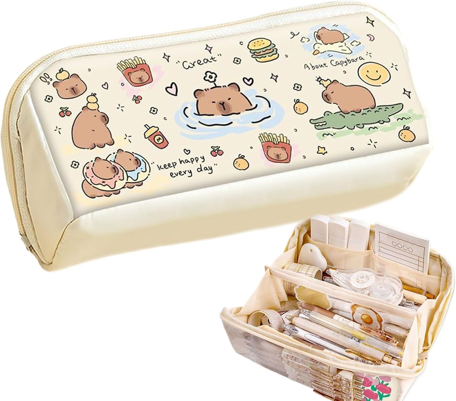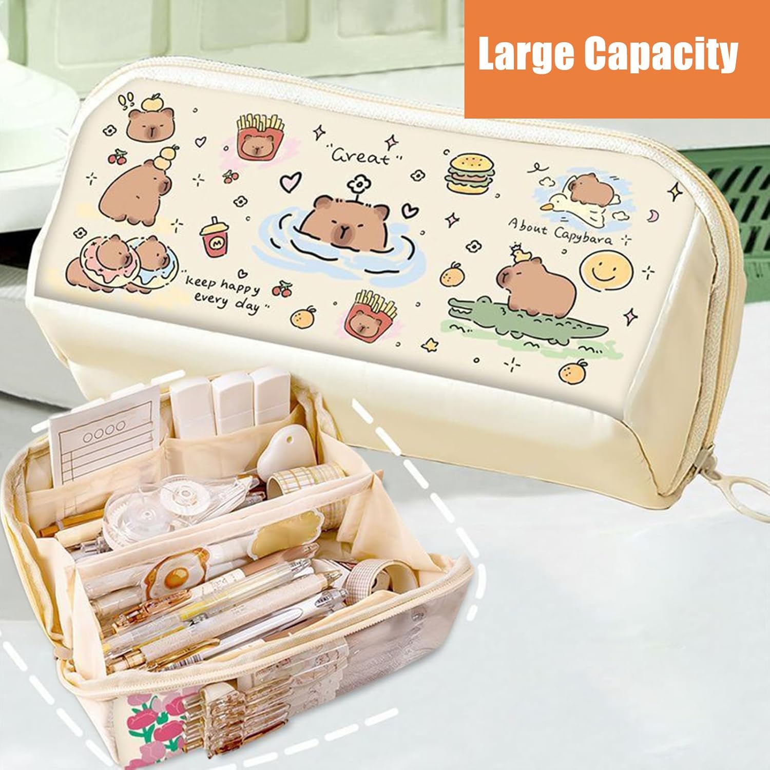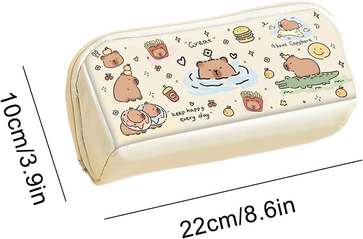 Impermeabile e resistente allo sporco: questo astuccio convince con un robusto design in pelle e cuciture precise per una protezione affidabile contro acqua e sporco per un uso prolungato e un aspetto elegante Layout salvaspazio: il design ben studiato a doppio scomparto garantisce un'organizzazione efficiente della cancelleria per la scuola e l'arte. Consente agli studenti di accedere rapidamente ai propri oggetti mantenendo sempre in ordine i propri oggetti. Durata quotidiana: materiale di alta qualità con laminazione antigraffio che mantiene la freschezza del design e resiste alle sollecitazioni meccaniche causate da penne o oggetti pesanti sulla scrivania Affascinante compagno di apprendimento: l'astuccio con stampe fantasiose capybara e caratteristiche facciali uniche unisce la praticità dell'organizzazione della scrivania con un ambiente rilassante e un design giovanile, ideale per l'uso quotidiano Facile da trasportare: dimensioni ergonomiche per una mobilità fluida durante il pendolarismo, come compagno affidabile per trasportare facilmente gli utensili grazie alla custodia compatibile con tasche laterali e zaino
