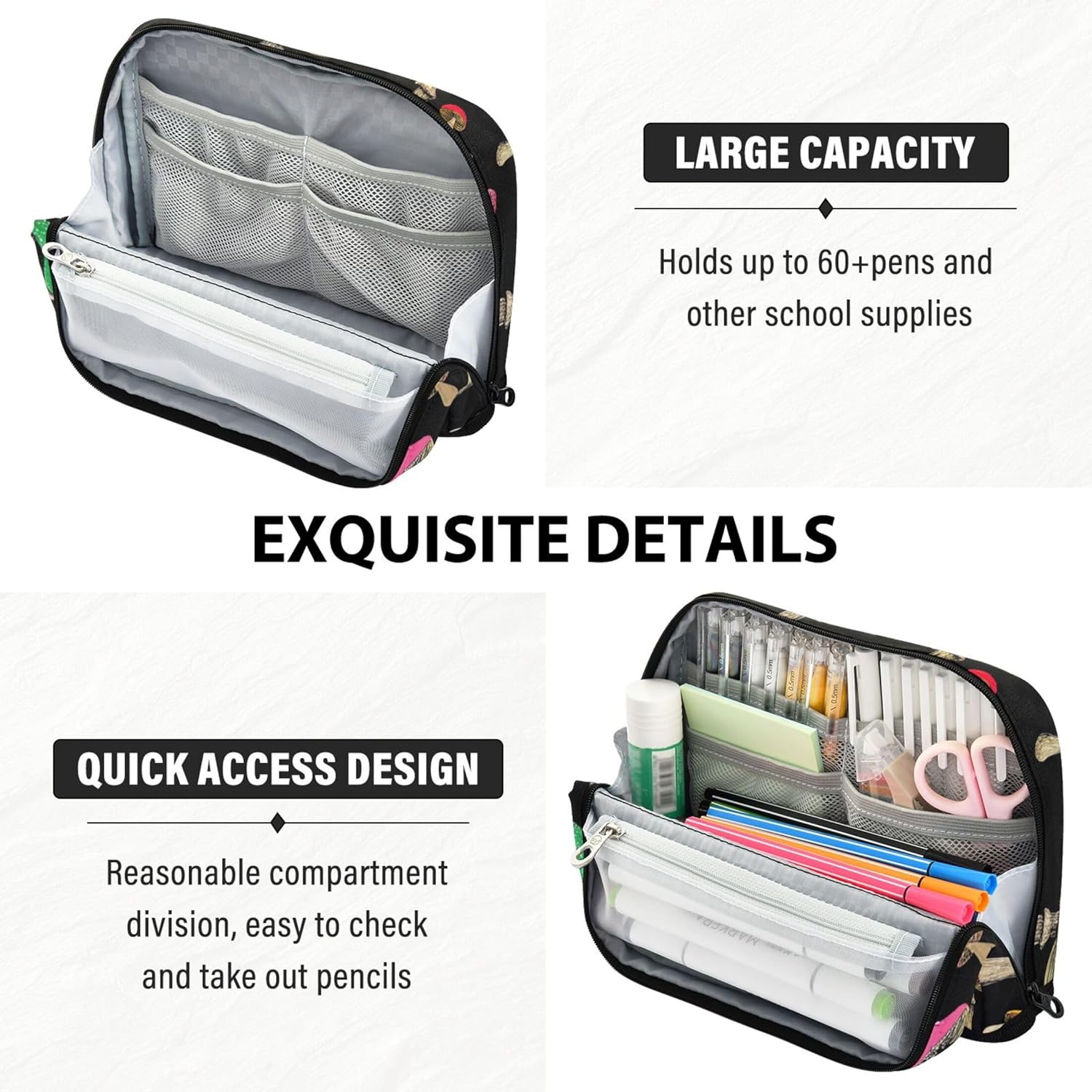 Funzionalità versatile in piedi: la matita kawaii si apre piatta e si ripiega in modo sicuro per creare un contenitore autoportante, mescolando portabilità con comodità sulla scrivania Struttura protettiva e pratica: realizzata in nylon resistente, la custodia per l'organizzazione della classe è progettata per resistere ai danni, rendendola ideale per viaggi, scuola o spostamenti quotidiani Spazio interno organizzato: l'astuccio per matite e trucchi offre ampio spazio con più sezioni per contenere penne, gomme, foglietti adesivi, temperamatite e altri oggetti essenziali da scrivania in un unico posto Multiuso: la custodia per il trucco con cerniera funziona come astuccio per penne, astuccio per il trucco, kit da viaggio o organizer per ufficio, ideale per scuola, lavoro, gite e uso quotidiano Opzione regalo personalizzata: disponibile in stampe vivaci con testo personalizzabile o design fotografico, astuccio carino è un regalo unico per bambini, artisti o viaggiatori
