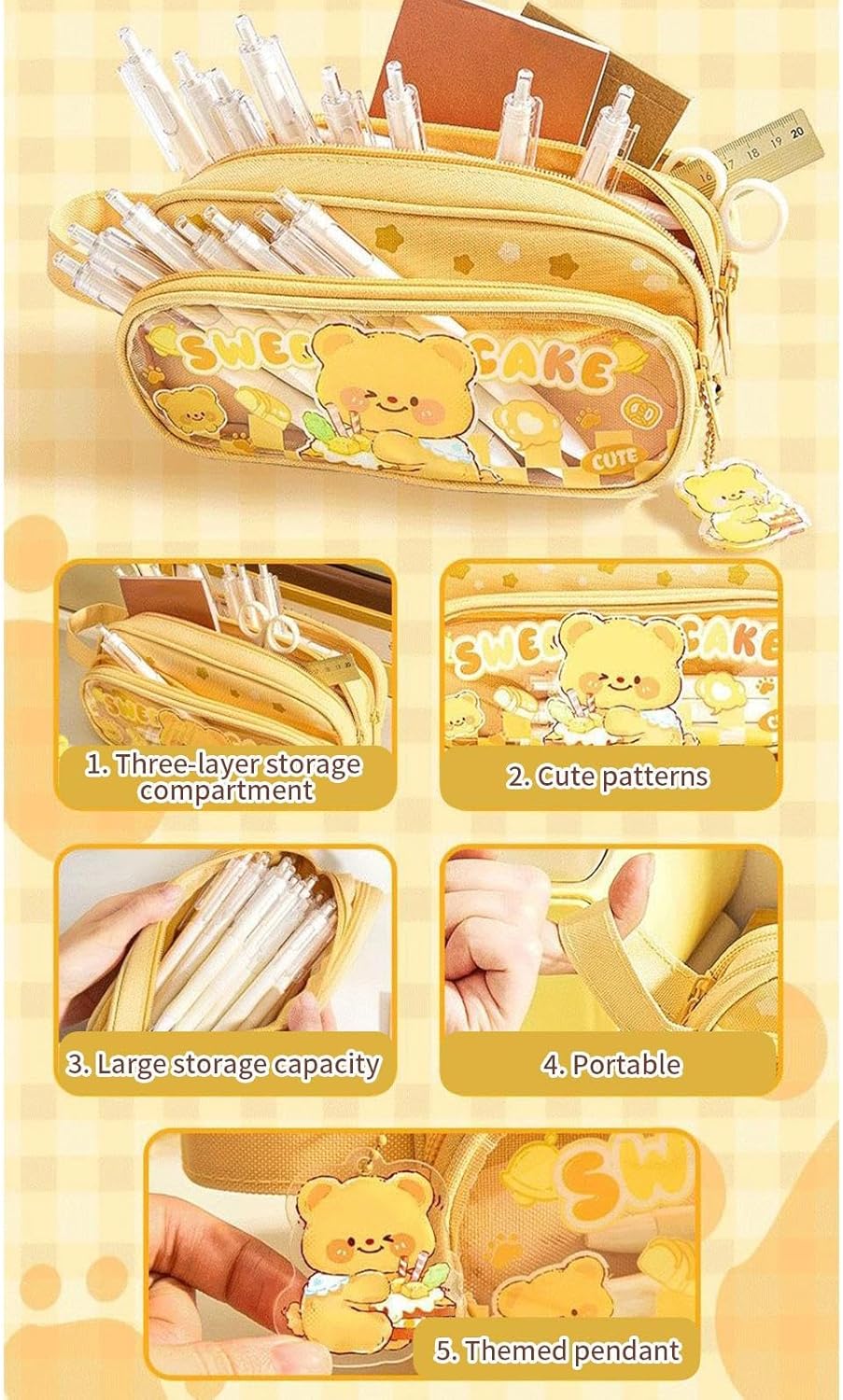 Design per Bambini: Presenta una calda tavolozza cromatica e adorabili illustrazioni di capibara e , portando gioia nelle attività quotidiane grazie a un design coinvolgente che favorisce l'uso costante da parte dei bambini. Sicurezza Durevole: La costruzione resistente e di sostanze odorose garantisce protezione durante l'uso scolastico quotidiano, assicurando affidabilità per studenti e bambini grazie ai materiali anti-usura di alta qualità Comodità di Trasporto: Combinazione di impugnatura intuitiva e manico portatile, assicura adattabilità ottimale per viaggi e utilizzo scolastico con funzionalità semplificate Capacità Ampia:Organizza fino a 100 penne su 3 livelli, mantenendo in ordine cancelleria, righelli e piccoli , contribuendo a migliorare concentrazione ed efficienza di apprendimento. Organizzazione Visibile: Finestra trasparente per accesso immediato agli oggetti essenziali unendo design elegante e funzionalità pratica riduce i tempi di ricerca e semplifica la routine quotidiana mantenendo tutto in ordine