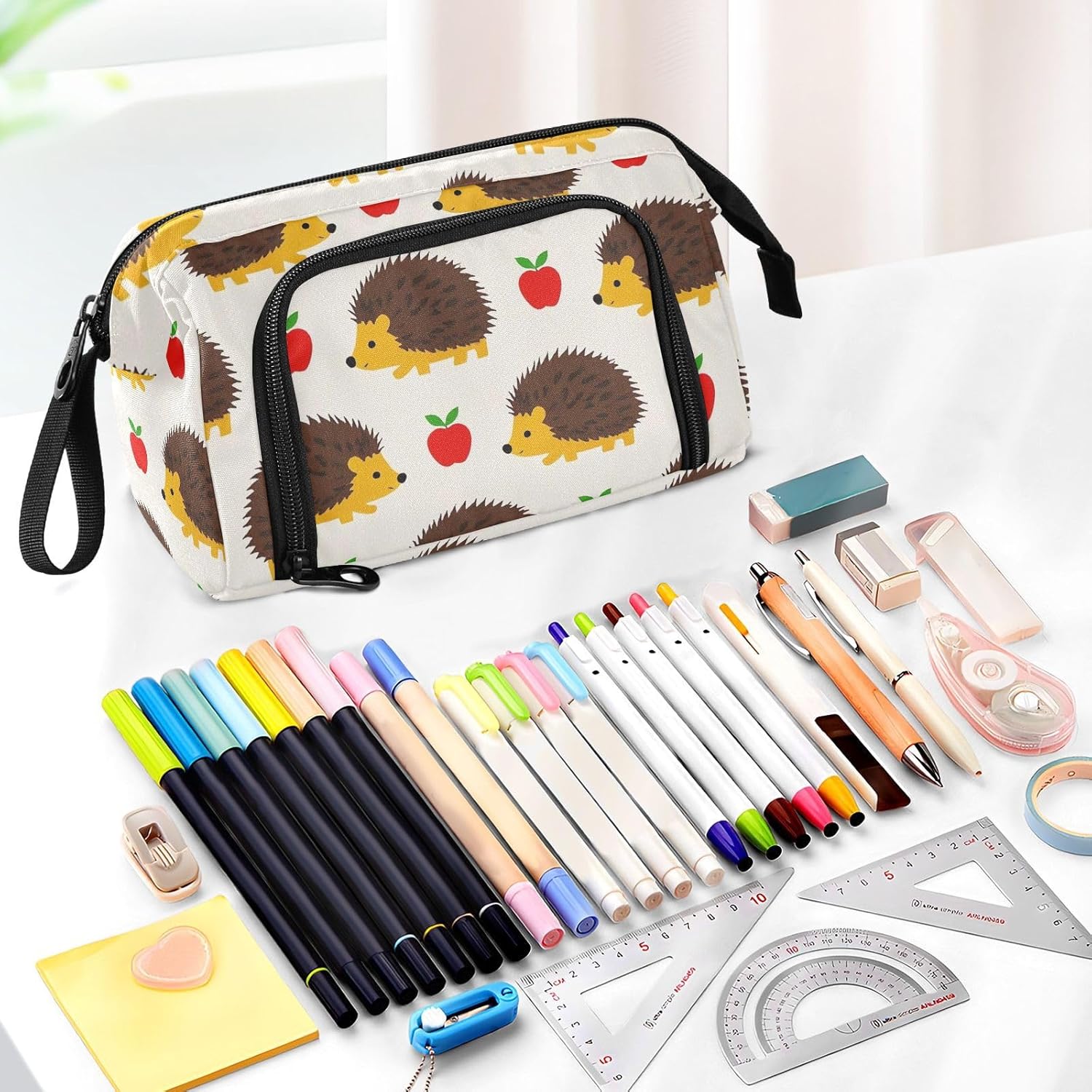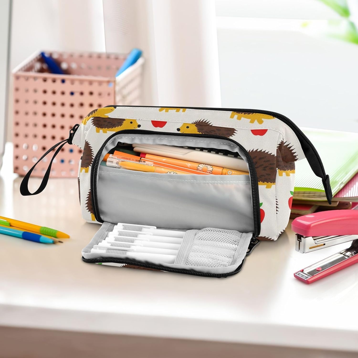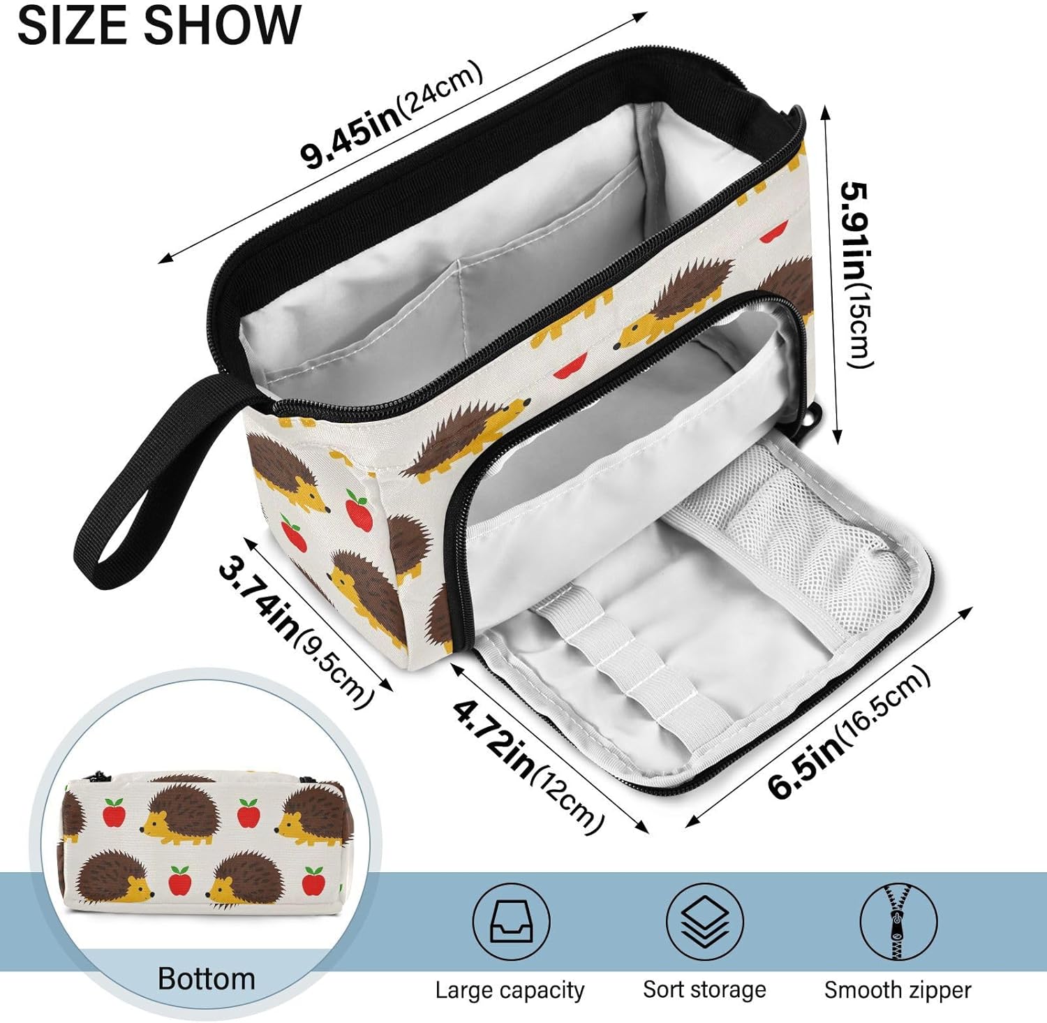 Materiale resistente: il nostro astuccio organizer è realizzato in nylon di alta qualità e cerniera liscia, che lo rende robusto, resistente all'usura, resistente ai graffi e facile da pulire. (Non adatto a bambini di età inferiore ai 3 anni!) Grande capacità: 24 x 9,5 x 15 cm. L'astuccio è dotato di una grande capacità. Il grande scomparto centrale consente di inserire almeno 40-60 penne e può ospitare altri oggetti di cancelleria come penne, appunti, forbici, nastro, gomme, righelli, temperamatite, ecc. Due tasche interne sono adatte per le tue piccole necessità che facili da perdere, come carte, chiavi, contanti, ecc. Design portatile e pratico: con funzionalità leggere e un'ampia fascia da tenere in mano, gli astucci possono essere messi nello zaino facilmente o tenuti in mano senza sforzo. L'apertura superiore e laterale aggiunge più comodità nella tua vita. Puoi controllare o prendere la tua cancelleria molto chiaramente dall'alto e raccogliere le tue matite preferite dagli slot fissi laterali. Scenario applicabile: l'astuccio non è solo un astuccio, ma può anche essere utilizzato per altri scopi. È adatto per occasioni come studio, ufficio, gite, viaggi, uscite e così via. Inoltre, può essere utilizzato come astuccio per penne, matite o pennelli, borsa per il trucco, ufficio personale e custodia per forniture scolastiche. Struttura lavabile: l'intero astuccio è lavabile. Si consiglia il lavaggio a mano, non è consentito il lavaggio in lavatrice. Non utilizzare candeggina per la pulizia.