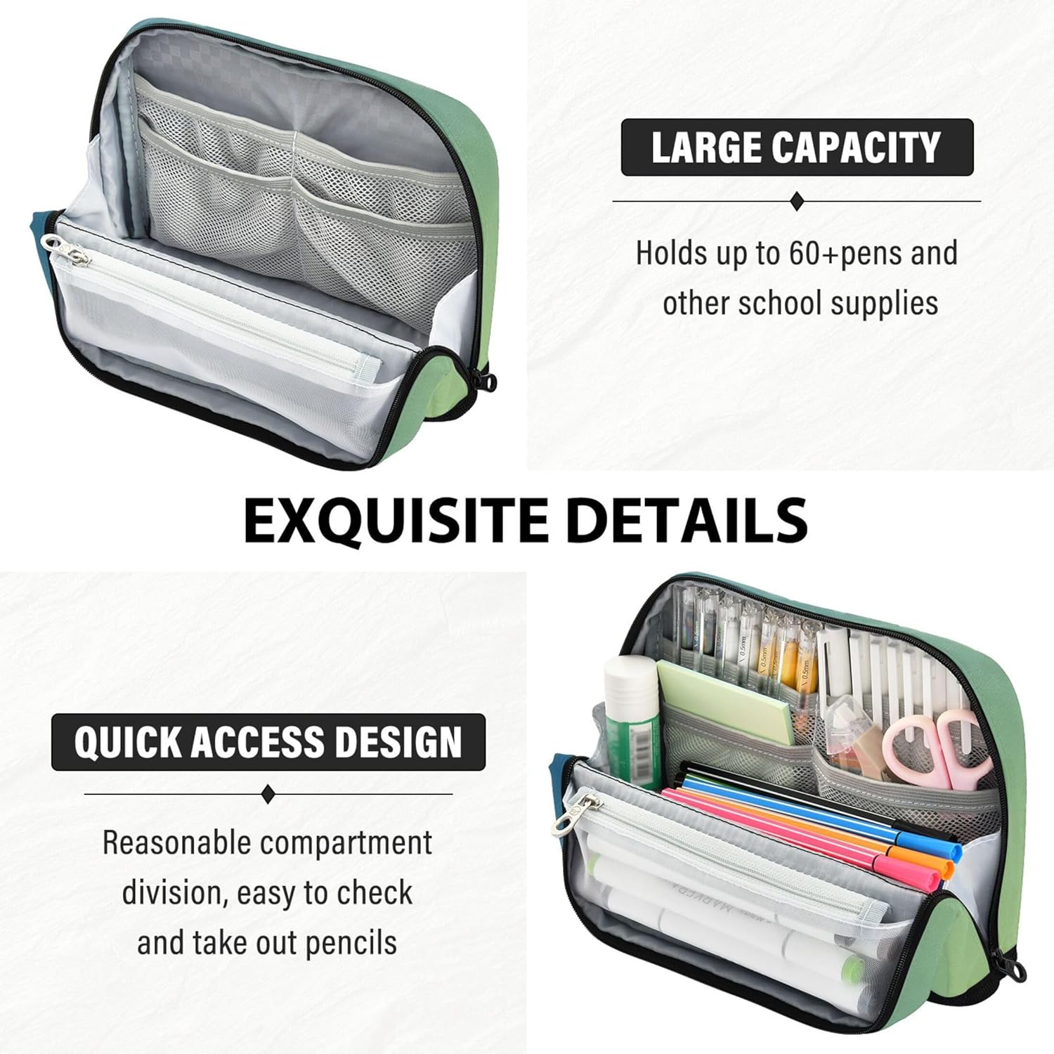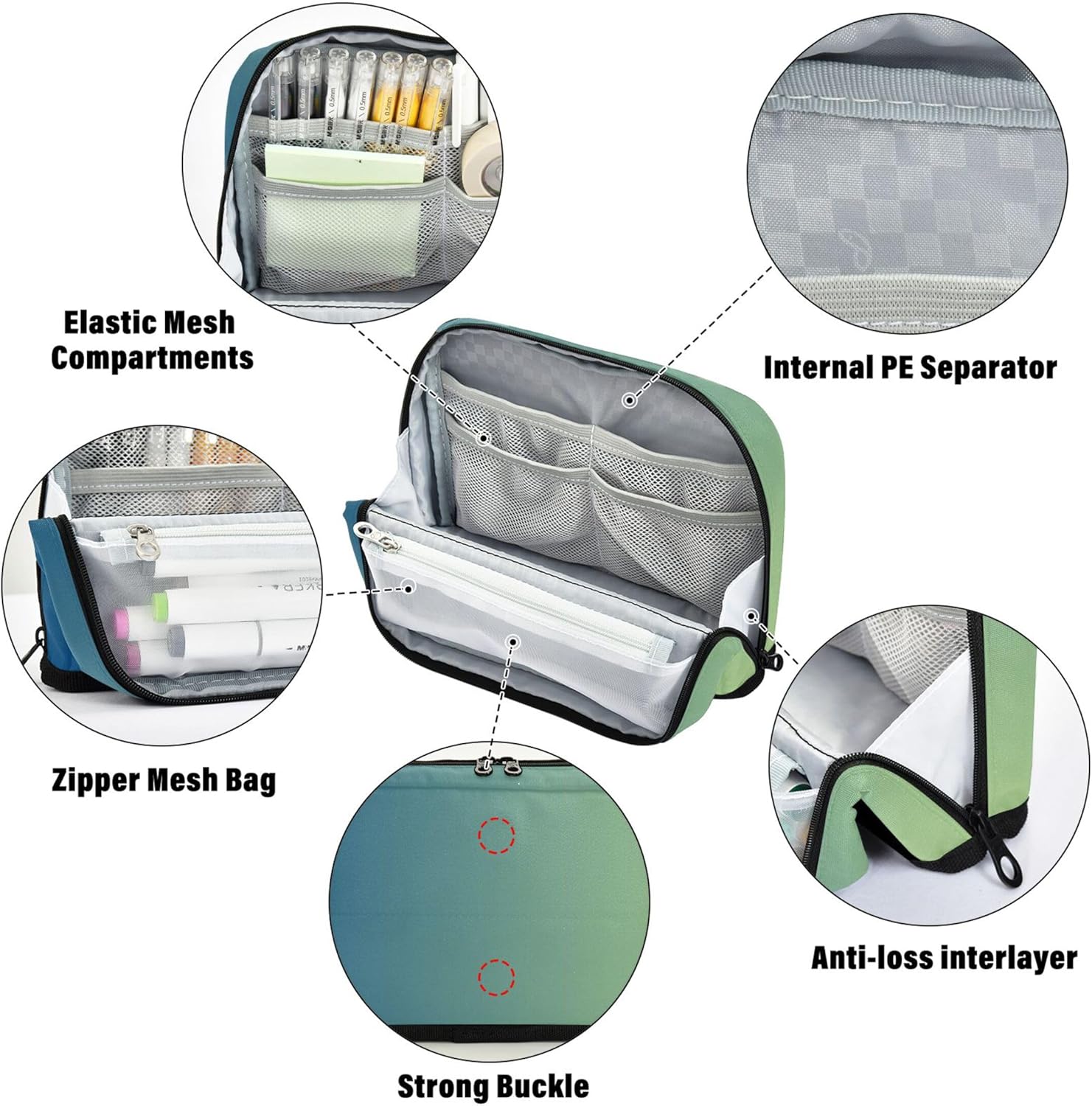 Struttura magnetica per una maggiore stabilità: grazie al suo esclusivo design pieghevole con bottoni a pressione sicuri, la borsa riutilizzabile per matite sta in piedi sulla scrivania e mantiene tutto ben visibile e accessibile Struttura in tessuto resistente: realizzato in nylon resistente, resistente ai graffi, respinge lo sporco e mantiene il suo aspetto elegante attraverso l'uso quotidiano e la manipolazione frequente Interni multiscomparti: con una spaziosa tasca principale, uno slot in rete con cerniera e una tasca extra, l'astuccio kawaii per la borsa mantiene penne, appunti e strumenti ordinatamente ordinati e a portata di mano Un sacchetto, molti scopi: le borse per matite per insegnanti si spostano facilmente tra una custodia per la scuola, un astuccio per il trucco o un porta attrezzi da viaggio, ideali per studenti, professionisti e creativi Facile da personalizzare: l'astuccio porta matite consente di aggiungere dettagli significativi come nomi o loghi, creando una custodia unica che funge anche da regalo elegante o dichiarazione personale