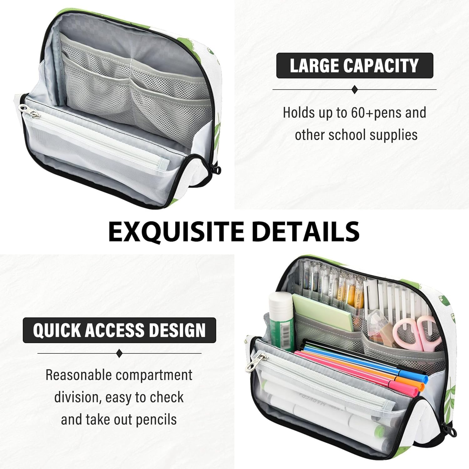 Soluzione intelligente per organizzare la scrivania: non c'è bisogno di scavare in giro: l'astuccio per penne e matite si alza saldamente quando è piegato, mostrando chiaramente il contenuto per un'organizzazione più facile e veloce Finitura in nylon di alta qualità: i sacchetti riutilizzabili combinano una consistenza morbida con un'elevata durata, resistendo all'usura preservando un aspetto lucido nel tempo Contiene più di quanto ti aspetti: nonostante la sua forma compatta, l'astuccio per ragazze si adatta a cancelleria come penne, matite, gomme e piccoli strumenti, grazie al suo design intelligente e multi-tasca Multiuso: le borse scolastiche con cerniera funzionano come astuccio, astuccio per trucchi, kit da viaggio o organizer per ufficio, ideali per scuola, lavoro, gite e uso quotidiano Opzione regalo personalizzata: disponibile in stampe vivaci con testo personalizzabile o design fotografico, il simpatico astuccio per bambini è un regalo unico per bambini, artisti o viaggiatori