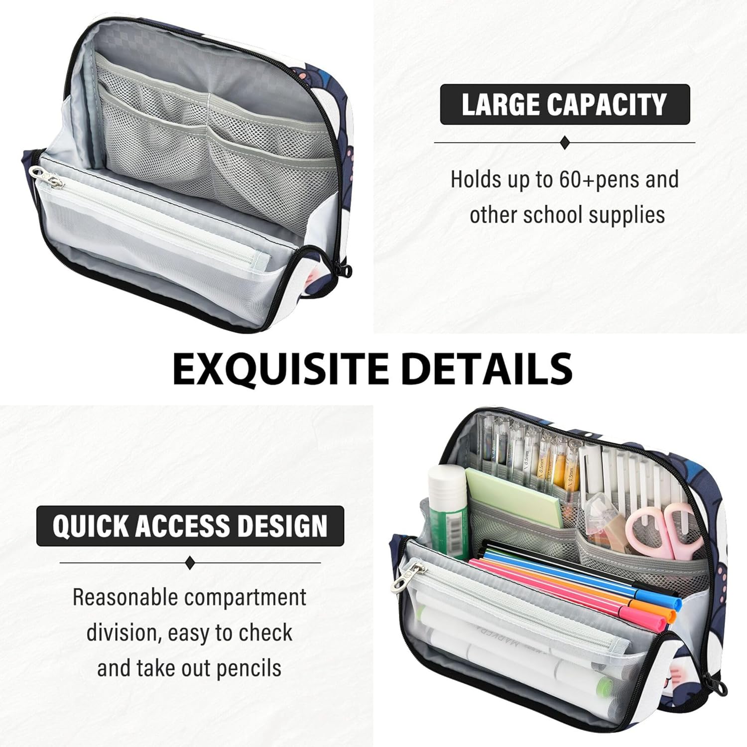 Soluzione intelligente per organizzare la scrivania: non c'è bisogno di scavare in giro: l'astuccio kawaii per bambini si alza saldamente quando è piegato, mostrando chiaramente il contenuto per un'organizzazione più rapida e più facile Selezione intelligente del tessuto: l'astuccio scolastico è realizzato in robusto nylon che offre flessibilità e protezione, garantendo che gli strumenti quotidiani rimangano al sicuro senza aggiungere ingombro Design versatile con scomparti: il grande astuccio carino ti aiuta a rimanere organizzato con un interno spazioso con aree distinte per tutti i tuoi articoli di cancelleria, strumenti o cosmetici Progettato per molteplici utilizzi: che tu stia andando a lezione o per un viaggio, l'astuccio da ufficio si adatta facilmente come astuccio per il trucco, astuccio per penne o organizer per la giornata lavorativa Ideale per occasioni speciali: il astuccio per matite offre un tocco personale con stampe vivaci e personalizzazione opzionale, ideale per laurea, compleanni o rientro a scuola