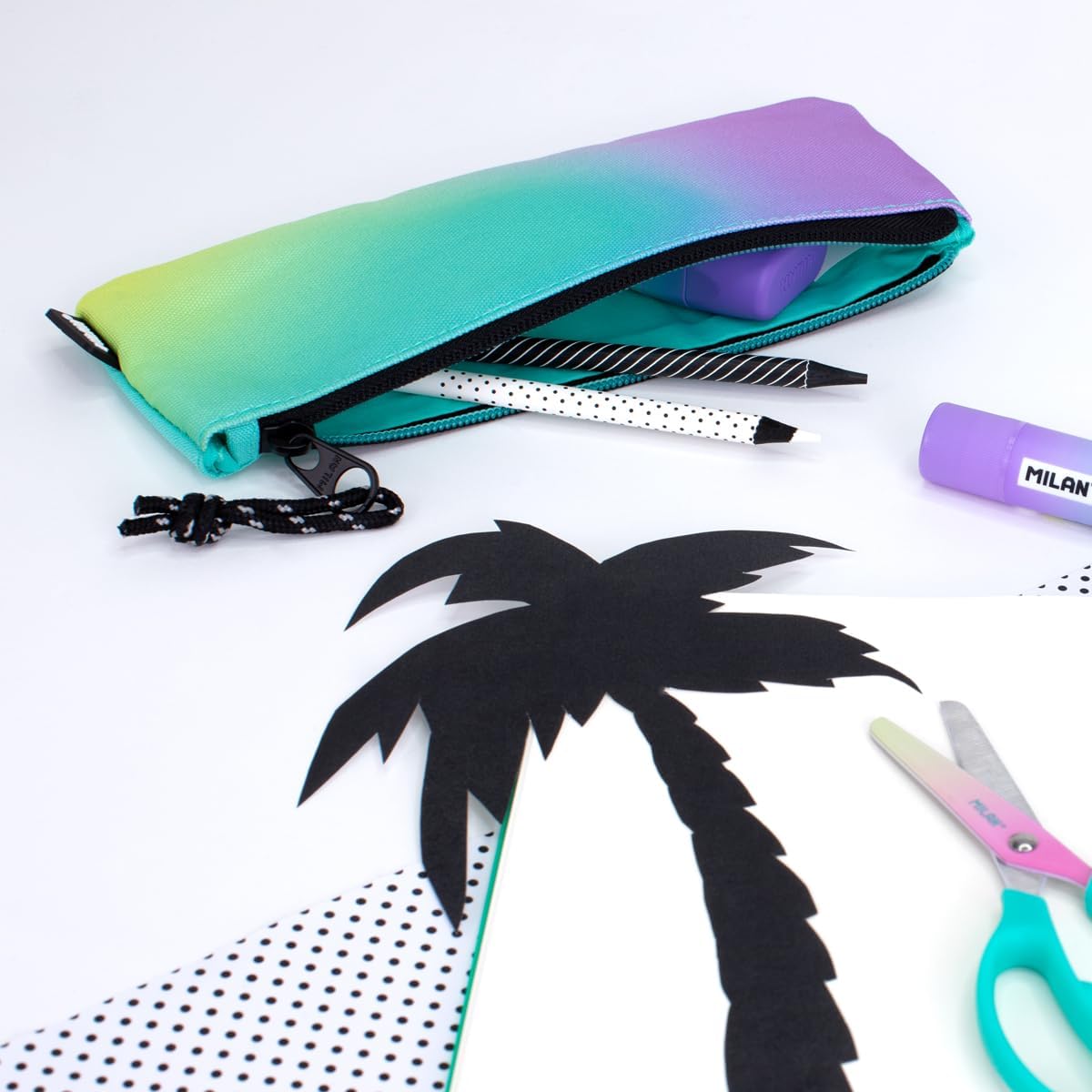 Astuccio piccolo piatto. Serie Sunset, colore verde. Una combinazione di colori sfumati ispirati al tramonto, accompagnati da dettagli in bianco e nero. Maniglie delle cerniere con corda. Tessuto esterno 'ripstop': leggero e resistente a strappi e strappi. Utilizza una tecnica speciale che intreccia fili di rinforzo spessi a intervalli regolari in un motivo incrociato. Composizione tessuto: esterno e fodera interna in poliestere. Dimensioni: 23 x 9 x 1,5 cm.