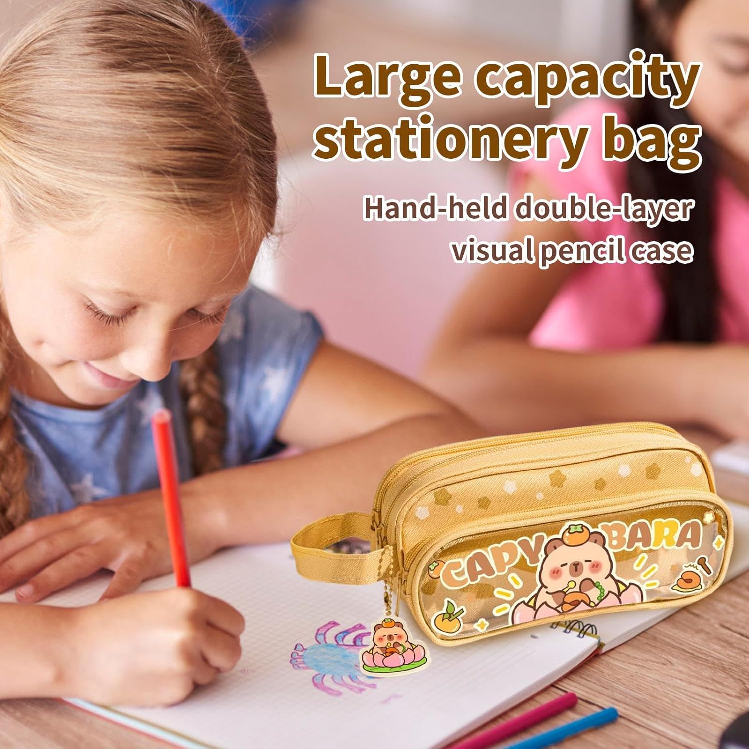 Estetica Cartone Animato: La deliziosa combinazione di toni caldi e disegni teneri di capibara e orsi crea un ambiente di studio allegro, assicurando che i bambini siano attratti dall'utilizzo quotidiano per scuola e compiti. Performance Continua: L'attenzione alla resilienza e alla sicurezza infantile permette a questo astuccio di resistere stress quotidiano, mantenendo caratteristiche originali senza emissioni di odori per anni di servizio Ideale per la Scuola: Realizzato con materiali piacevoli al , caratterizzato da design facile da trasportare e manico ergonomico, essenziale per bisogni quotidiani in classe Design Organizzato:Archivia ordinatamente fino a 100 penne su tre livelli, organizzando cancelleria e accessori piccoli come righelli per migliorare la produttività. Organizzazione Visibile: Finestra trasparente per accesso immediato agli oggetti essenziali unendo design elegante e funzionalità pratica riduce i tempi di ricerca e semplifica la routine quotidiana mantenendo tutto in ordine