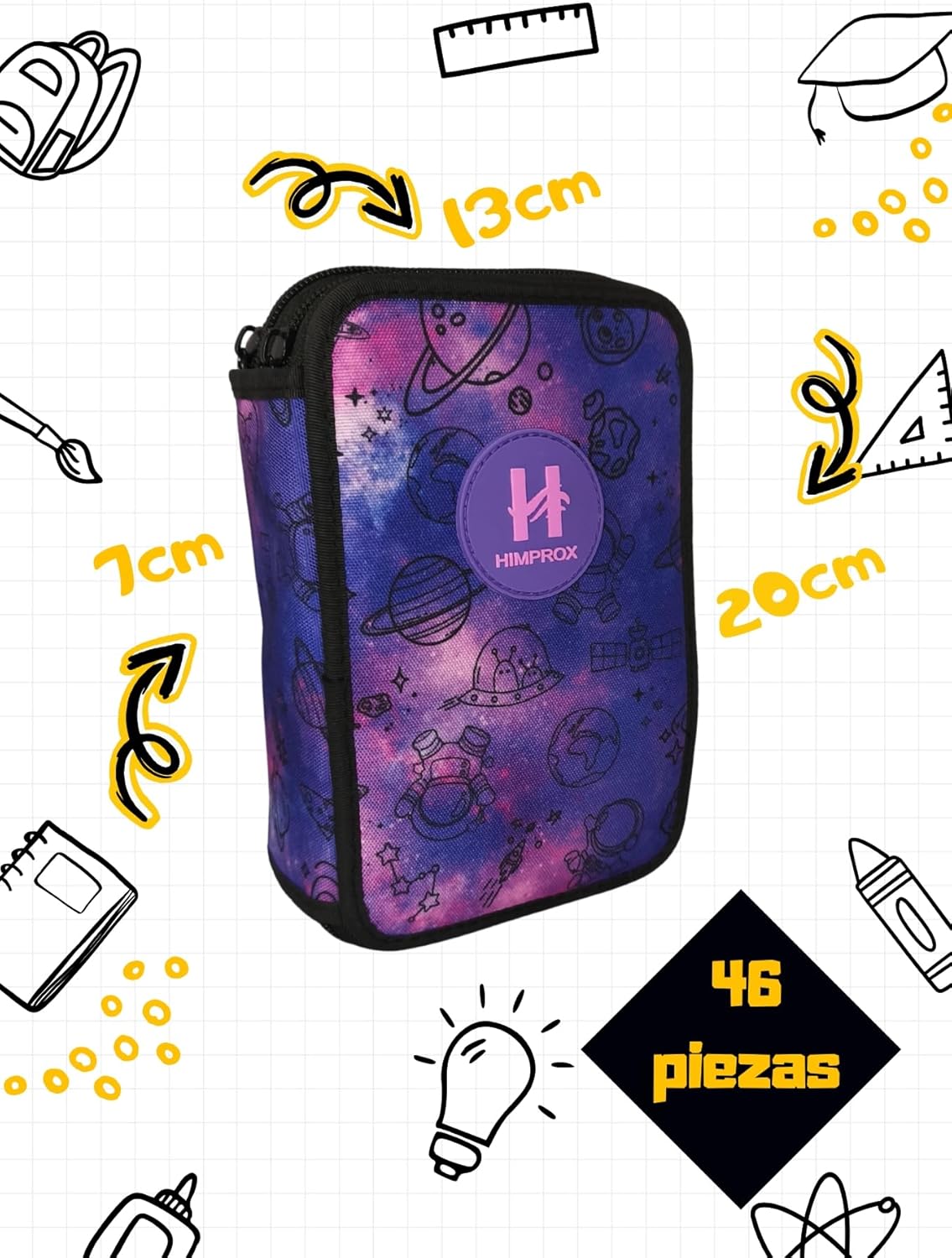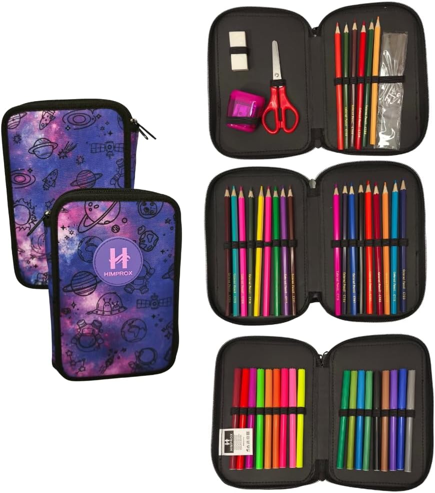 DESIGN SPAZIALE: Custodia con attraente design galassia e pianeti, perfetta per gli studenti che amano lo spazio e cercano uno stile unico TRIPLE ORGANIZZAZIONE: Tre scomparti indipendenti con cerniera per un'organizzazione ottimale del materiale scolastico KIT COMPLETO: include 46 pezzi di materiale scolastico essenziale, tra cui matite colorate, pennarelli e accessori di base Conservazione pratica: fasce elastiche interne che mantengono gli articoli scolastici al sicuro e in ordine in ogni scomparto PORTABILITÀ: dimensioni compatte e design resistente con cerniere di qualità per un trasporto sicuro e durevole Impermeabile: impermeabile, facile da pulire.
