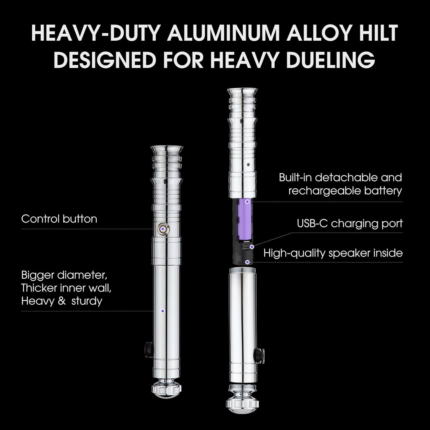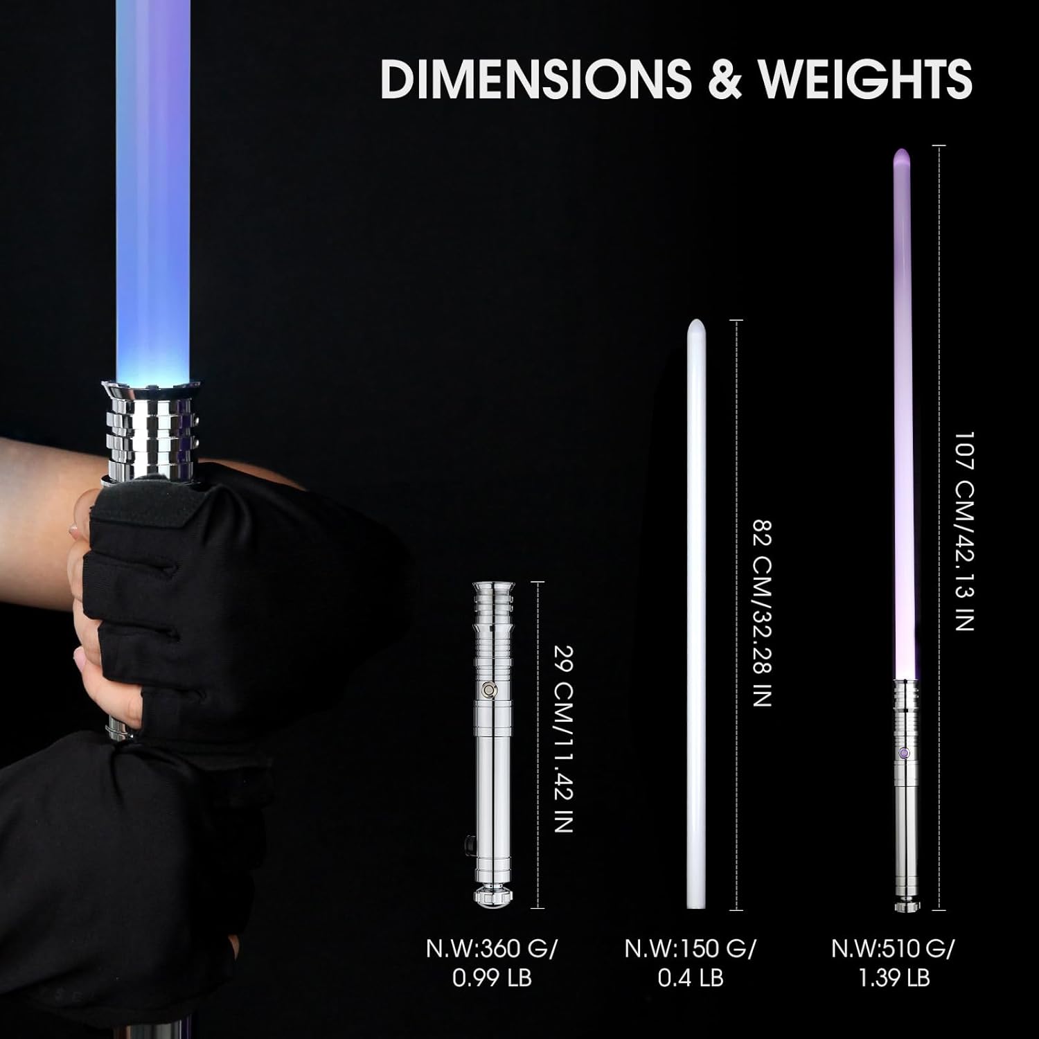 【Nuove funzioni di controllo del movimento】Questa sciabola da duello è una spada laser intelligente di alto livello con 2 tipi di controllo del movimento, tra cui rotazione e pugnalata e tiro. La funzione di controllo del movimento può essere disattivata se si preferisce il controllo tramite pulsanti. Con la funzione di controllo del movimento, è possibile accendere/spegnere l'illuminazione della lama, passare da un carattere sonoro all'altro e cambiare i colori dell'illuminazione della lama. 【Effetti sonori ed effetti luminosi】Questa spada laser da duello è dotata di 16 suoni per i personaggi dei film, 12 colori RGB per l'illuminazione della lama, 4 effetti lama (Fantasma/Stabile/Blaster/Impulso), 3 impostazioni di volume (Alto, Basso, Muto). I suoi sensibili effetti Smooth Swing/Flash-on-Clash/Lock-up/Blaster simulano le scene di duello di oscillazioni e scontri dei film, offrendoti un'esperienza di combattimento vivida e realistica. 【Robusta impugnatura in alluminio e lama spessa in policarbonato】Questa spada laser per duelli è dotata di un'impugnatura robusta in alluminio e pesa circa 360 g, più pesante e robusta della maggior parte delle spade laser. Questa spada laser RGB è dotata di una lama spessa e ad alto impatto da 82 cm/32 pollici in policarbonato, che la rende resistente ai colpi, difficile da piegare o rompere e ideale per duelli davvero impegnativi. 【Supporto espositivo incluso】Un supporto in acrilico per la spada laser realistica è incluso nella confezione. Il supporto per spada laser da combattimento è realizzato in acrilico trasparente di alta qualità ed è molto spesso e robusto. Posiziona la spada laser sul supporto e lasciala appoggiata sulla scrivania, così potrai comodamente estrarre la pesante spada laser da duello per divertirti e riporla per ricaricare la batteria dopo il duello. 【Garanzia e assistenza】È necessario utilizzare il cavo incluso con un caricabatterie USB da 5 V 1 A o un caricabatterie da parete da 5 V. Il mancato rispetto di queste istruzioni può comportare un rischio di incendio o danni ai dispositivi elettronici. La spada laser e tutti i suoi accessori sono coperti dalla nostra garanzia di 24 mesi. Non esitate a contattare il nostro servizio clienti professionale per una soluzione rapida e soddisfacente.
