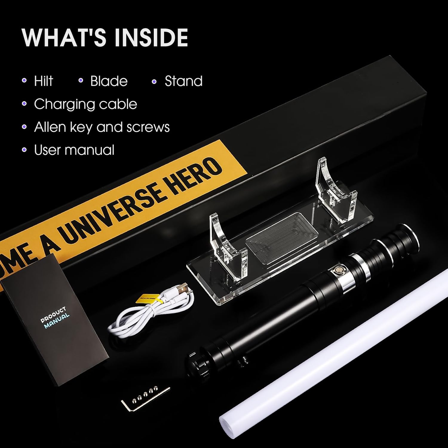 【Nuove funzioni di controllo del movimento】Questa sciabola da duello è una spada laser intelligente di alto livello con 2 tipi di controllo del movimento, tra cui rotazione e pugnalata e tiro. La funzione di controllo del movimento può essere disattivata se si preferisce il controllo tramite pulsanti. Con la funzione di controllo del movimento, è possibile accendere/spegnere l'illuminazione della lama, passare da un carattere sonoro all'altro e cambiare i colori dell'illuminazione della lama. 【Effetti sonori ed effetti luminosi】Questa spada laser da duello è dotata di 16 suoni per i personaggi dei film, 12 colori RGB per l'illuminazione della lama, 4 effetti lama (Fantasma/Stabile/Blaster/Impulso), 3 impostazioni di volume (Alto, Basso, Muto). I suoi sensibili effetti Smooth Swing/Flash-on-Clash/Lock-up/Blaster simulano le scene di duello di oscillazioni e scontri dei film, offrendoti un'esperienza di combattimento vivida e realistica. 【Robusta impugnatura in alluminio e lama spessa in policarbonato】Questa spada laser per duelli è dotata di un'impugnatura robusta in alluminio e pesa circa 360 g, più pesante e robusta della maggior parte delle spade laser. Questa spada laser RGB è dotata di una lama spessa e ad alto impatto da 82 cm/32 pollici in policarbonato, che la rende resistente ai colpi, difficile da piegare o rompere e ideale per duelli davvero impegnativi. 【Supporto espositivo incluso】Un supporto in acrilico per la spada laser realistica è incluso nella confezione. Il supporto per spada laser da combattimento è realizzato in acrilico trasparente di alta qualità ed è molto spesso e robusto. Posiziona la spada laser sul supporto e lasciala appoggiata sulla scrivania, così potrai comodamente estrarre la pesante spada laser da duello per divertirti e riporla per ricaricare la batteria dopo il duello. 【Garanzia e assistenza】È necessario utilizzare il cavo incluso con un caricabatterie USB da 5 V 1 A o un caricabatterie da parete da 5 V. Il mancato rispetto di queste istruzioni può comportare un rischio di incendio o danni ai dispositivi elettronici. La spada laser e tutti i suoi accessori sono coperti dalla nostra garanzia di 24 mesi. Non esitate a contattare il nostro servizio clienti professionale per una soluzione rapida e soddisfacente.