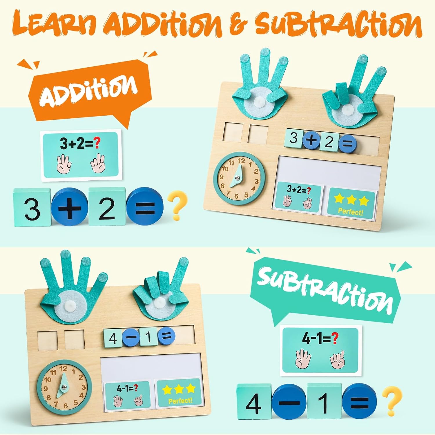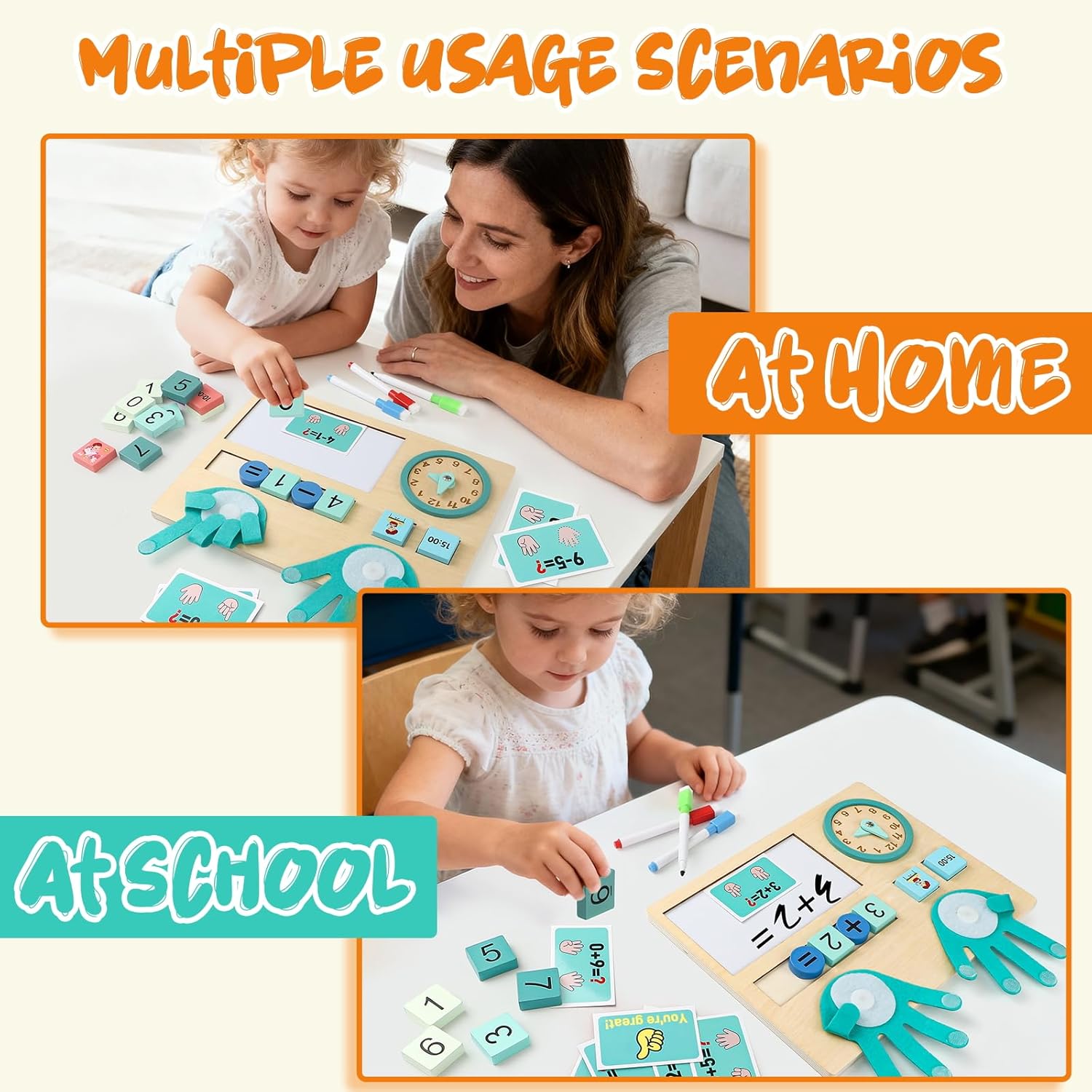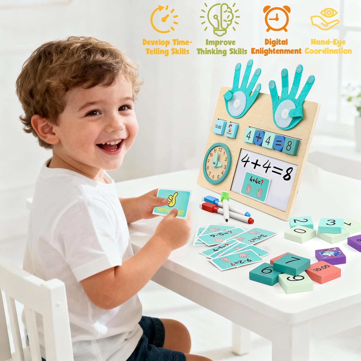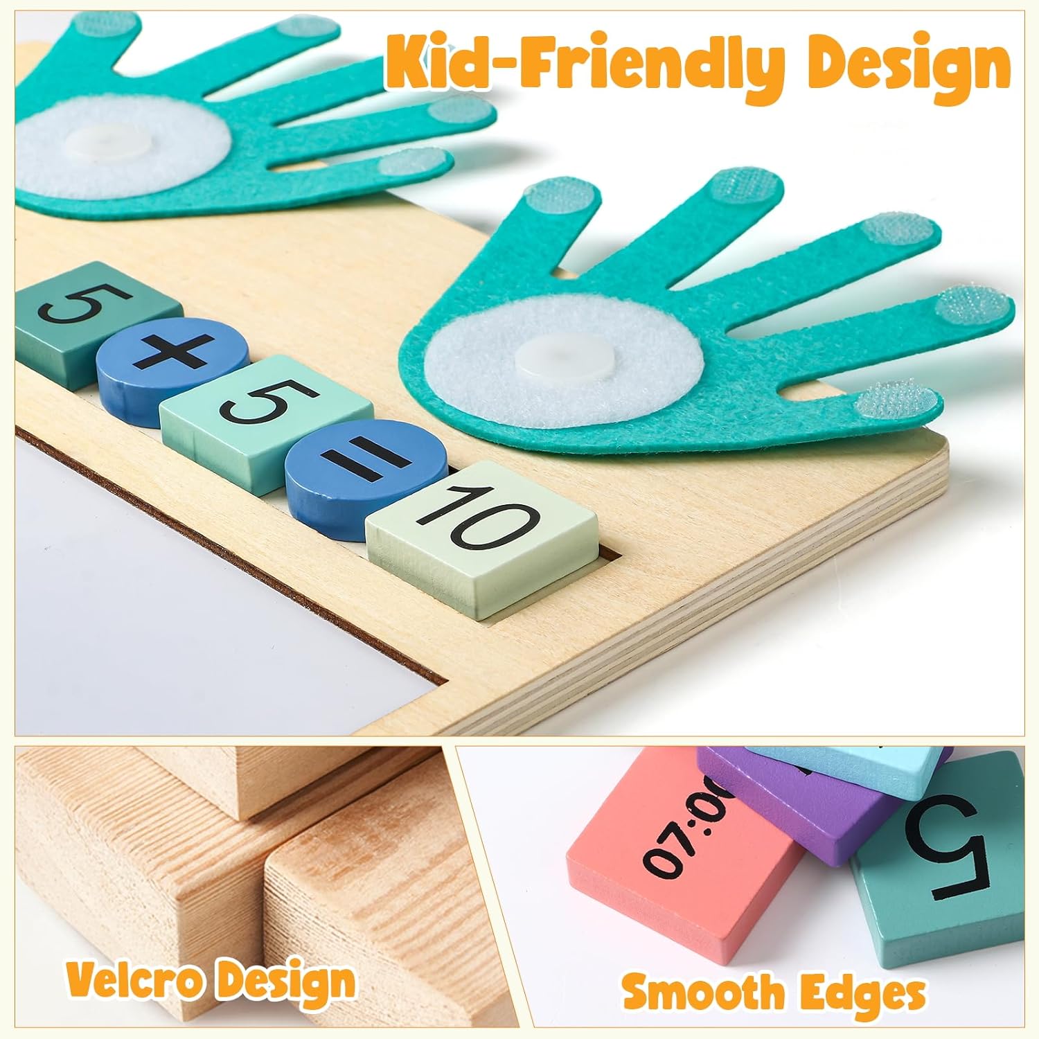 Giocattolo Educativo di Matematica: Questo gioco matematico è composto da una tavola in legno, due mani in feltro, un orologio in legno separato, 11 blocchi numerici (0-10), 3 blocchi del tempo, 3 blocchi per attività, carte per esercizi di addizione e sottrazione e 3 pennarelli cancellabili. Perfetto per aiutare i bambini a imparare il conteggio, l’addizione, la sottrazione e a familiarizzare con il concetto del tempo in modo divertente. Giochi Montessori per l’Apprendimento dei Numeri: Questo gioco Montessori, realizzato in legno di alta qualità, è accuratamente levigato con superfici lisce e bordi arrotondati per garantire la sicurezza dei bambini. I colori vivaci e i simboli chiari attirano l’attenzione dei bambini e li motivano ad imparare i numeri in modo coinvolgente, rendendolo uno dei migliori giochi educativi per i più piccoli. Supporto all’Apprendimento con Mani in Feltro: Le due mani in feltro sulla tavola permettono ai bambini di rappresentare i numeri con le dita, facilitando così l’apprendimento del conteggio. Questo design rende i numeri e le quantità più tangibili e aiuta allo stesso tempo a sviluppare la motricità fine, la coordinazione occhio-mano e la destrezza manuale. Imparare il Tempo in Modo Semplice: Con l’orologio in legno incluso, i bambini possono esplorare le basi dell’apprendimento dell’orario in maniera giocosa. Spostando le lancette, possono comprendere ore e minuti, integrando perfettamente gli altri giochi educativi inclusi nel set. Perfetto per Giochi Prescolari: Questo gioco Montessori è un eccellente strumento educativo per bambini a partire dai 3 anni. Combina divertimento e apprendimento, stimola il pensiero logico e le capacità di problem-solving. Ideale per compleanni, Natale, giochi prescolari o come strumento per l’apprendimento, è un regalo perfetto per bambine e bambini che desiderano esplorare i numeri e imparare l’orario in modo creativo.