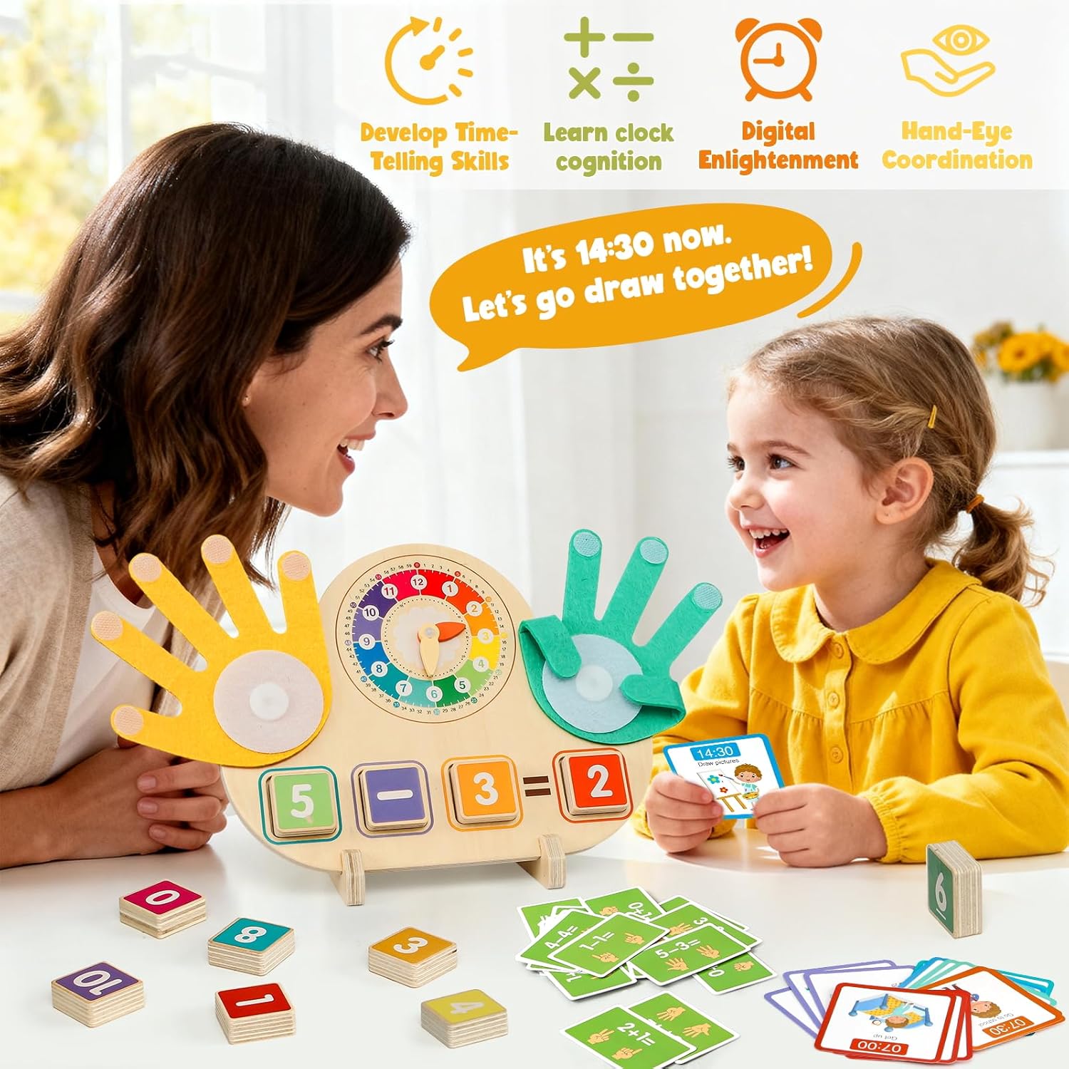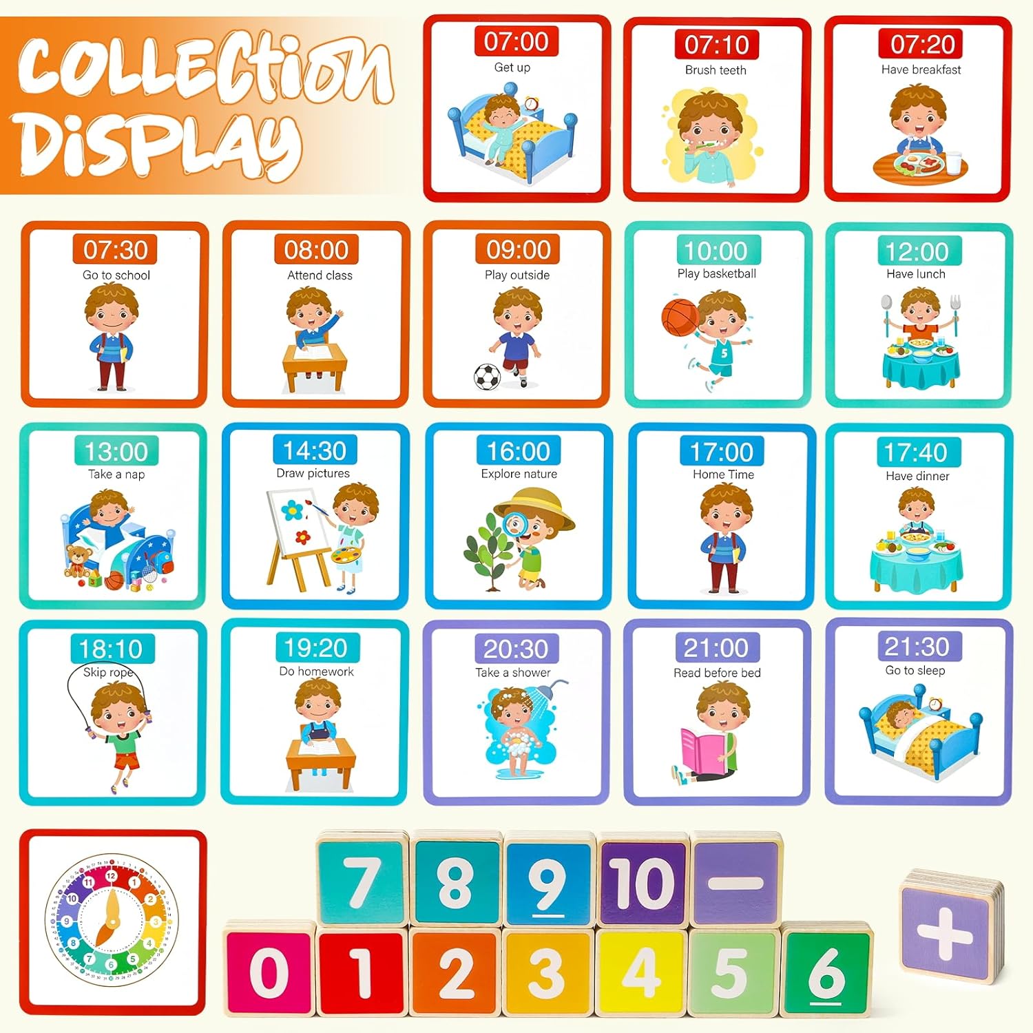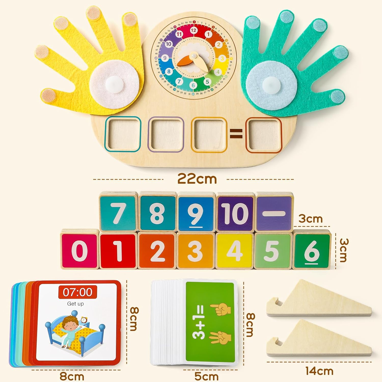 Set di Gioco in Legno per l'apprendimento dei Bambini - Questo giocattolo didattico Montessori include strisce di velcro per contare con le dita, un orologio, 10 blocchi numerici, carte colorate per contare i numeri e carte relative al tempo che mostrano le attività quotidiane insieme ai quadranti dell'orologio corrispondenti. Questo versatile set di giocattoli in legno è adatto dai 3 anni in su. Esplora i primi concetti matematici e temporali e sviluppa il pensiero logico. Design Unico dell'orologio - Le lancette didattiche integrate si muovono, permettendo ai bambini di sviluppare il senso del tempo in modo giocoso. Imparano e comprendono come le attività quotidiane siano collegate al tempo. Le lancette possono anche essere adattate alle carte a tema, consentendo ai bambini di immaginare e discutere diverse attività in momenti diversi. Preparati per la scuola materna e la scuola primaria. Aritmetica Matematica Coinvolgente - Puntatore in feltro con chiusura in velcro è facilmente regolabile da 1 a 10. I bambini possono sentire ed esplorare i numeri, imparando a contare: ideale per l'apprendimento visivo e tattile. I blocchi di legno colorati sono perfetti per riconoscere e ordinare i numeri, oltre che per esercitarsi con addizioni e sottrazioni di base. I bambini possono usare i blocchi numerici per calcolare e determinare il risultato. Giocoso & Educativo - Questo giocattolo in legno, realizzato in legno liscio e robusto, è abbastanza robusto da resistere a un uso intenso. Le capacità motorie fini e la coordinazione occhio-mano vengono sviluppate afferrando i mattoncini, muovendo le lancette dell'orologio e regolando i cartellini, aiutando a strutturare le attività quotidiane e promuovendo una migliore comprensione del tempo e delle routine: un passo importante verso l'indipendenza. Giocattolo Perfetto per Bambini dai 3 anni - Cerchi un regalo divertente ed educativo? Questo giocattolo Montessori in legno è perfetto per compleanni, Natale, Pasqua, festività o come sorpresa per bambini dai 3 ai 9 anni. Sviluppa le capacità numeriche e il pensiero logico dei bambini. È un divertente giocattolo educativo per le attività della scuola materna o prescolare.