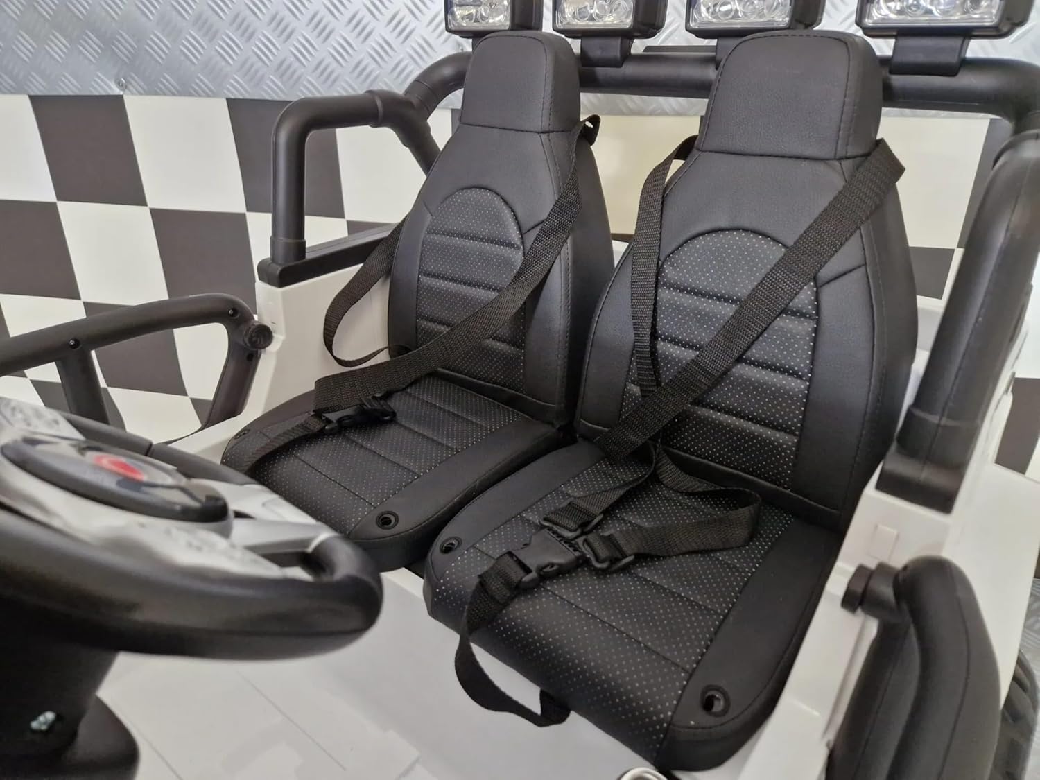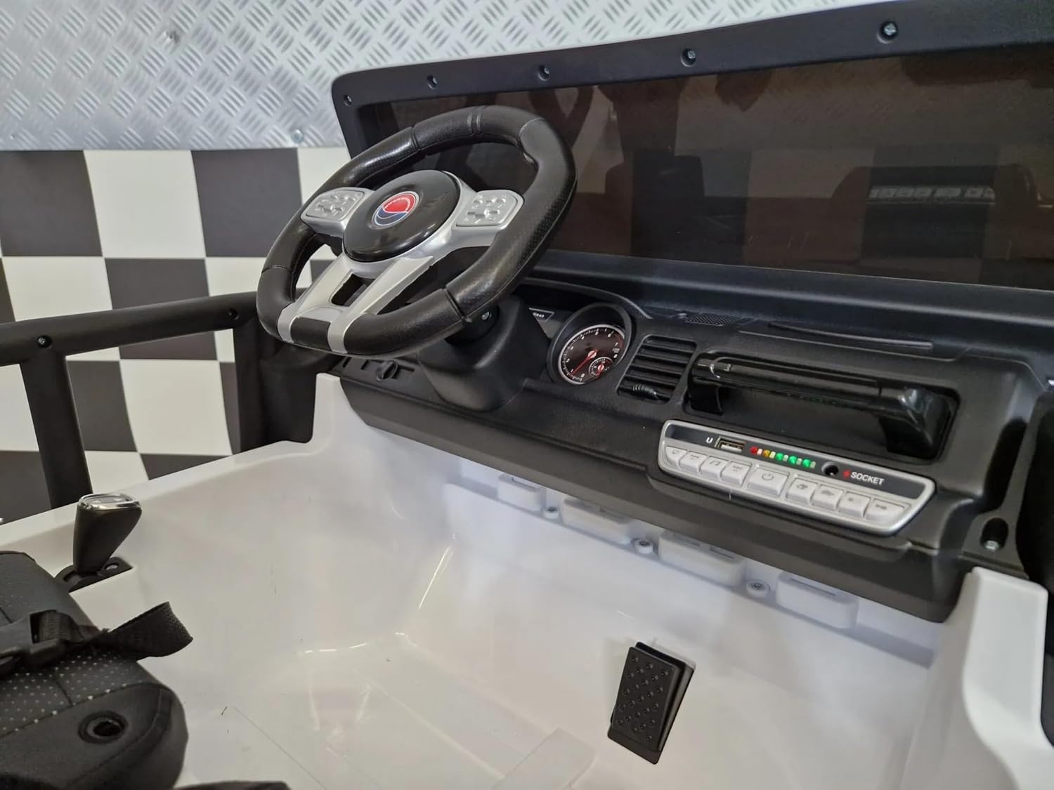 Tensione 12 volt 7AH Numero di motori 2x 45 watt RUOTE IN GOMA. Dimensioni L126xB78xH79 cm Colore Bianco 2.4 GRC, avvio morbido Sì Bluetooth Sì Sedile in pelle Sì Cintura di sicurezza, cinture a tre punti Luci Sì Peso massimo caricabile 60 kg Velocità massima da 3 a 6 chilometri 2 posti. Controllo remoto Sì