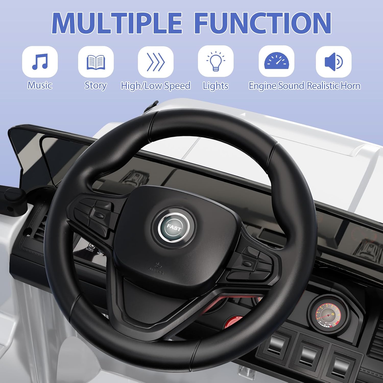 Due modalità di controllo: auto elettrica per bambini da 12 V grazie alle 2 modalità può essere controllata a distanza dai genitori tramite telecomando o manualmente dai bambini stessi con volante e pedale. 【 Multiple funzioni】 Auto per bambini dotata di lettore MP3, ingresso AUX, porta USB e slot per schede TF. È possibile riprodurre musica tramite le diverse interfacce, inoltre ha fari e clacson. La sicurezza è una priorità: il veicolo elettrico per bambini grazie all'avviamento regolare previene improvvise accelerazioni o frenate. Inoltre, la cintura di sicurezza impedisce ai bambini di cadere. Il sistema a molla e le 4 ruote ammortizzanti sono garantite una guida perfetta su qualsiasi terreno. Buon divertimento: due motori da 35 W garantiscono una potenza sufficiente. Con un carico di 31 kg, la batteria completamente carica è sufficiente per 45 minuti. L'angolo in basso a destra del volante è dotato di un'apertura di ricarica sicura. Nota: assicurati di leggere attentamente le istruzioni prima dell'uso. Il miglior regalo per i vostri bambini: con il suo aspetto fresco e le funzioni di guida realistiche, la nostra auto elettrica è il miglior regalo per bambini a partire dai 3 anni. I solidi materiali in acciaio e PP lo rendono robusto e resistente abbastanza per accompagnare i bambini per anni.