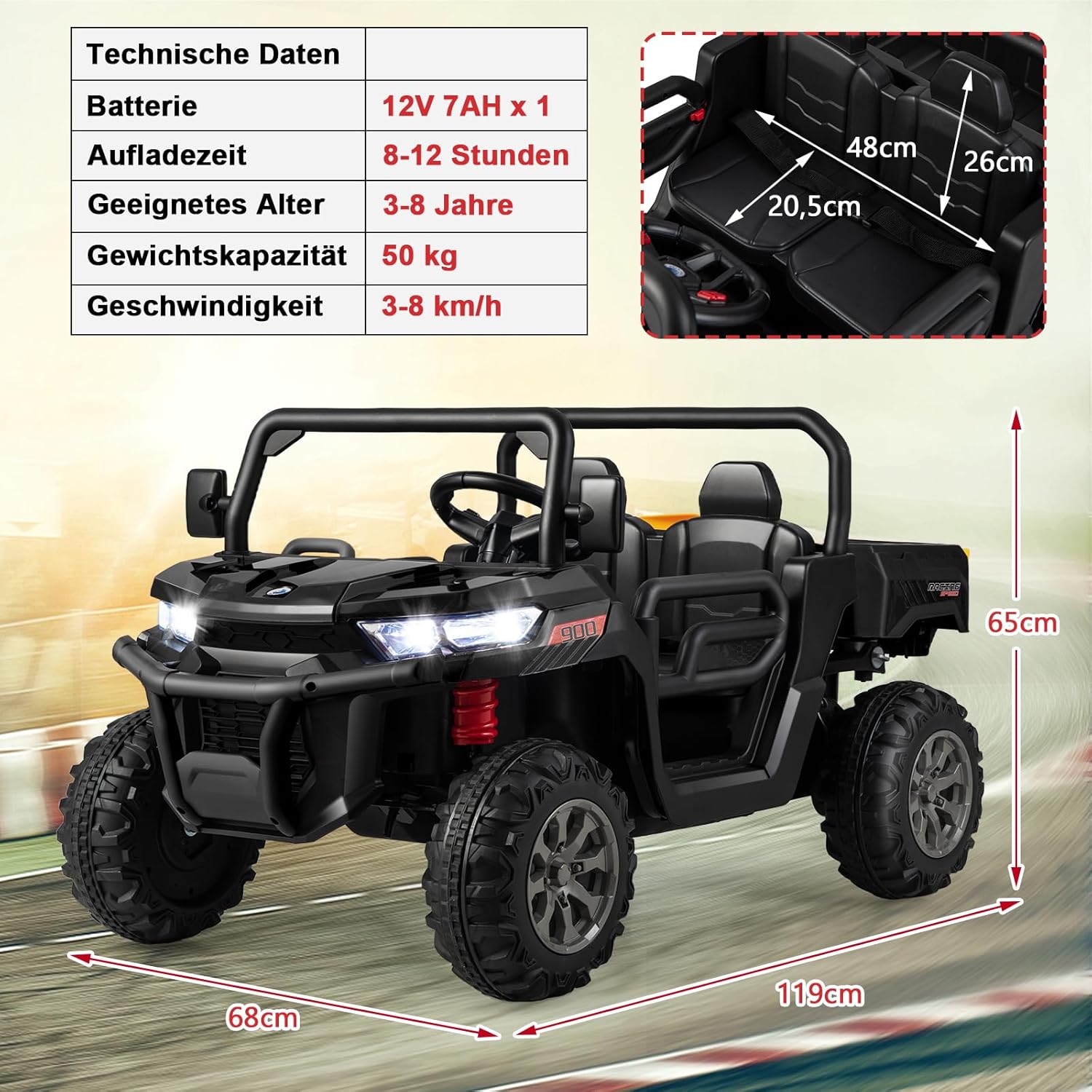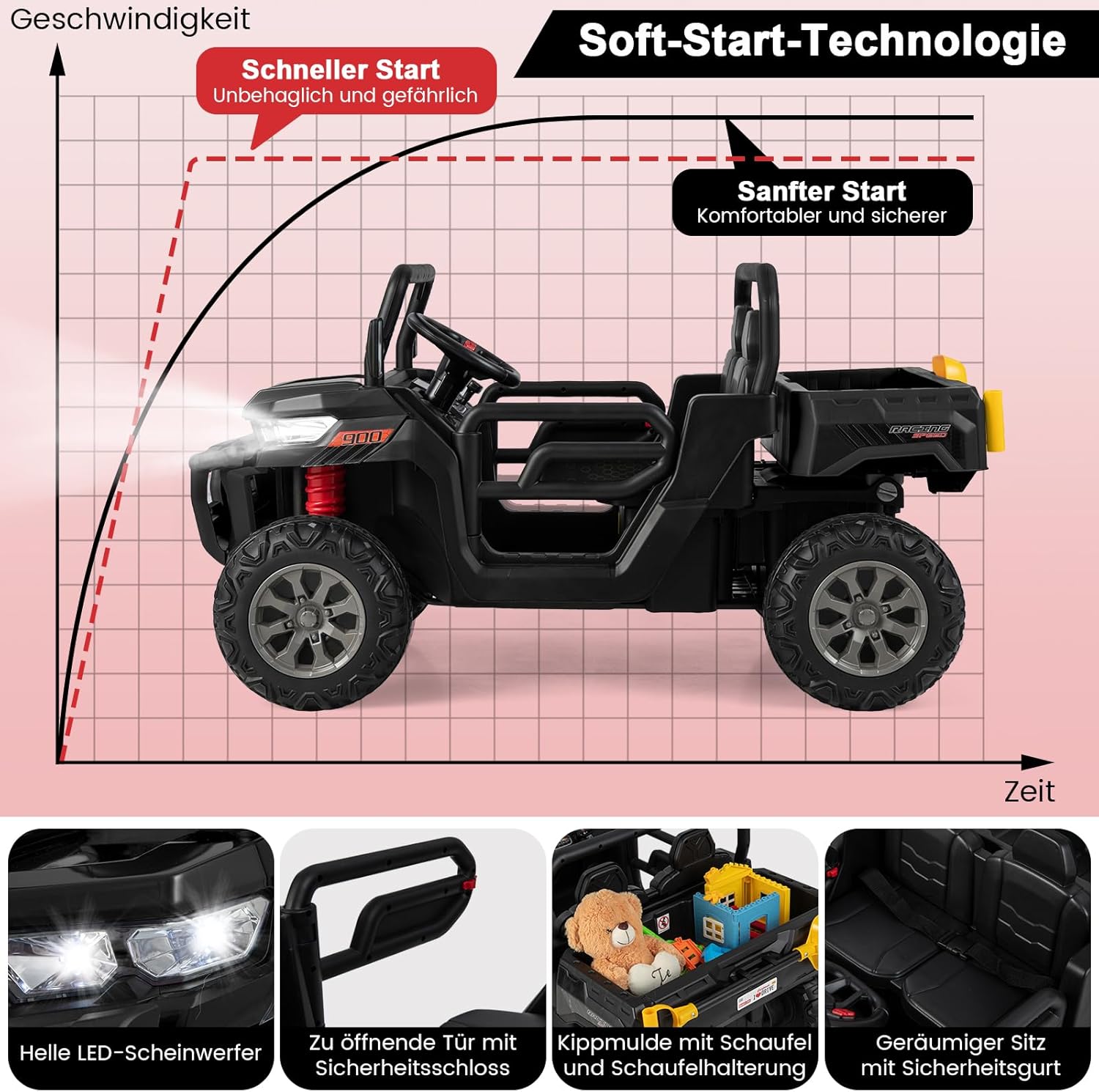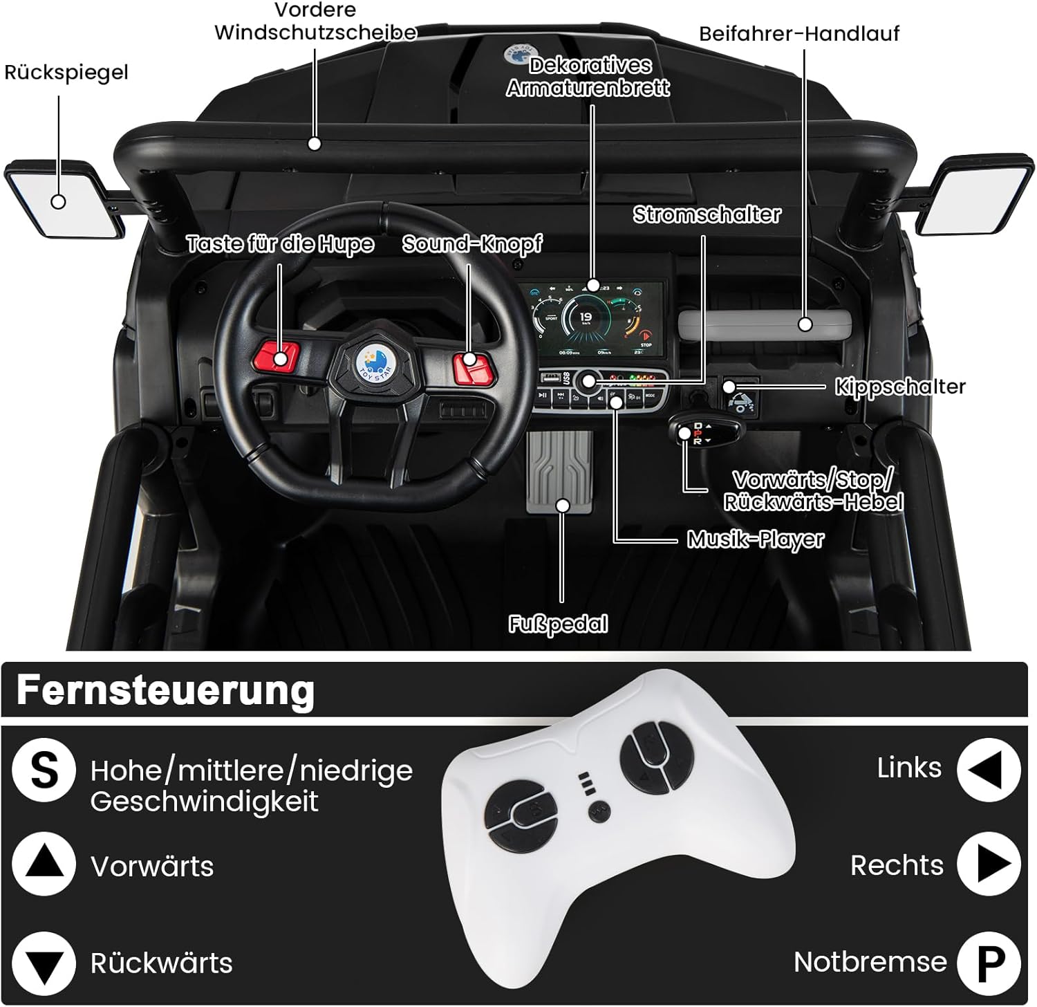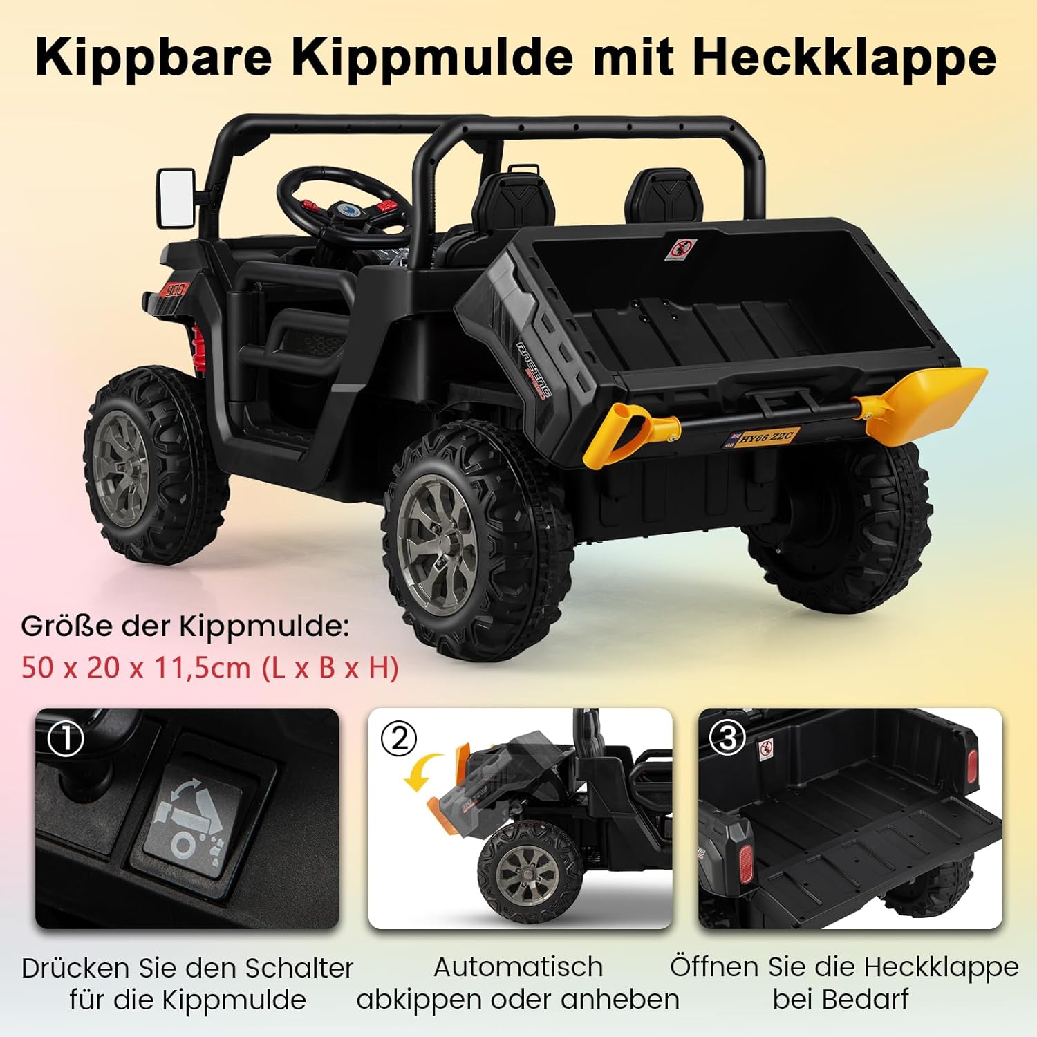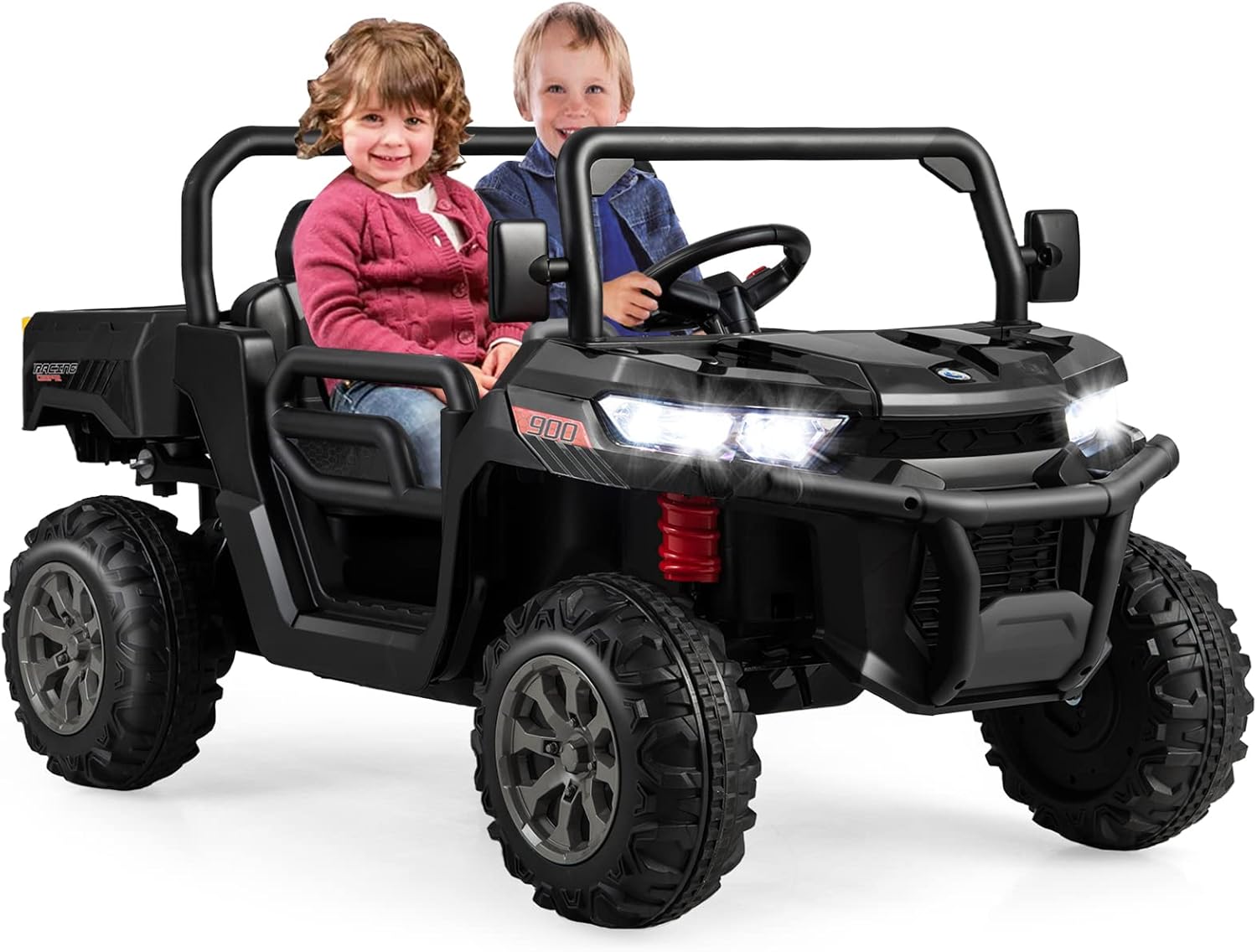 Letto inclinabile e funzione dondolo: la nostra auto per bambini in stile country è dotata di un letto inclinabile che puoi facilmente sollevare o abbassare. Inoltre viene fornito con una pala e un portellone posteriore apribile. L'auto è dotata anche di funzione dondolo così il tuo bambino si sentirà come se fosse su un trattore in campagna. Telecomando e funzione di avvio lento: la nostra auto per bambini non solo consente ai bambini di provare un vero divertimento di guida, ma è anche dotata di un telecomando che i genitori possono utilizzare per controllare l'auto a distanza. E utilizza la tecnologia ad avvio lento per proteggere efficacemente la sicurezza dei bambini. Ruote e fari ammortizzanti: le 4 ruote del veicolo sono dotate di sospensioni a molla, quindi non solo sono resistenti all'usura, ma possono anche assorbire efficacemente gli urti per garantire una guida più fluida. 4 fari a LED luminosi aiutano i bambini a vedere chiaramente l'ambiente circostante. Musica e sedile sicuro: questa auto elettrica per bambini non solo ha musica e clacson, ma può anche collegare dispositivi musicali esterni tramite porte USB e Aux per portare più divertimento ai tuoi bambini. Due ampi sedili con cinture di sicurezza e porte con serratura rendono la guida ancora più sicura. Informazioni e applicazione sulla batteria: questa auto elettrica utilizza una batteria da 12 V 7 Ah, è alimentata da 2 motori e ha una velocità di 3-8 km/h. È un regalo popolare per i bambini dai 3 agli 8 anni. Si prega di fare riferimento al nostro manuale di istruzioni per l'installazione e le precauzioni.