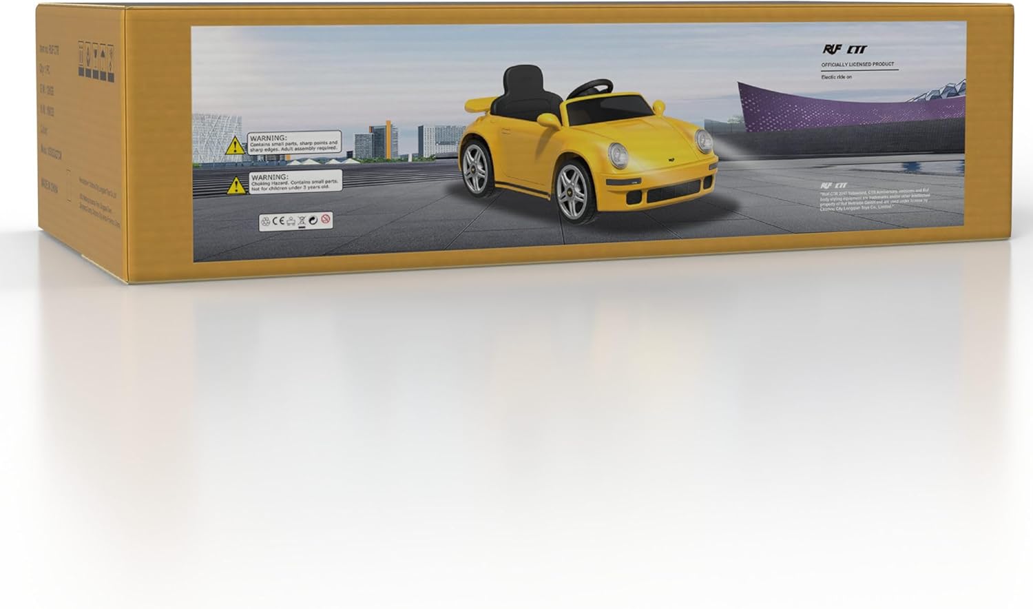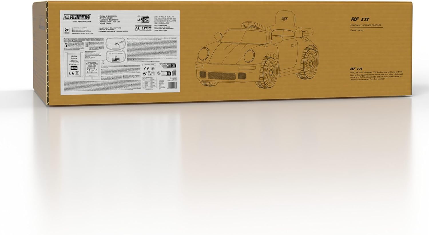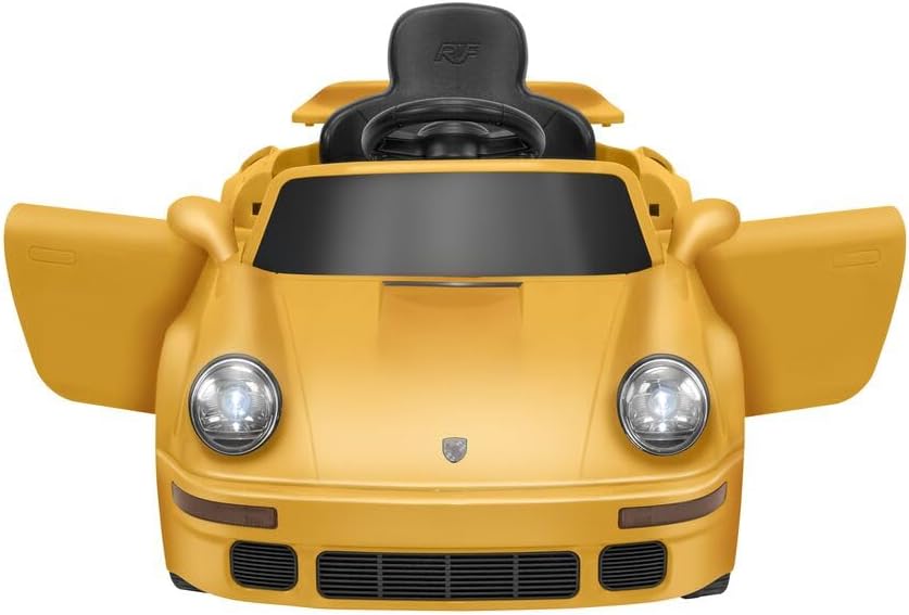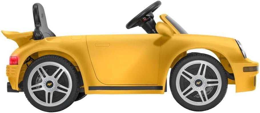 DESIGN SPORTIVO: Auto elettrica Ruf CTR 2017 con elegante finitura gialla, porte apribili e fari LED funzionanti per un'esperienza di guida realistica DOPPIO CONTROLLO: Guidabile direttamente dal bambino o tramite radiocomando parentale 2,4 GHz per massima sicurezza e controllo PRESTAZIONI: Batteria al litio 12V con autonomia 1-2 ore, velocità 2,5-3,5 km/h e capacità di carico fino a 25 kg CARATTERISTICHE: Dotata di cintura di sicurezza, clacson, effetti sonori all'accensione e connessione Bluetooth per la musica DIMENSIONI: Misure del veicolo 103 x 55 x 44 cm, ideale per bambini dai 3 anni in su, tempo di ricarica 5-6 ore
