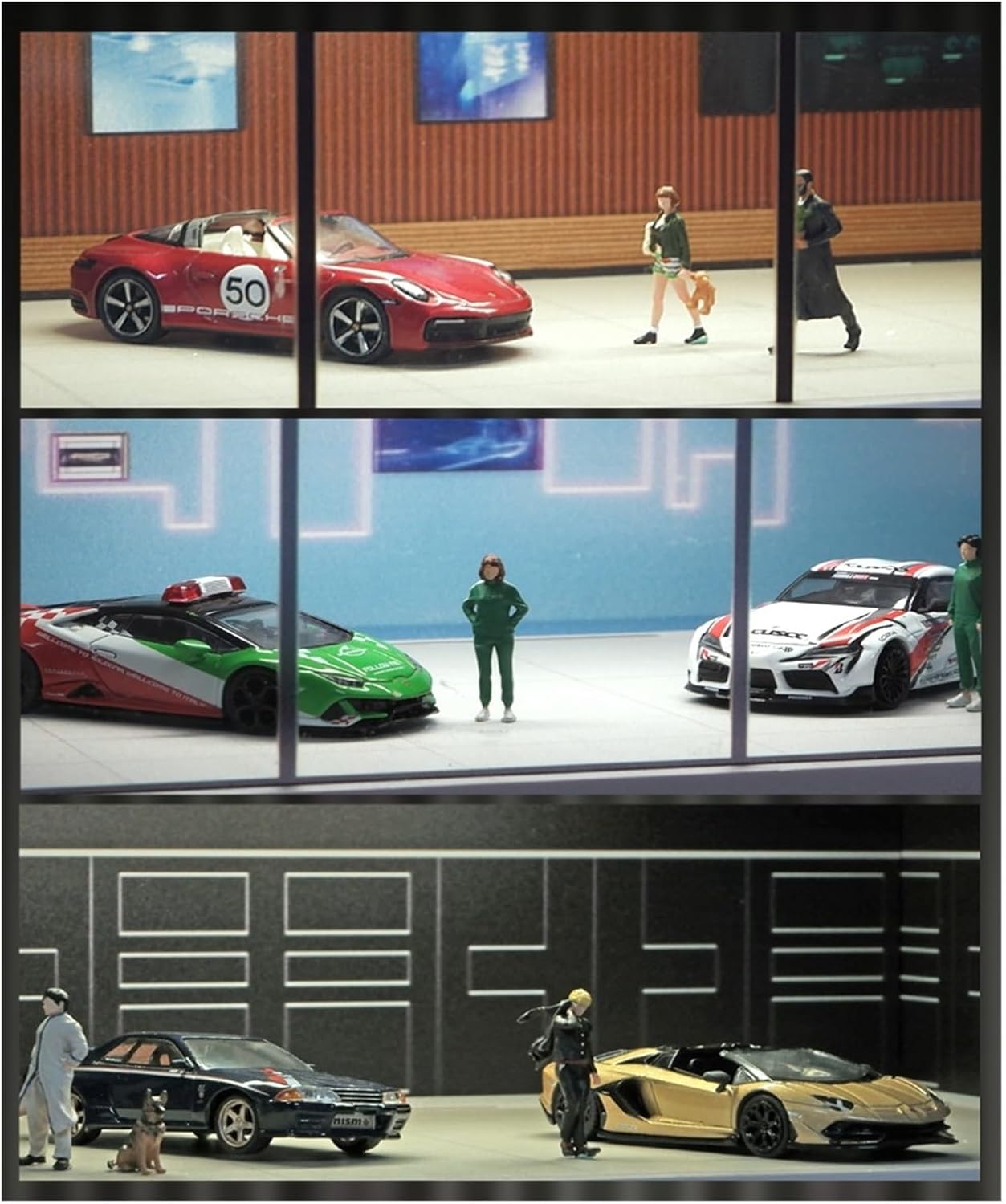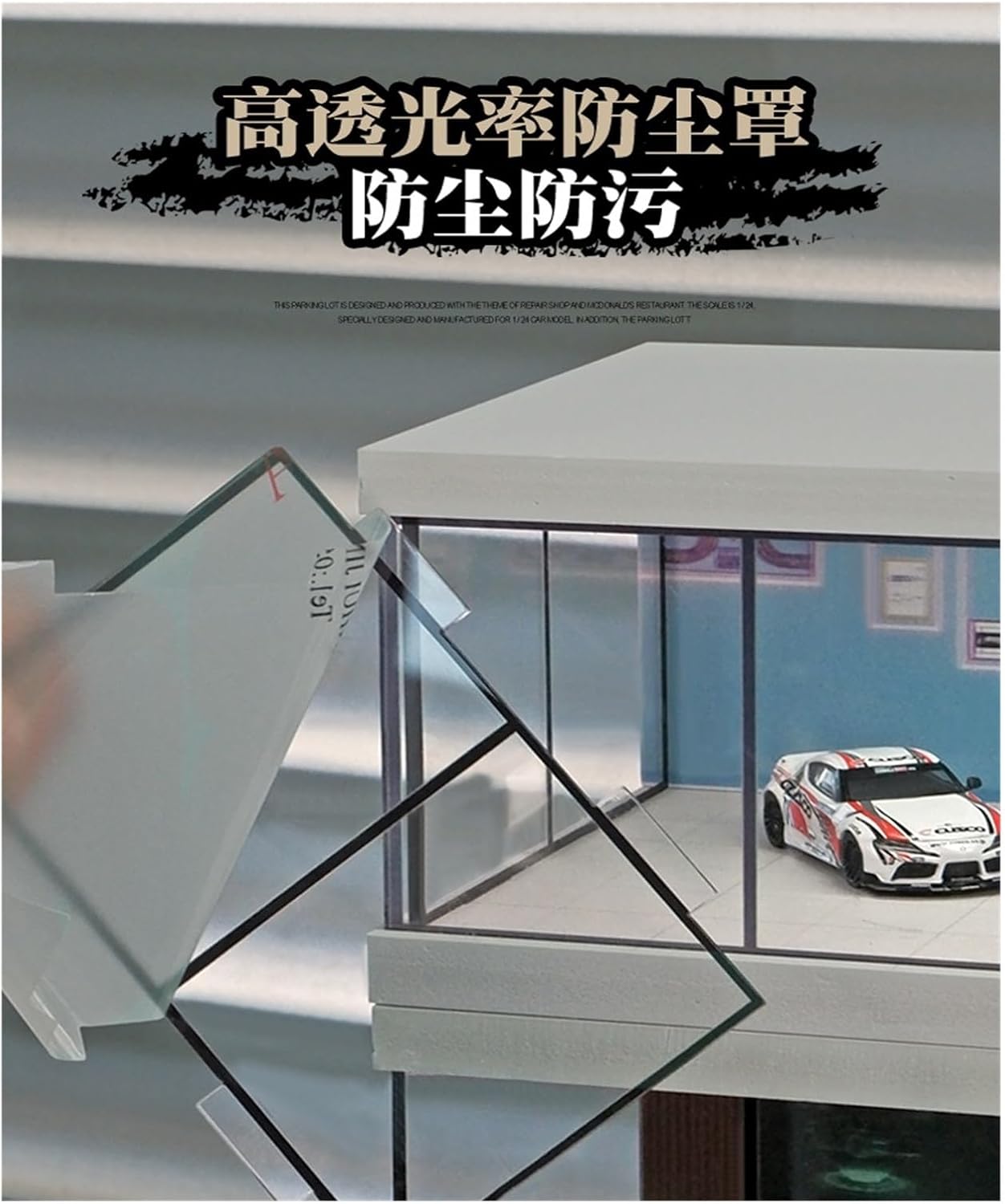 Scena in miniatura di un'auto modello di parcheggio 1:64 con scatola espositiva antipolvere per garage con simulazione di luce Materiale del prodotto: lega di zinco/ABS/componenti elettronici Funzione del prodotto: facile montaggio/illuminazione con un solo pulsante, con copertura antipolvere in acrilico ad alta trasparenza il modello di parcheggio ha un design fai-da-te. Puoi regolare il numero e la disposizione dei parcheggi in base alle tue preferenze ed esigenze, aumentando il divertimento del gioco. vetrina simulata per parcheggio in scala , ideale per esporre auto sportive e modelli di auto giocattolo da collezione.