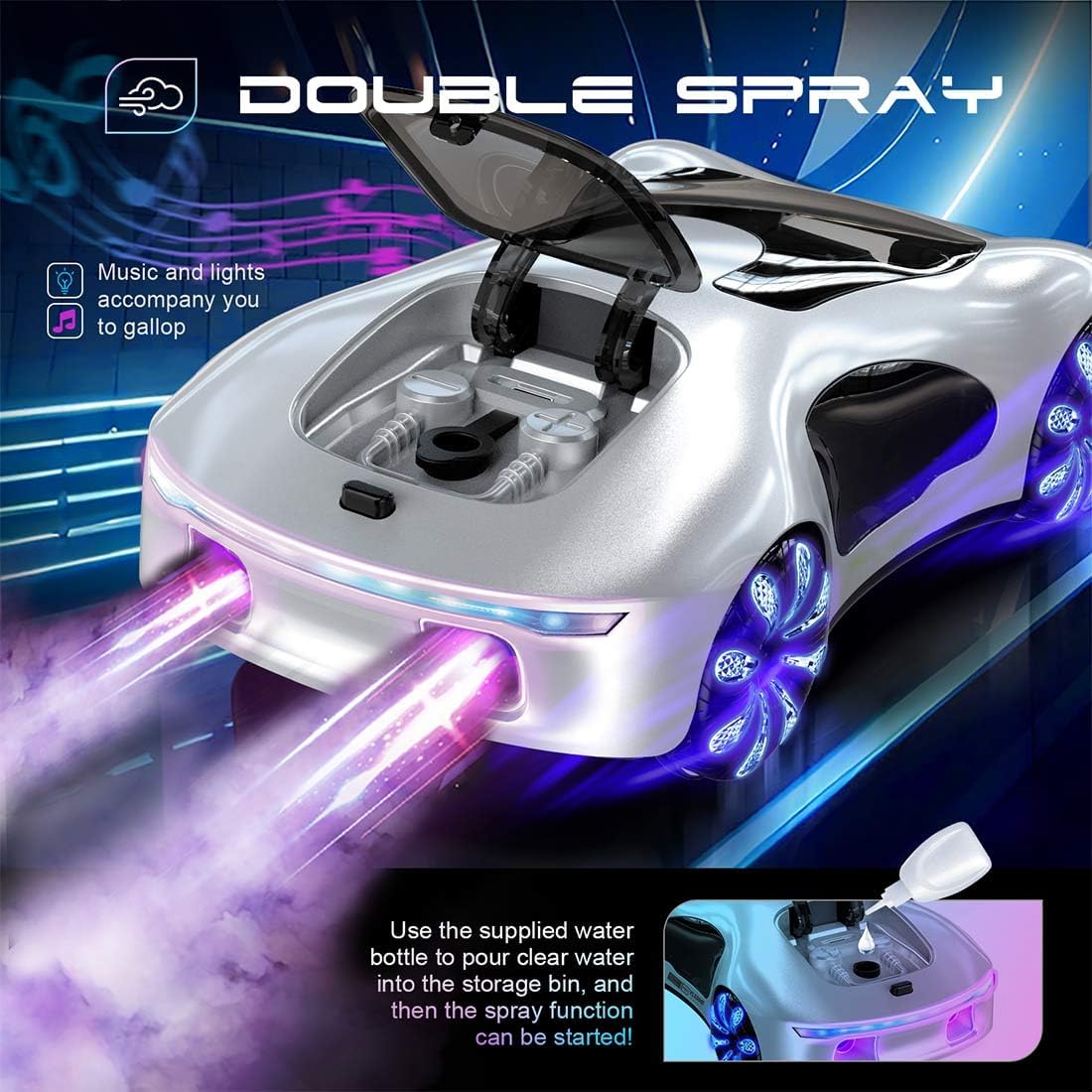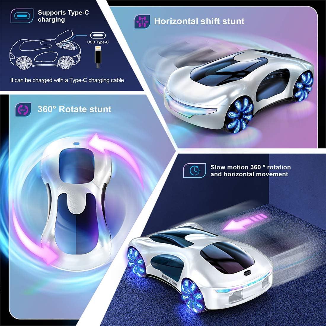 Design futuristico con finitura sfumata: presenta un corpo elegante e aerodinamico e un colore sfumato da sogno. Il guscio integrato e la struttura liscia supportano capovolgimenti e acrobazie a 360° con stile e durata Doppio controllo e divertimento multiplayer: supporta sia il manico che il telecomando dell'orologio con sistema doppio RC stabile a 2,4 GHz. Gioca con gli amici senza interferenze e goditi esperienze di corsa sincronizzate Giri a 360°, deriva laterale ed effetto spray: offre prestazioni potenti con deriva laterale, flip completi e un emozionante effetto "nitro boost" a doppio spruzzo, ideale per gli appassionati di auto da deriva RC ad alta velocità Illuminazione a LED ed effetti musicali: quattro modalità di illuminazione e sottofondo LED freddo migliorano il gioco notturno. Gli effetti musicali dinamici aggiungono immersione per una corsa coinvolgente ed energizzante ogni volta Ricaricabile e pronto all'uso: include batteria da 1200 mAh, caricabatterie USB e dock di ricarica di tipo C. Completamente assemblato fuori dalla scatola, basta caricare e andare per un massimo di 30 minuti di divertimento continuo