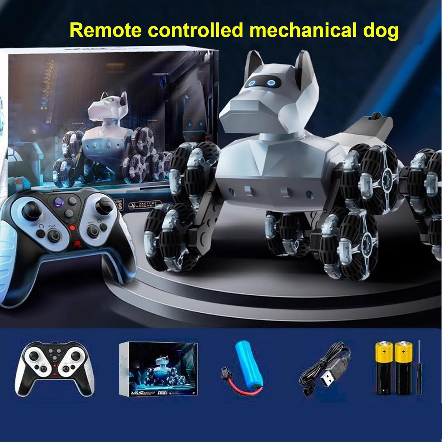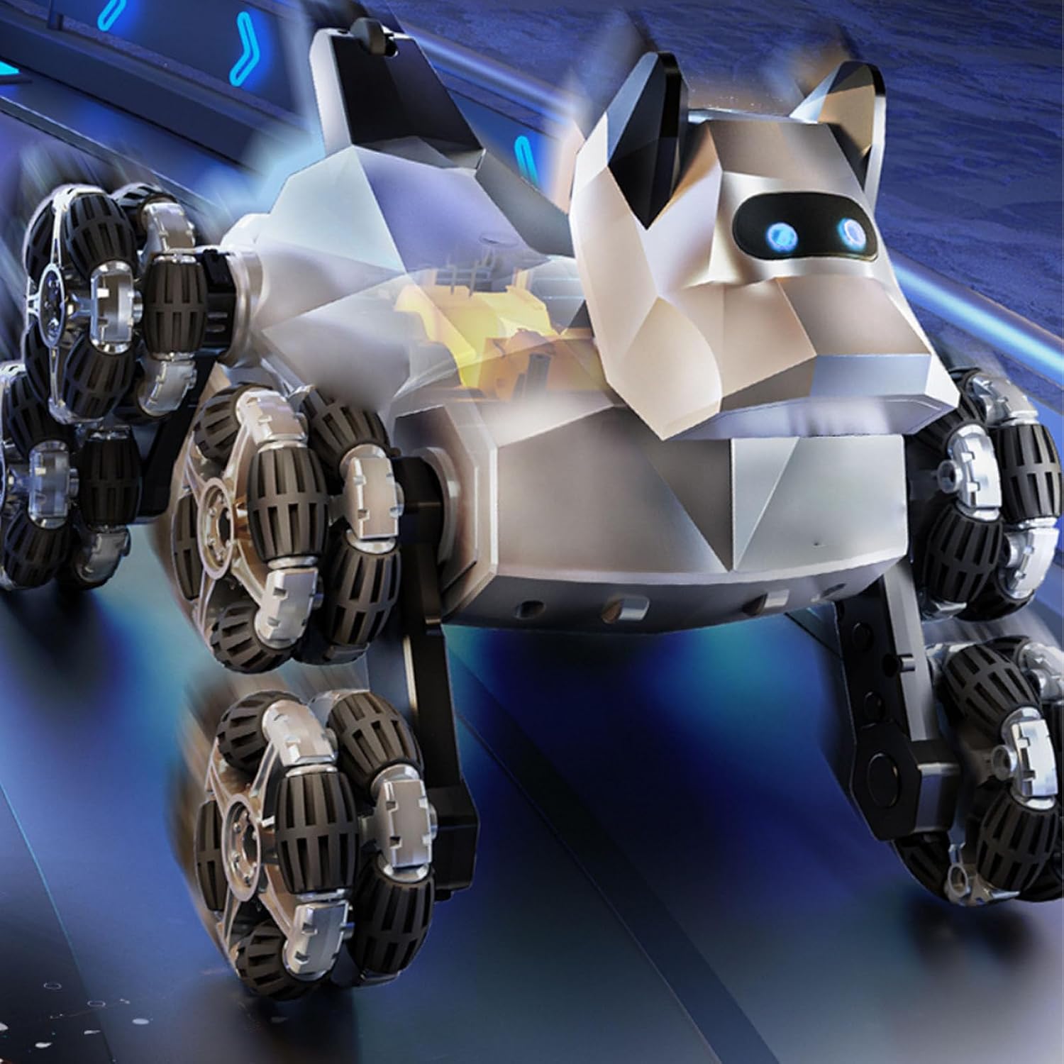 ALTAMENTE TECNOLOGICO E ACCATTIVANTE: Combinando l'aspetto di un cane meccanico con un design a ruote motrici, la sua forma ricorda quella di un cane da battaglia, con linee audaci e luci a LED (come gli occhi e il telaio) come accenti. Accoppiato con effetti sonori dinamici, cammina come un compagno intelligente di un film di fantascienza, emanando un senso futuristico ed è profondamente amato dai ragazzi MOVIMENTO FLESSIBILE, STUNTAZIONI CONTINUE: Il cane robot telecomandato adotta quattro paia di ruote in gomma antiusura, che supportano le svolte in avanti, all'indietro, a sinistra e a destra e può completare fantastiche acrobazie come la rotazione a 360° sul posto, la rotazione laterale, il rotolamento e la camminata all'indietro. Ha una forte potenza e un'ottima presa e può correre senza problemi su vari tipi di terreno come pavimenti, tappeti e piastrelle, il che è molto interessante FUNZIONAMENTO DEL TELECOMANDO E RISPOSTA SENSIBILE: Il robot per cani telecomandato è dotato di un telecomando wireless da 2,4 GHz, con una lunga distanza di controllo (di solito 15-25 metri), segnale stabile e forte capacità di prevenire interferenze. La disposizione dei tasti è chiara e il funzionamento è semplice. I bambini possono facilmente controllare il cane robot per completare varie azioni, migliorando la coordinazione occhio-mano e la capacità di reazione INTERAZIONE INTELLIGENTE, ESPERIENZA COINVOLGENTE: Supporta effetti sonori di abbaio, luci lampeggianti, modalità segui o funzioni di evitamento automatico degli ostacoli. Il cane robot emette abbaiamenti simulati e suoni elettronici mentre si muove, come se fosse un vero animale domestico, migliorando il senso di immersione nel personaggio e permettendo ai bambini di provare il divertimento di addestrare cani meccanici mentre giocano MATERIALE SICURO, DI LUNGA DURATA E ANTIURTO: Il corpo del cane robot da arrampicata è realizzato in plastica ABS ad alta resistenza, resistente agli urti e all'usura. Gli angoli sono arrotondati e senza sbavature, soddisfacendo gli standard di sicurezza per i giocattoli per bambini. Alimentato a batteria, ricarica USB o utilizzando batterie a secco, con durata della batteria stabile, ideale per compleanni, festival e come ricompensa