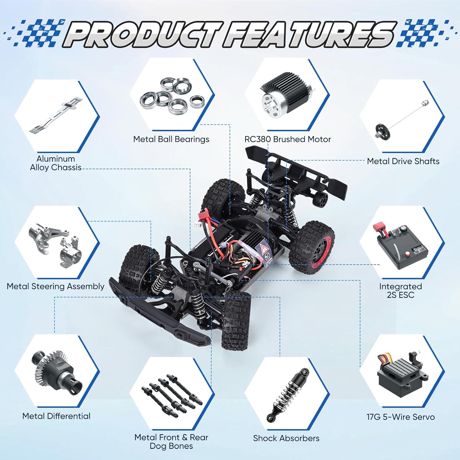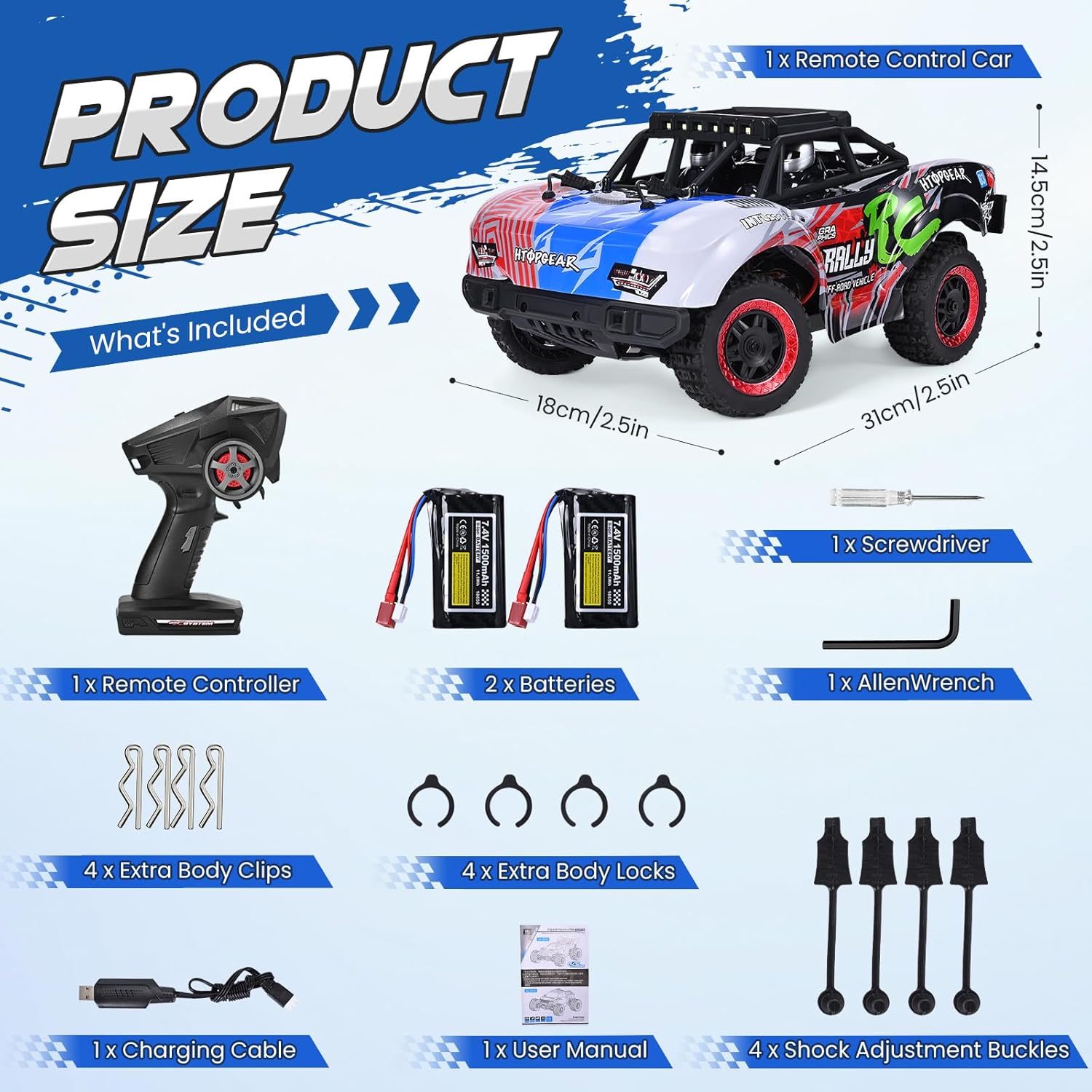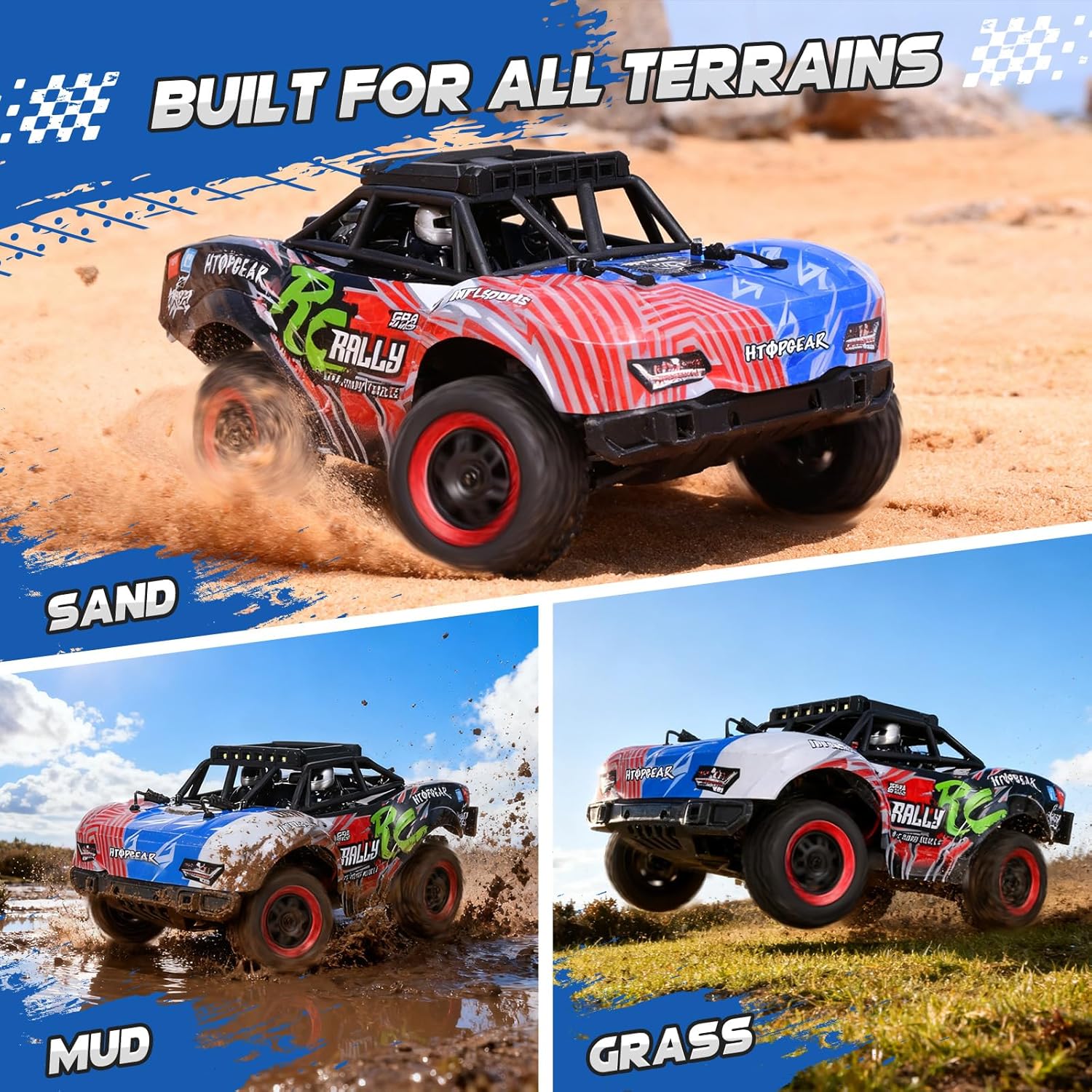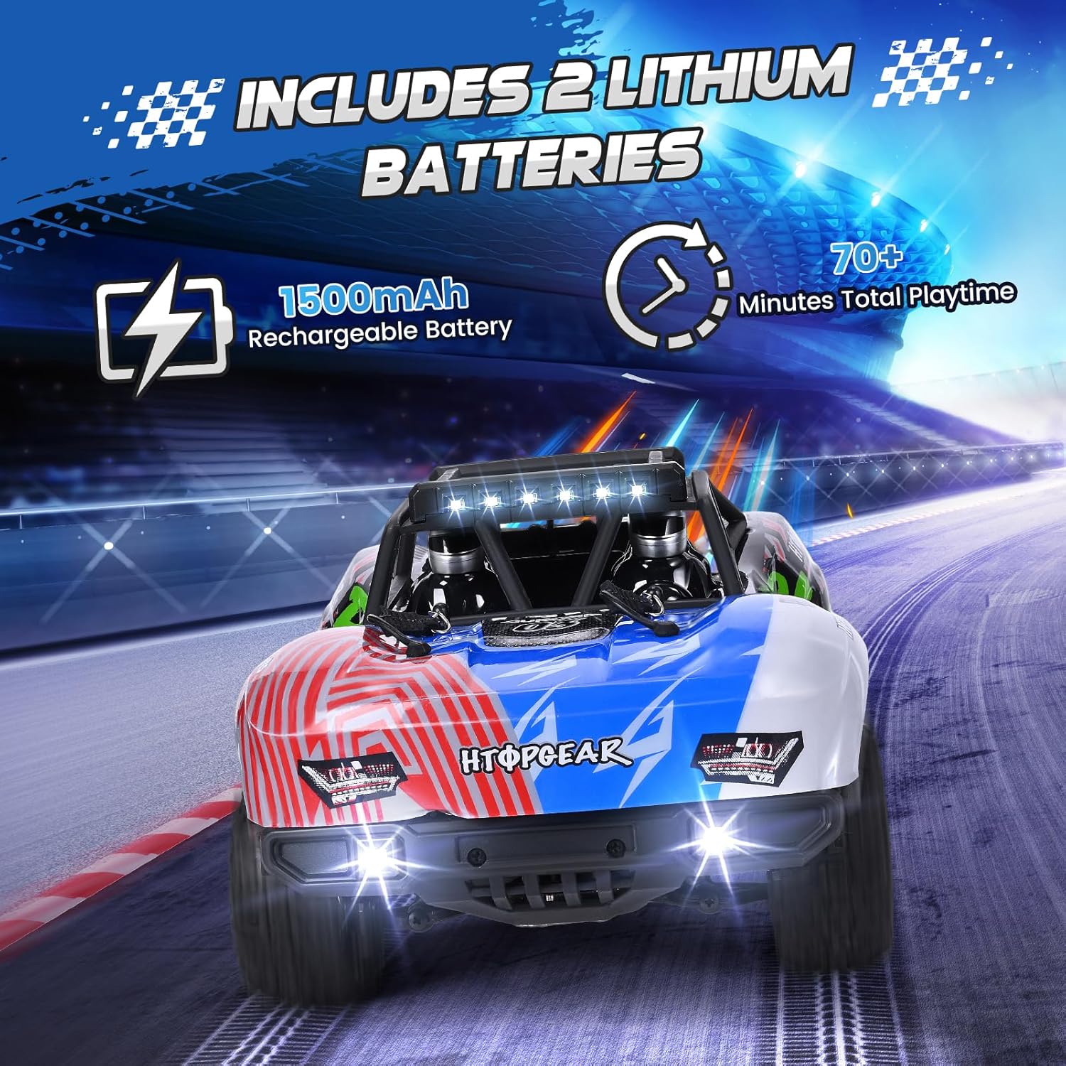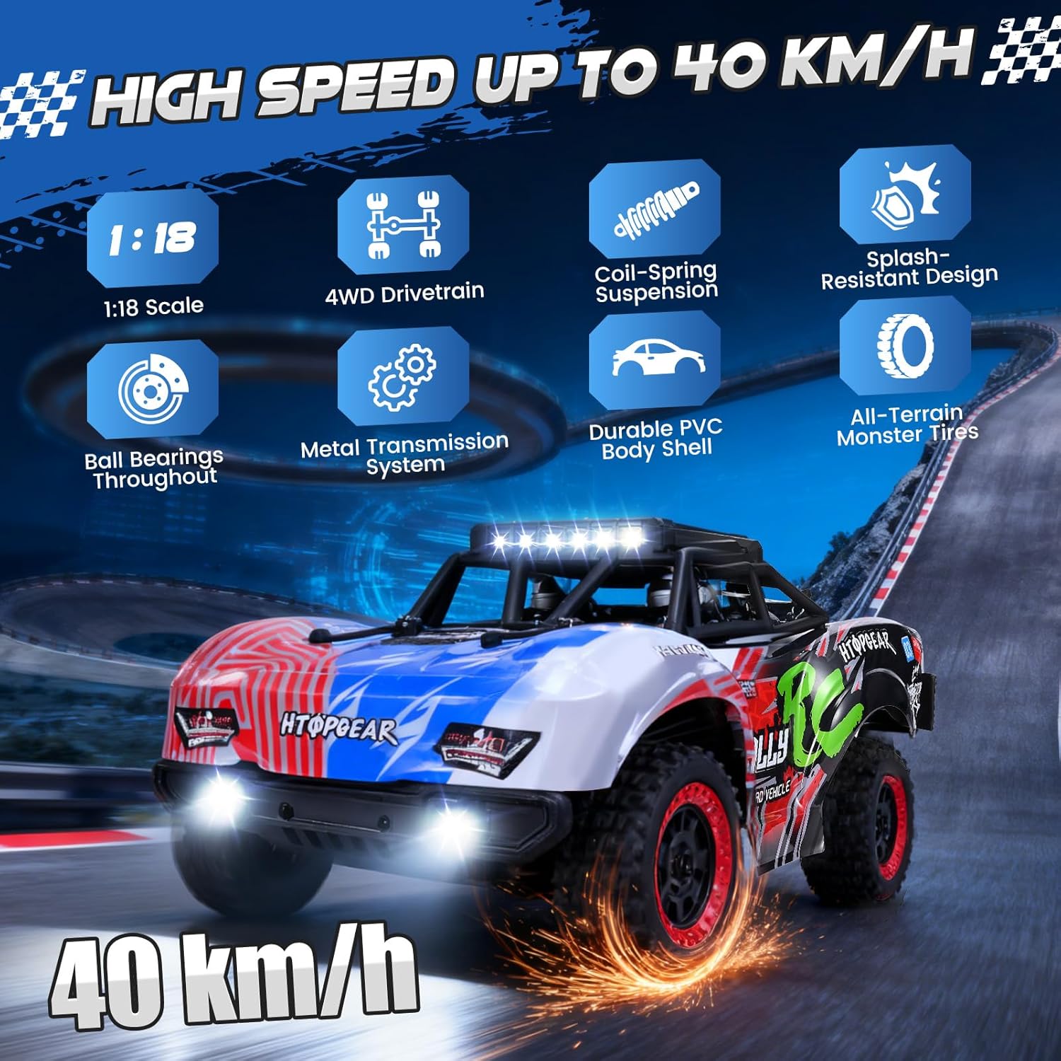 Prestazioni ad alta velocità: raggiungi velocità incredibili fino a 40 km/h con il potente motore a spazzola RC380 e la trazione integrale. Il telaio in lega di alluminio, l'ingranaggio in metallo e il robusto corpo in PVC garantiscono velocità e durata e garantiscono un divertimento ininterrotto. Tempo di riproduzione a lungo termine: la confezione include due batterie ricaricabili al litio da 1500 mAh sostituibili che offrono una durata totale di oltre 70 minuti. Sostituisci facilmente le batterie per sessioni di gioco prolungate e senza interruzioni, per un divertimento ininterrotto, sia all'interno che all'esterno. Controllo preciso a 2,4 GHz: il telecomando da 2,4 GHz fornisce un segnale stabile e senza interferenze con una portata di 80 m. Grazie al gas e allo sterzo completamente proporzionali, potrete godere di accelerazione delicata, frenata reattiva, retromarcia senza sforzo e curve taglienti per un controllo professionale su qualsiasi terreno. Fantastiche modalità di illuminazione a LED: dotato di fari anteriori e luci da tetto con 3 modalità: luce fissa, lampeggio lento e lampeggio veloce. Sia di giorno che di notte, il tuo camion RC risplende per stile e visibilità su qualsiasi terreno. Capacità di tutti i terreni: grazie alle sospensioni a vite, agli ammortizzatori di pressione dell'olio, ai cuscinetti a sfera e ai pneumatici mostri, potrete gestire facilmente sabbia, fango ed erba. I differenziali in metallo e gli alberi di trasmissione garantiscono una maggiore stabilità e prestazioni fluide su tutte le superfici. Adatto per bambini a partire dai quattordici anni, è il miglior regalo di Natale per vostra figlia o vostro figlio.