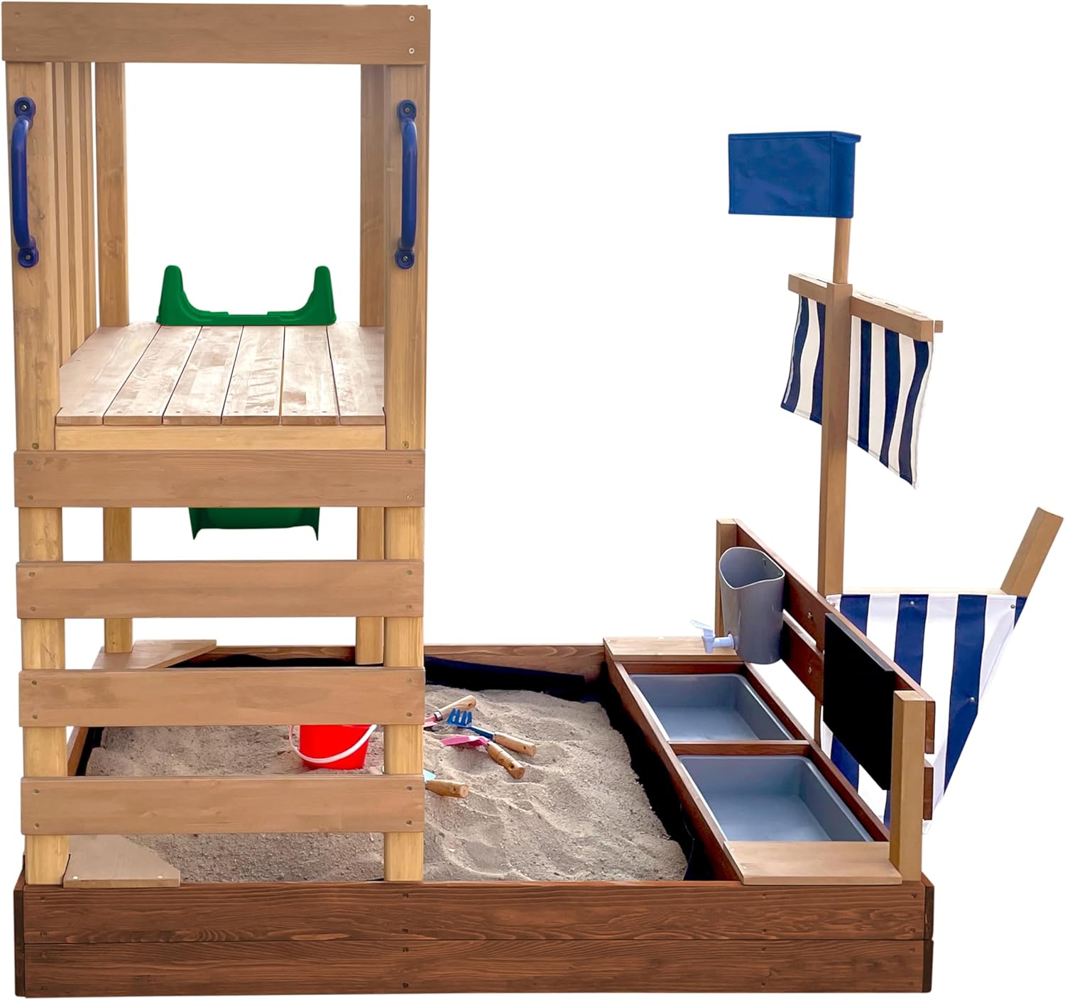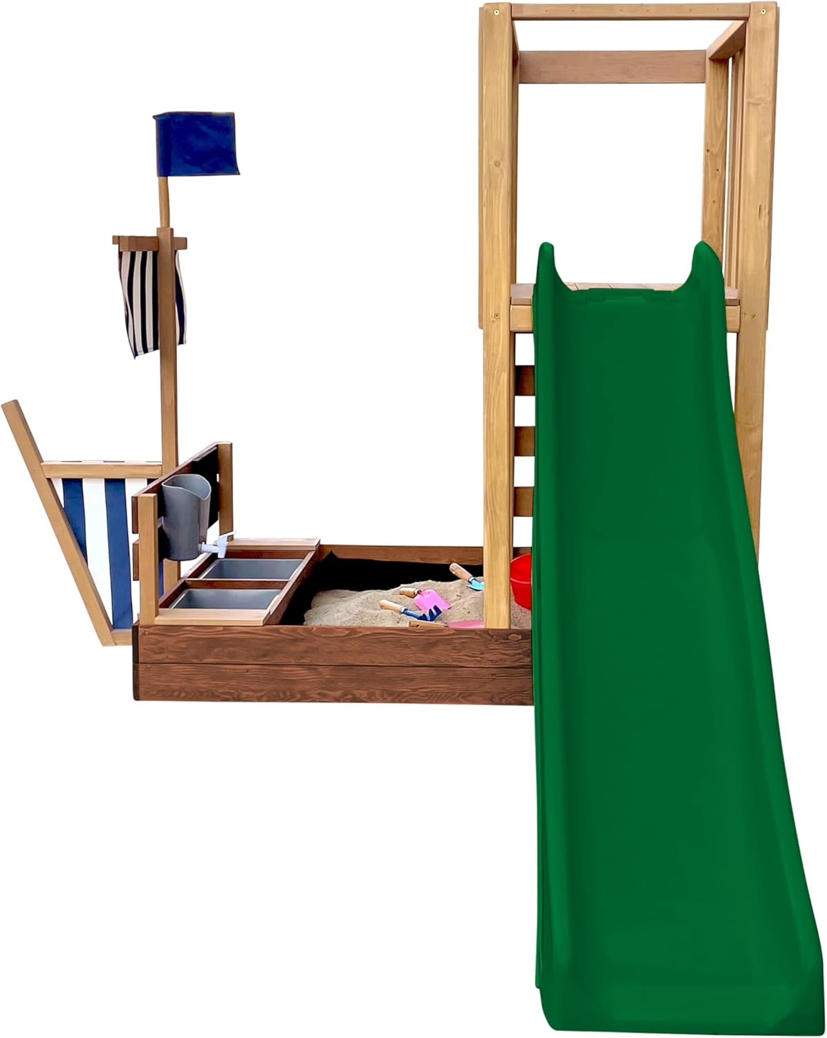L'AVVENTURA VICHINGA ALL'APERTO: la torre giochi AXI Vicky trasforma il tuo giardino in un'emozionante nave vichinga! Sali a bordo, traccia rotte sulla lavagna, parti alla conquista di nuovi mondi e scivola sullo scivolo verso la tua prossima avventura. Che si tratti di fare castelli di sabbia o cercare tesori, la torre offre innumerevoli possibilità di gioco per i piccoli esploratori a partire dai 3 anni... CON CUCINA GIOCO, SCIVOLO E SABBIERA: la cucina giocattolo integrata con due lavelli e un rubinetto invita a cucinare, mentre il grande scivolo con collegamento all'acqua garantisce momenti di divertimento acquatico. La sabbiera può contenere 180 kg di sabbia ed è ideale per scavare. Lo scivolo può essere montato in diversi modi: sul retro, sul lato o anche rimovibile. Per ancora più possibilità di gioco in giardino! DESIGN SICURO E RESISTENTE: la torre giochi è realizzata in legno di abete rosso certificato FSC al 100% proveniente da foreste gestite in modo sostenibile. Il legno è privo di schegge, resistente alle intemperie e alla putrefazione. Trattato con una vernice a base d'acqua, senza sostanze nocive e senza prodotti chimici. Certificato CE e testato secondo la norma EN71 per un gioco sicuro e una durata extra-lunga. SPAZIO PER TUTTA LA FAMIGLIA - CON DIMENSIONI COMPATTE: Dimensioni esterne: 180,5 x 87 x 150 cm (L x P x A), altezza della piattaforma 90 cm. Scivolo: 175 cm di lunghezza. Vasca per sabbia: 110 x 95 x 17 cm (dimensioni esterne). Carico massimo della torre giochi: 150 kg, scivolo: 50 kg. Adatto per un massimo di 3 bambini. Perfetto per giardini piccoli con un grande potenziale di avventura: resistente, stabile e facile da montare. AXI: Parti per un'avventura nel tuo giardino con AXI! Lasciati sorprendere dai design unici e dalle innumerevoli possibilità che offrono le nostre casette per bambini e parci gioco in legno. Che tu stia cercando una casetta compatta o una grande torre di gioco con scivolo e altalene, AXI realizza i sogni dei bambini! AXI dispone anche di sabbiere, tavoli d'acqua e una vasta gamma di accessori per rendere la casetta ancora più unica.