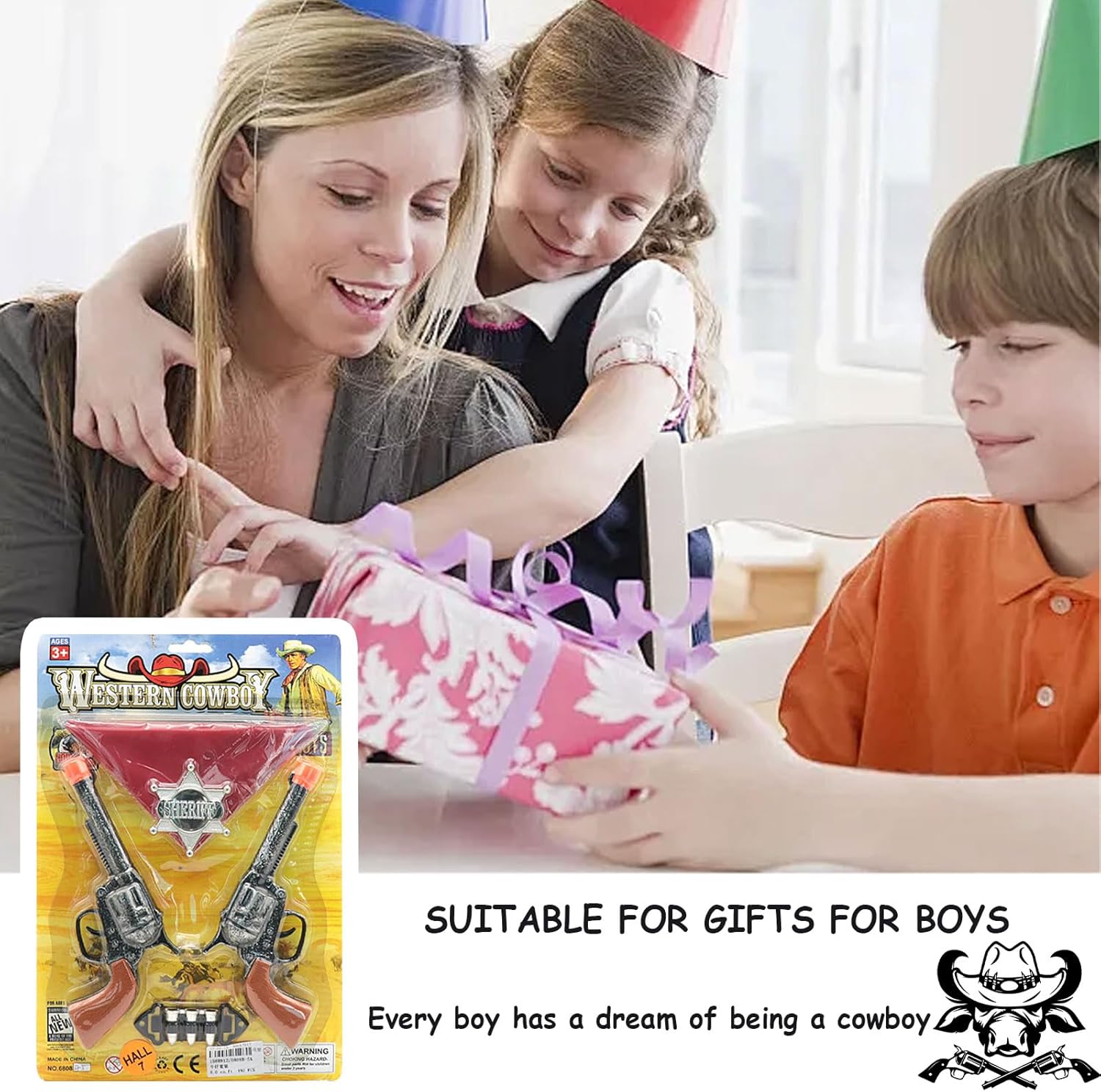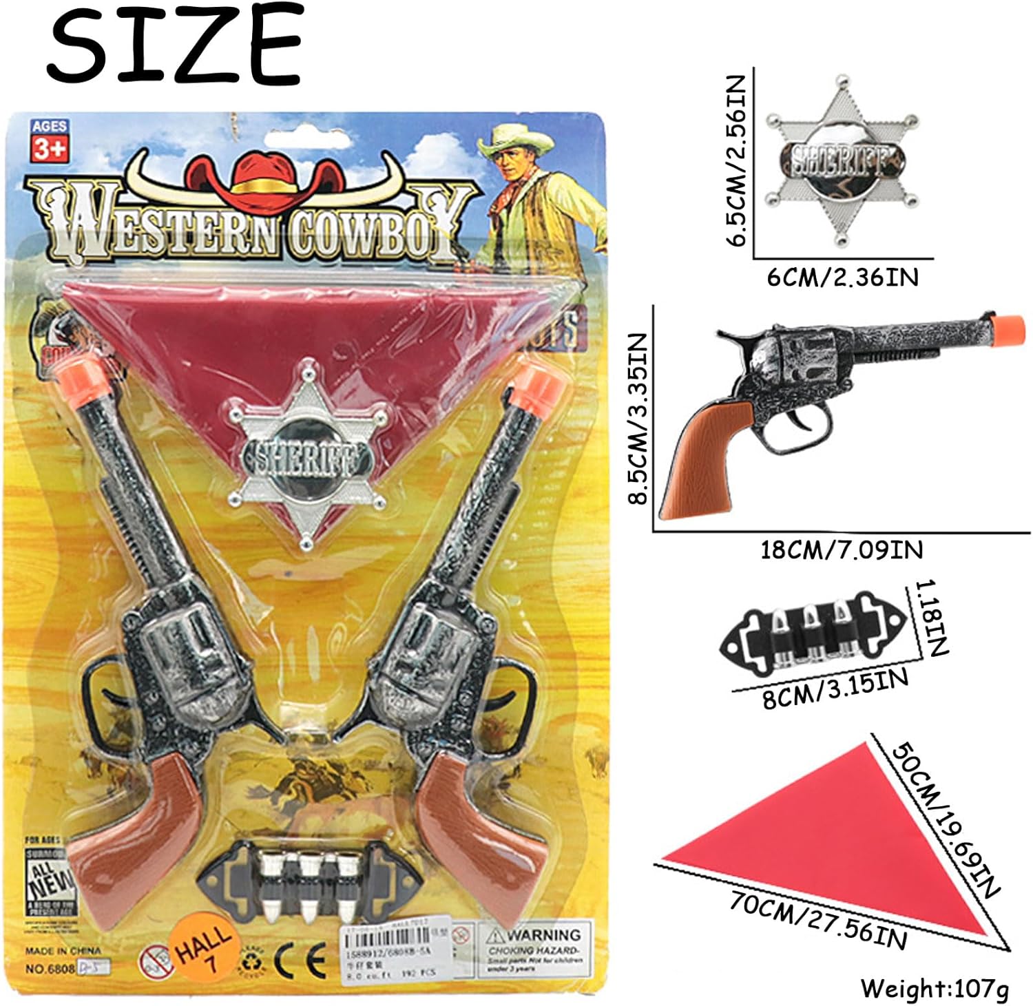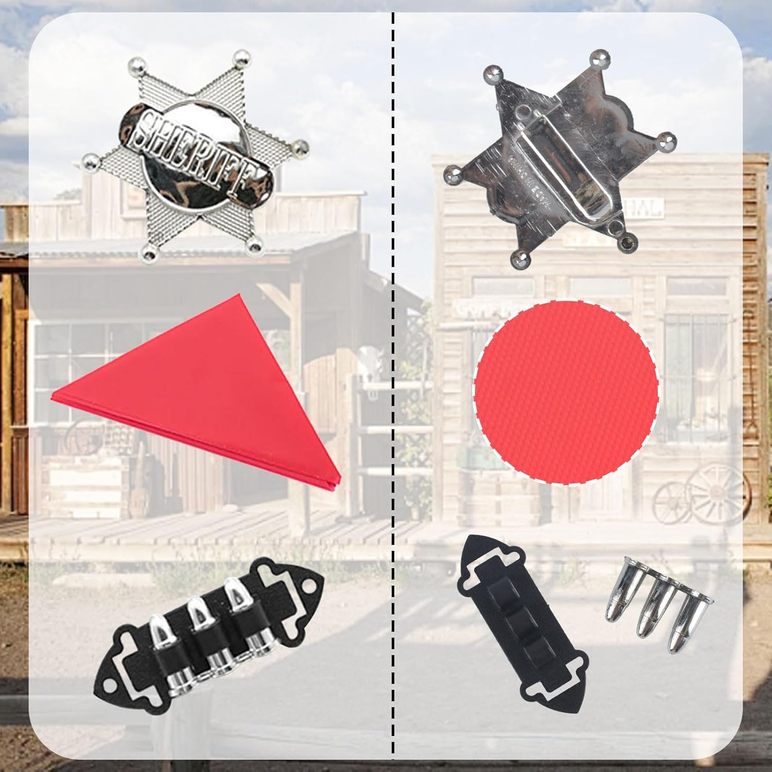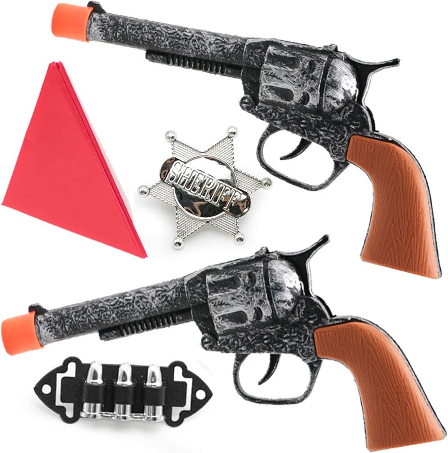 Contenuto della confezione: 2 pistole da cowboy, 1 bandana rossa, 1 badge sceriffo, 1 riviste.