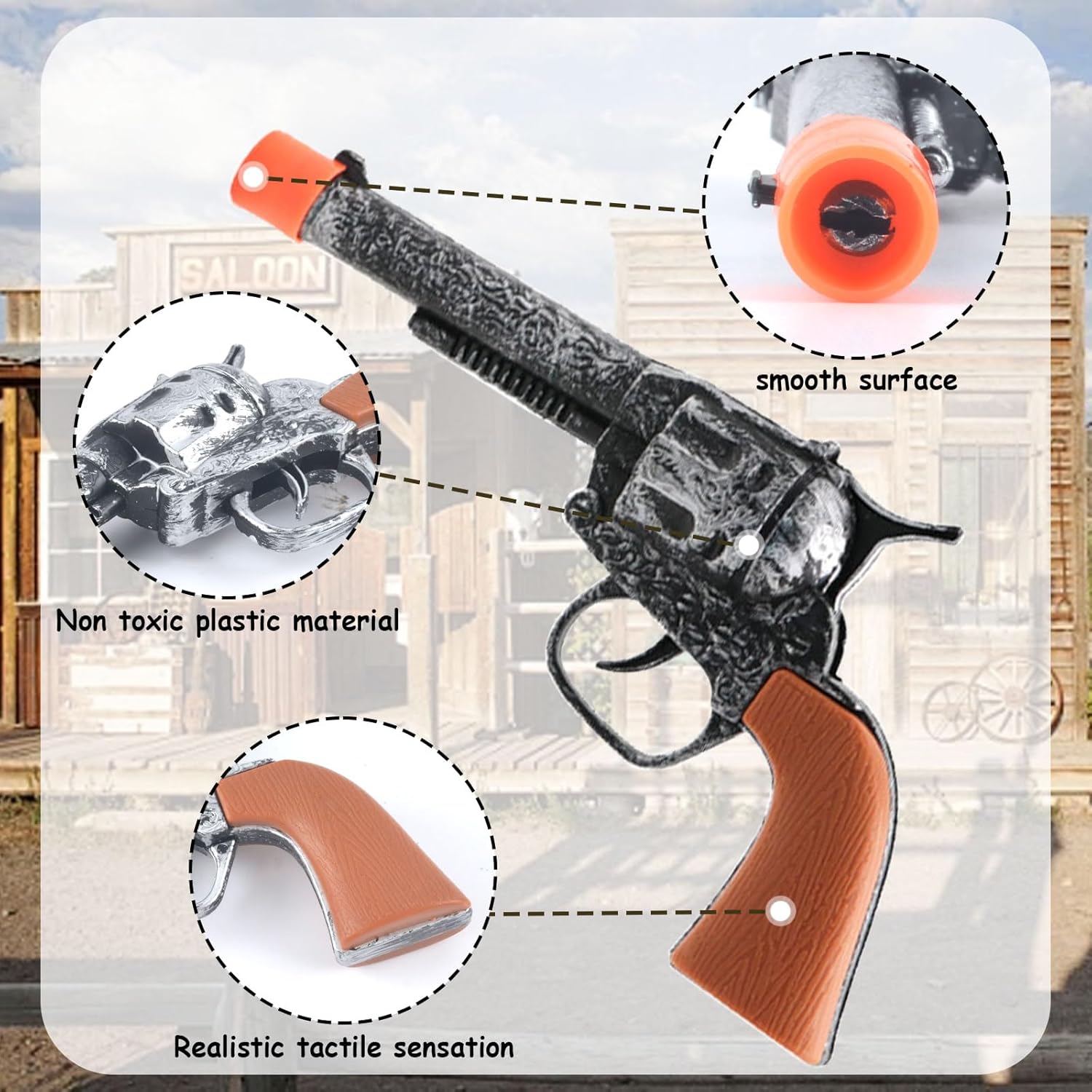 2. Il set è completo, due pistole da cowboy sono adatte per condividere con buoni amici. Contenuto della confezione: riceverete 5 prodotti, tra cui 2 pistole da cowboy, 1 bandana rossa, 1 badge sceriffo, 1 clip per palla (viene fornito con 3 palline, non può tirarlo), questi accessori possono rendere i vostri bambini più coinvolgenti, sarà un'esperienza divertente. Materiali di alta qualità: la bandana è realizzata in cotone di alta qualità, morbido e confortevole al tatto; la pistola da cowboy, il badge dello sceriffo e le riviste sono tutti realizzati in plastica di alta qualità, inodore, solido e robusto, non sbiadisce facilmente; gli articoli del set sono tutti riutilizzabili. Ampia gamma di utilizzi: il nostro set di sceriffi è adatto per molte occasioni, come Halloween, giochi di ruolo, feste in costume, carnevale, club cowboy occidentale, ecc. Realistico e sicuro: la pistola da cowboy emette un suono realistico quando si preme il grilletto, ma le palline non possono essere rimosse dalla rivista, è solo un accessorio, il che garantisce che i bambini non feriscano accidentalmente gli altri durante l'uso.