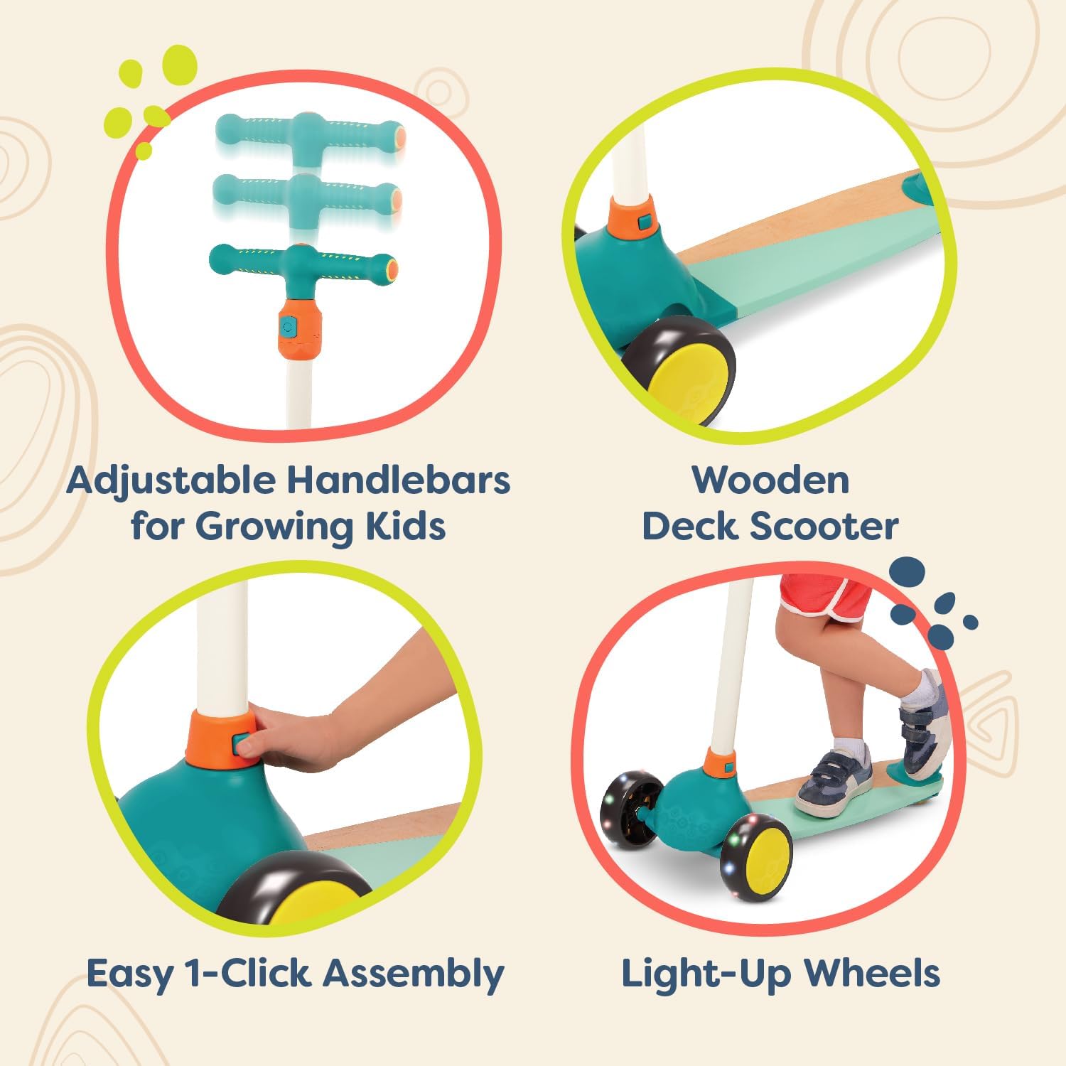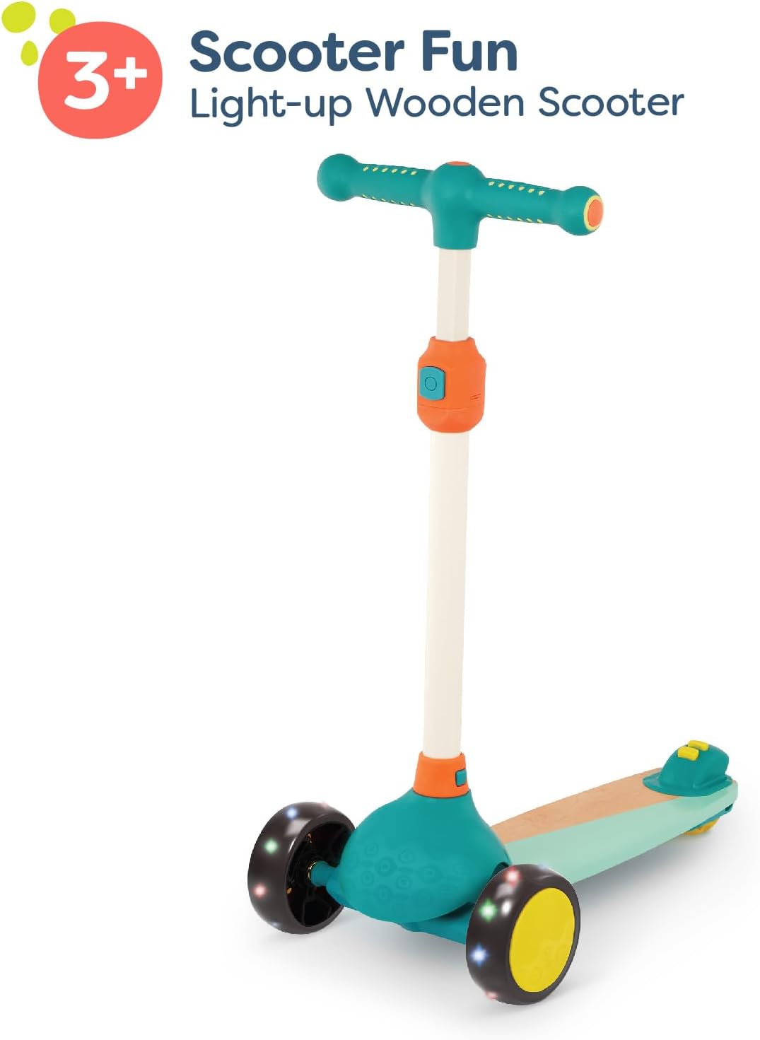 Scooter Fun: Step up and push off to take a ride on this colorful wooden scooter with fun light-up wheels! Grow-and Go: le barre sono regolabili in modo che questo scooter in legno possa crescere con i bambini. Facile da assemblare: istruzioni semplici, facili da seguire e 1 clic per ottenere il divertimento iniziato rapidamente. Active Play: Riding this scooter can improve gross motoristics skills and coordination (max. Peso: 110 lbs.) Età: questo monopattino in legno è raccomandato per bambini di 3 anni +