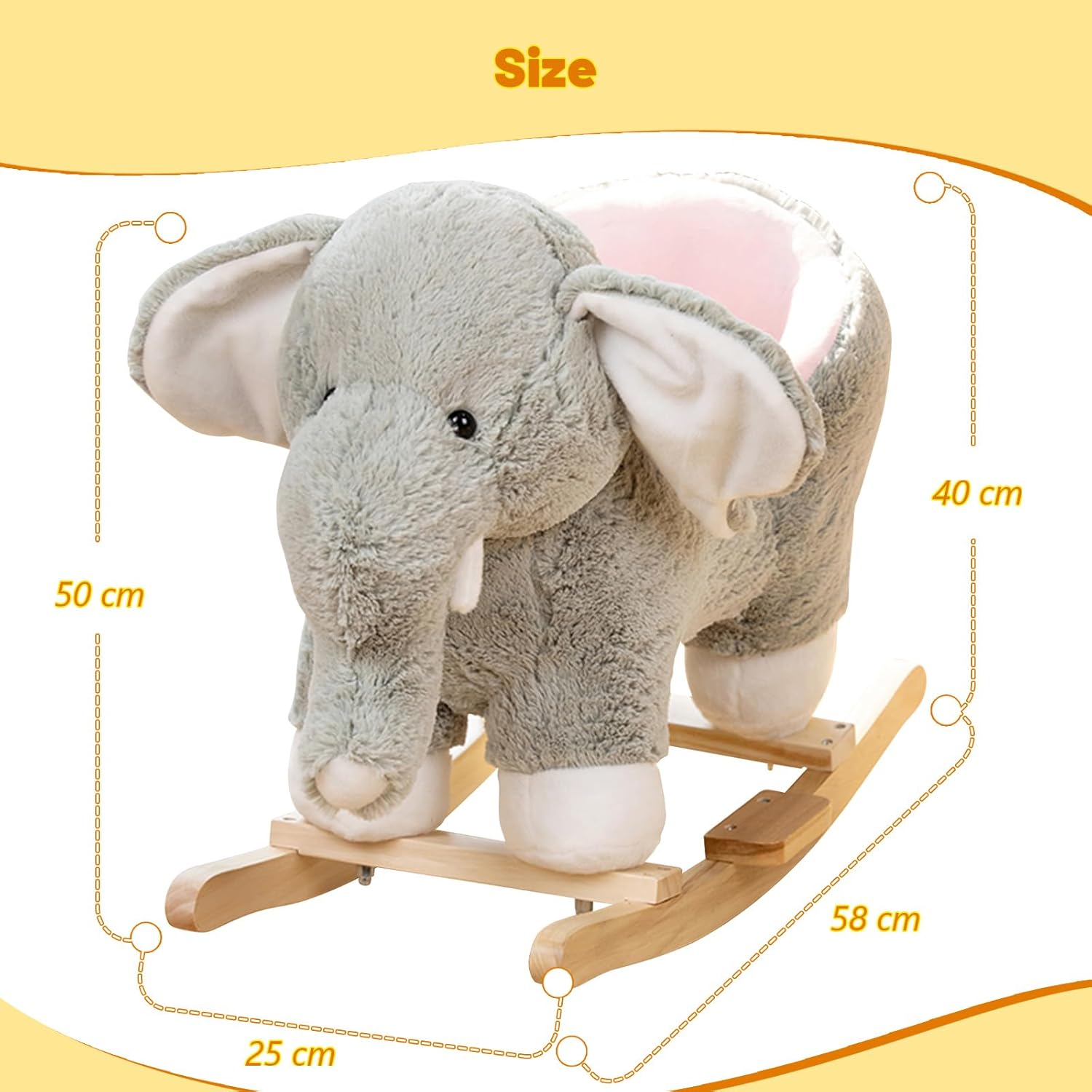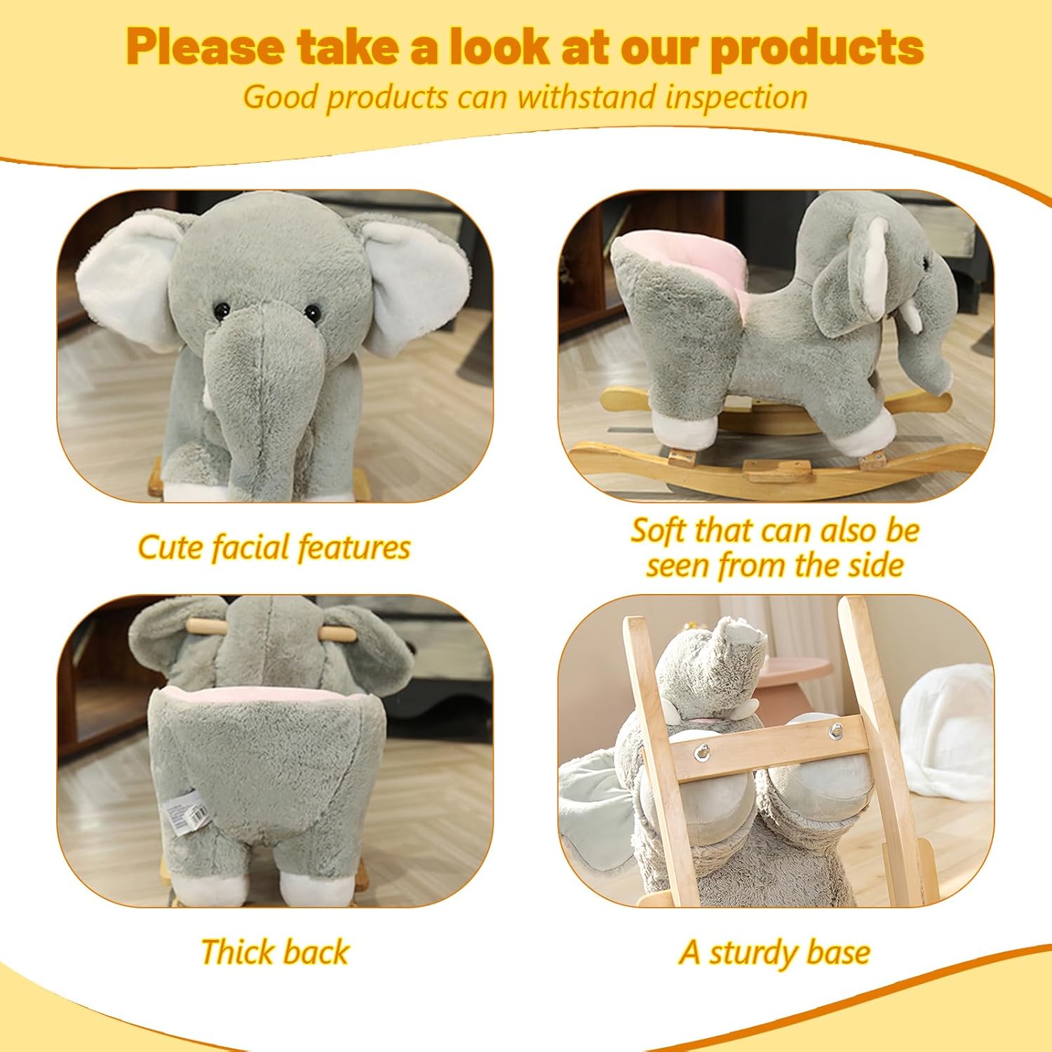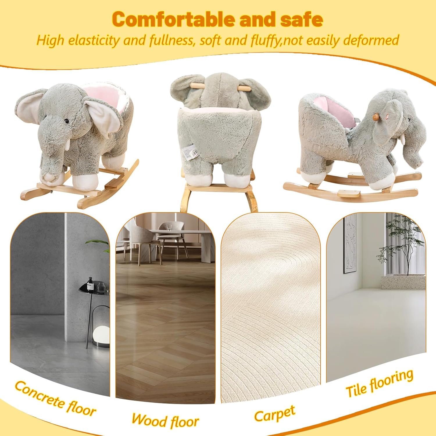 Adorabile design a elefante, morbida al tatto: questa sedia a dondolo presenta un'affascinante forma di elefante, rivestita in un morbido tessuto grigio di alta qualità per una sensazione eccezionalmente accogliente. La sua estetica calda e deliziosa si fonde perfettamente con qualsiasi arredamento. Supporto confortevole: costruito con un robusto telaio in legno per un supporto affidabile. Dispone di una base curva antiscivolo appositamente progettata che garantisce un dondolio delicato e sicuro senza ribaltarsi. L'ampio sedile include uno schienale alto, ali laterali per evitare cadute e aggiunte premurose come una cinghia di sicurezza e un corrimano posteriore, offrendo una guida sicura e confortevole per i piccoli piloti di età compresa tra 18 e 36 mesi.