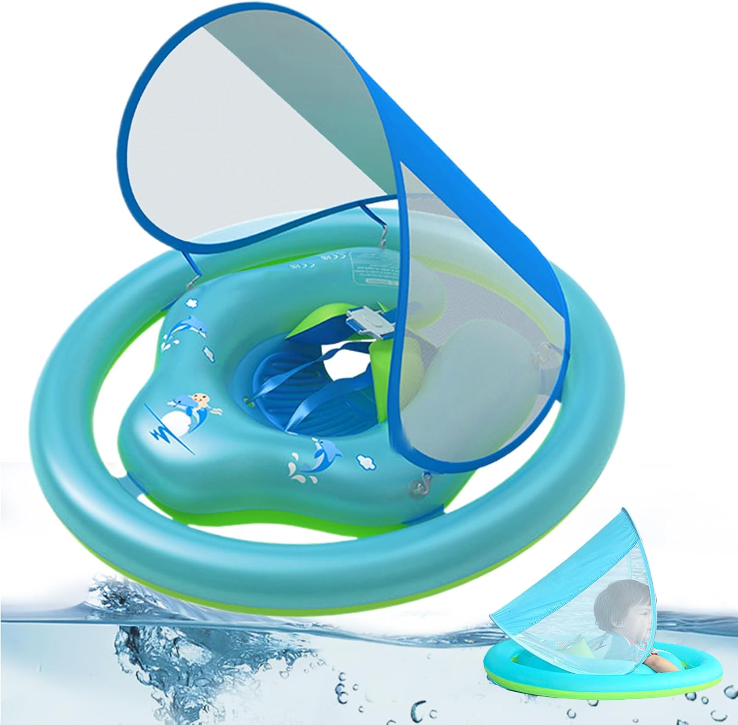 Sun Protection Canopy: Designed with a detachable and adjustable UPF 50+ canopy this baby pool float helps protect sensitive skin from harmful UV rays ensuring safe water play during sunny days whether at the pool beach or outdoor adventures Design di sicurezza avanzato: caratteristiche a secure inflatable seat with widened leg holes and backrest support keeping your baby upright and stable in the water to prevenent tipping or sliding while encouraging early swim confidence Play for : This baby swim float double as a water toy with playful and colorful design elements to stimulate visual engagement and keep entertained while enjoy splashing and floating freely Travel-Friendly and Easy to Inflate: Lightweight and foldable this inflatable float is ideal for on-the-go families it inflates quickly and deflates compact for space-saving storage perfect for travel beach days or visiting relative Multipurpose for Indoor and Outdoor Use: Not just for pool this baby float is suitable for bathtubs backyard kiddie pool and beach play offering flexible fun and comfort for babies and during every water activity