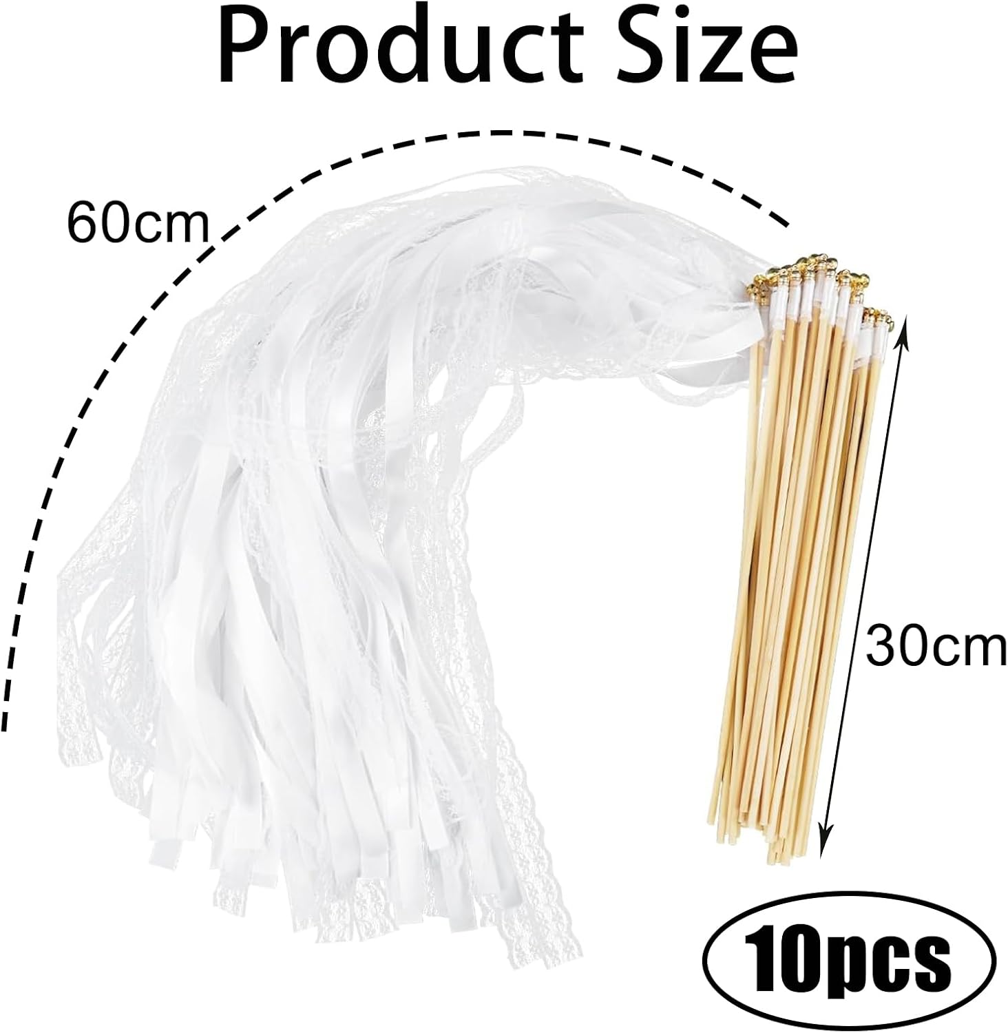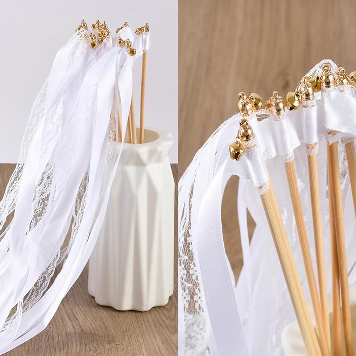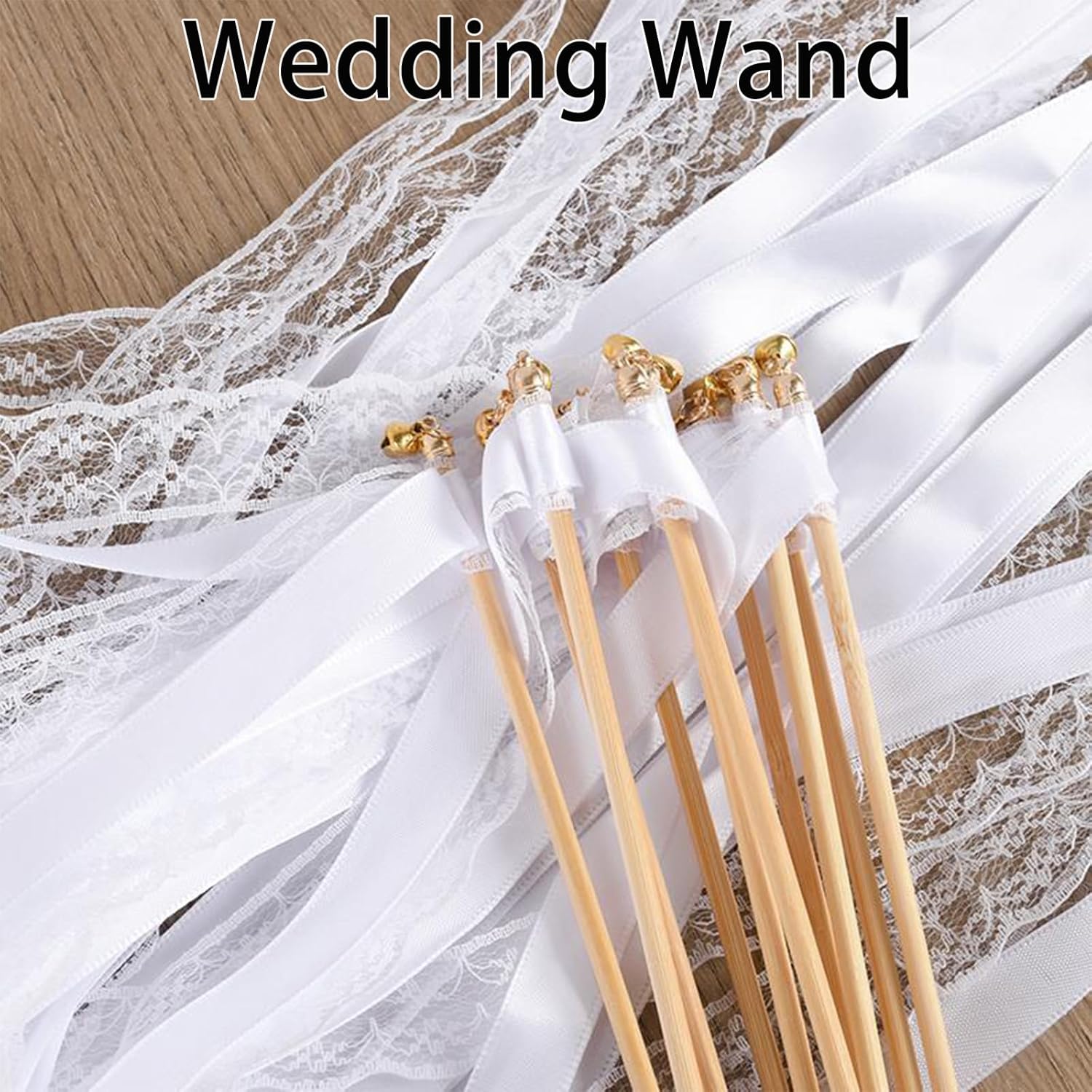 Materiali di alta qualità: le nostre bacchette nuziali sono realizzate in robusto nastro di tessuto e legno naturale. Il nastro è realizzato in tessuto di alta qualità, robusto e resistente ed è saldamente fissato alla bacchetta di legno, quindi non devi preoccuparti che cada. La bacchetta di legno naturale ha una superficie liscia e non ti farà male alle mani. È una decorazione resistente ed elegante. Design elegante: la bacchetta nuziale è una combinazione di nastro bianco e nastro di pizzo. La bacchetta nuziale bianca è semplice e bella. Il design in pizzo è elegante, raffinato e unico. Crea un'atmosfera romantica per la festa o il matrimonio e ti rende felice. Suono piacevole: una bella campanella dorata è legata alla punta della bacchetta in nastro. Ogni volta che agiti la bacchetta nuziale bianca, una piacevole campanella suonerà. Accompagnata da campanelle nuziali o musica da festa, puoi creare un'atmosfera vivace per la festa o il matrimonio. Contenuto della confezione: riceverai 10 bacchette nuziali. La bacchetta di legno è lunga 30 cm e ogni bacchetta è dotata di un nastro lungo 60 cm. Crea un'atmosfera romantica e sognante per il tuo matrimonio e rendilo un ricordo indimenticabile! Ampia gamma di usi: queste bacchette magiche sono adatte a diverse occasioni, in particolare cerimonie nuziali, feste, compleanni, anniversari, ecc. Sventolarle a feste e celebrazioni può portare una gioia infinita.