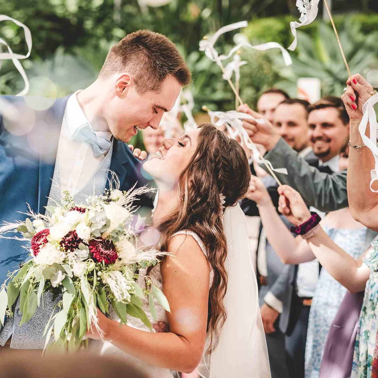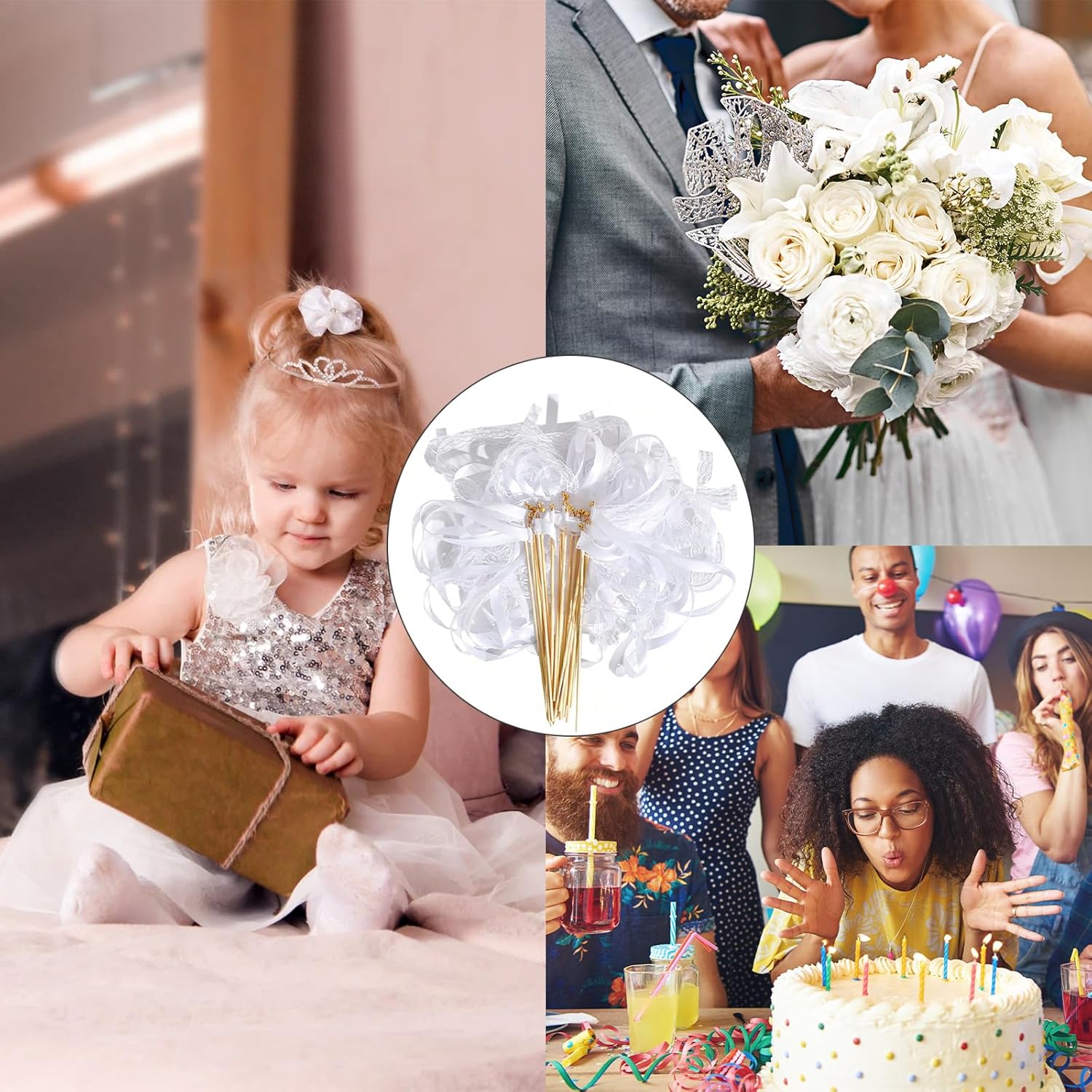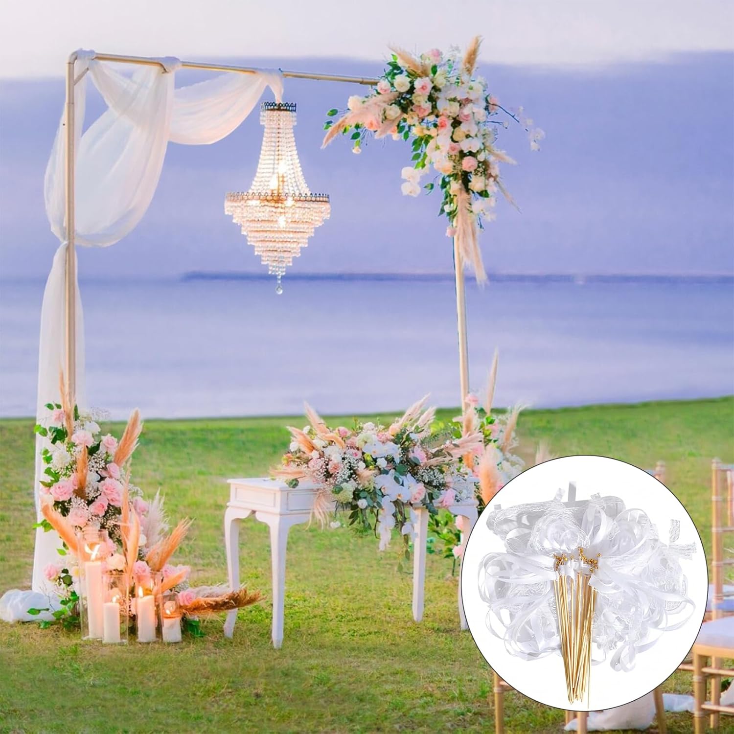 Materiali di alta qualità: le nostre bacchette nuziali sono realizzate in robusto nastro di tessuto e legno naturale. Il nastro è realizzato in tessuto di alta qualità, robusto e resistente ed è saldamente fissato alla bacchetta di legno, quindi non devi preoccuparti che cada. La bacchetta di legno naturale ha una superficie liscia e non ti farà male alle mani. È una decorazione resistente ed elegante. Design elegante: la bacchetta nuziale è una combinazione di nastro bianco e nastro di pizzo. La bacchetta nuziale bianca è semplice e bella. Il design in pizzo è elegante, raffinato e unico. Crea un'atmosfera romantica per la festa o il matrimonio e ti rende felice. Suono piacevole: una bella campanella dorata è legata alla punta della bacchetta in nastro. Ogni volta che agiti la bacchetta nuziale bianca, una piacevole campanella suonerà. Accompagnata da campanelle nuziali o musica da festa, puoi creare un'atmosfera vivace per la festa o il matrimonio. Contenuto della confezione: riceverai 10 bacchette nuziali. La bacchetta di legno è lunga 30 cm e ogni bacchetta è dotata di un nastro lungo 60 cm. Crea un'atmosfera romantica e sognante per il tuo matrimonio e rendilo un ricordo indimenticabile! Ampia gamma di usi: queste bacchette magiche sono adatte a diverse occasioni, in particolare cerimonie nuziali, feste, compleanni, anniversari, ecc. Sventolarle a feste e celebrazioni può portare una gioia infinita.