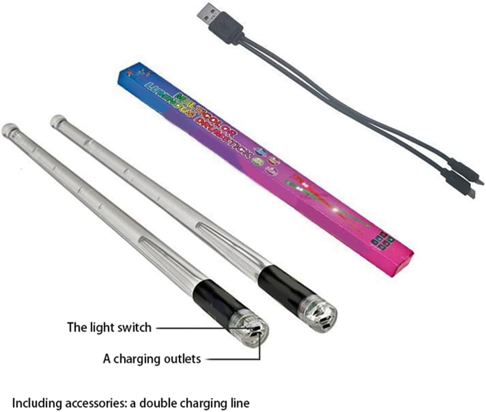 Fantastiche bacchette: le bacchette luminose attivate dal movimento ti offrono un'esperienza di gioco . Bacchette luminose: le bacchette luminose un incredibile effetto visivo mentre le bacchette luminose si muovono nell'aria i colori con un'oscillazione (viene fornito con 15 colori)! Bacchette luminose ricaricabili: pomello posteriore aggiornato, la batteria non si rimuove facilmente, design di ricarica USB, necessità di sostituire le batterie, più facile da usare. Personalizzazione della bacchetta: realizzata in materiale polimerico per una grande flessibilità, durata e comfort, adatta a tutte le della batteria. Bacchette elettroniche: perfette per bande musicali, kit elettronici e acustici. perfetto per batteristi dilettanti e professionisti, giovani e adulti.