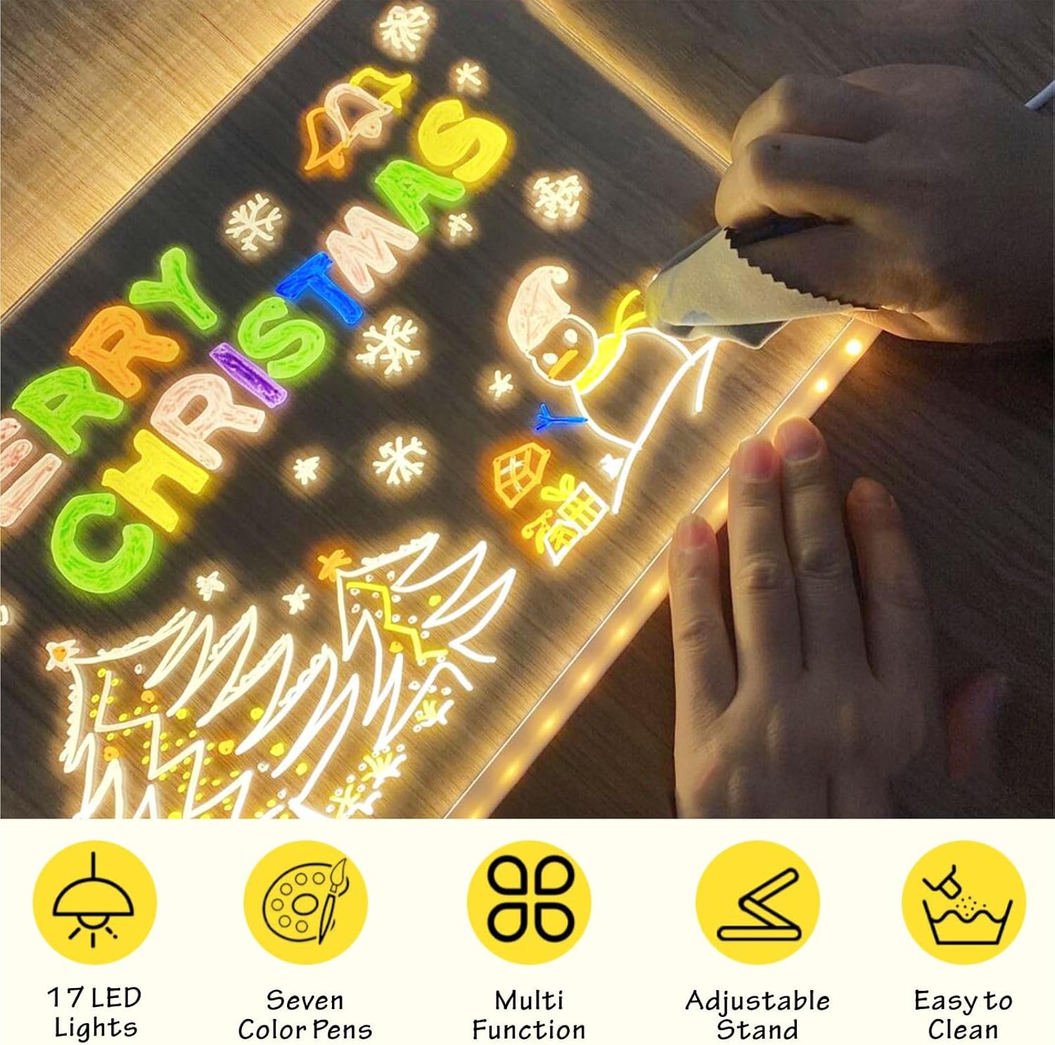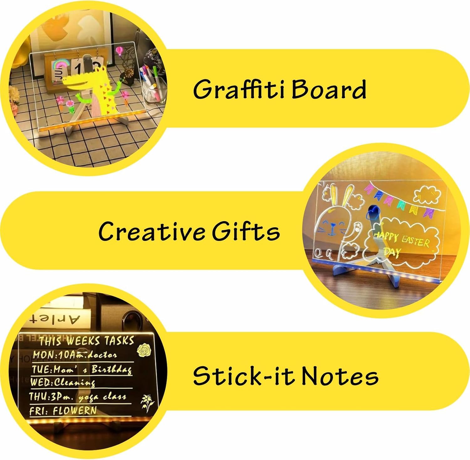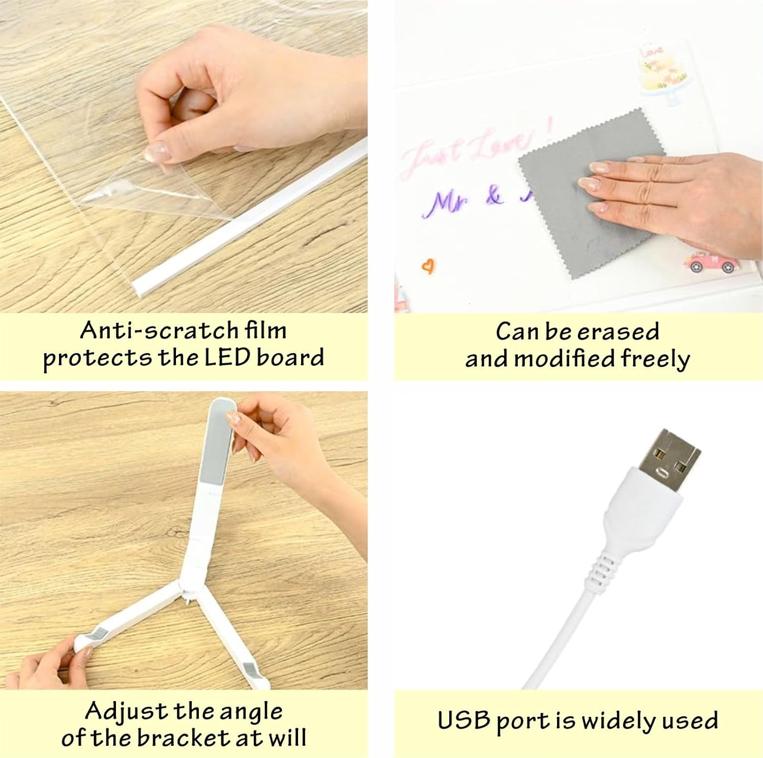 Bacheca Memo Board LED: Questa Bacheca LED con Colori è un oggetto multifunzione che unisce praticità e creatività. Led Note Board non è solo un efficace assistente d'ufficio, può registrare chiaramente cose da fare e promemoria importanti, ma anche una bacheca familiare da trasmettere. Led Note Board non solo una fonte di ispirazione creativa, ma anche una lavagna salvaspazio. Materiale: questa bacheca LED per bambini è dotata di penne fluorescenti a 7 colori e 17 stoppini LED, consentendo ai bambini di esprimere pienamente la propria creatività e disegnare un'infanzia da sogno. Realizzata in acrilico altamente trasparente, la bacheca LED è robusta e durevole, con una superficie liscia. Tabellone messaggi a LED Puliscilo una volta con un panno umido, quindi asciugalo con un panno asciutto per rinfrescarlo e riutilizzarlo senza limiti. Supporto regolabile: questo tabellone LED con colori ha un supporto regolabile, garantendo un supporto stabile e un aspetto elegante. La lavagna per appunti a LED con stile di design a colori e i suoi caratteri LED ad alta luminosità lo rendono immediatamente al centro dell'attenzione, rendendo la visualizzazione delle informazioni più espressiva. Pratica e versatile: questa bacheca LED è dotata di cavo di ricarica da 150 cm. Questo cavo più lungo offre una maggiore flessibilità durante l'installazione. Bacheca a LED Ideale per ristoranti, bar, centri commerciali, ecc. La bacheca a LED può essere utilizzata anche come lista di cose da fare, lista della spesa, calendario, bacheca, piano di studi, informazioni promozionali o anche come decorazione di compleanno. Regalo ideale: questa lavagna LED con colori è un regalo commovente per i secoli. La Lavagna Notes LED con Colori permette ai bambini di esprimere appieno la propria creatività, aiuta gli amici a annotare le proprie ispirazioni e porta un tocco di allegria in ufficio per i colleghi. L'effetto luce LED illumina ogni momento prezioso e illumina ogni momento importante!