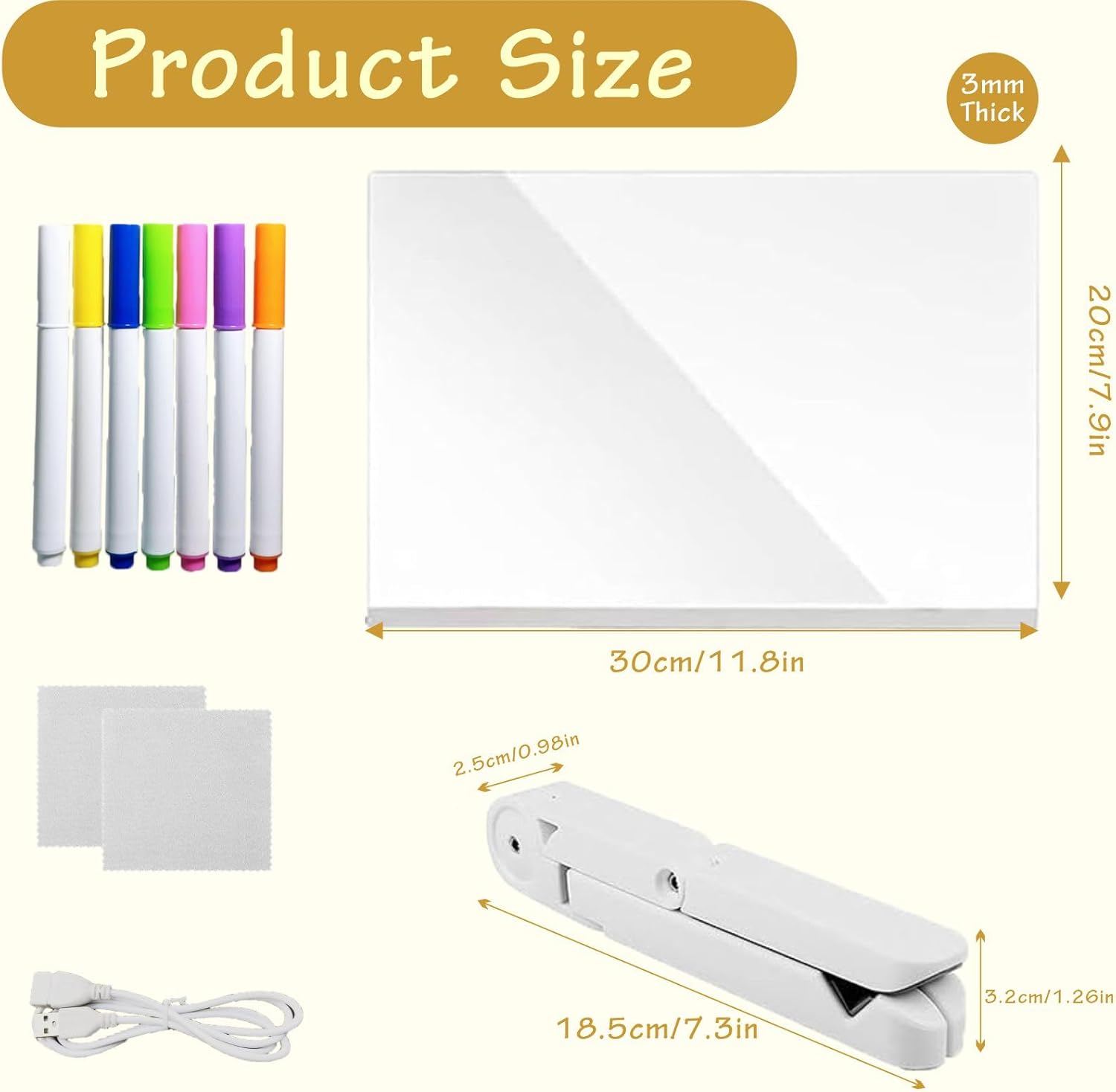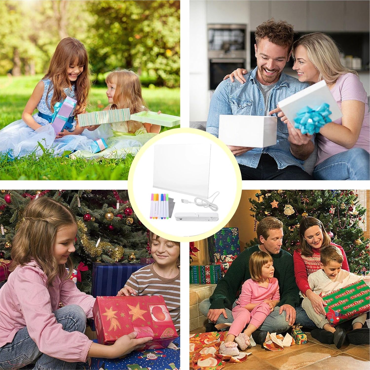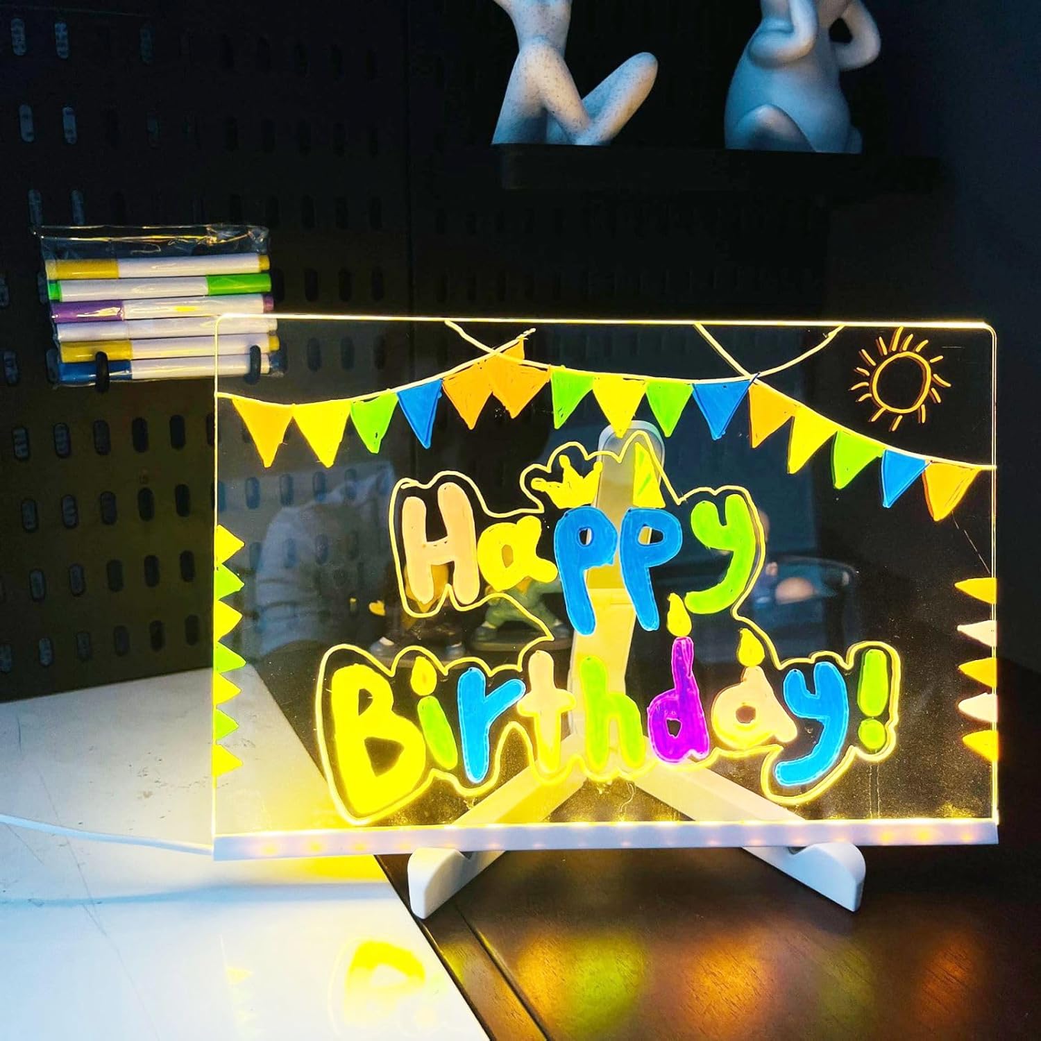 Bacheca Memo Board LED: Questa Bacheca LED con Colori è un oggetto multifunzione che unisce praticità e creatività. Led Note Board non è solo un efficace assistente d'ufficio, può registrare chiaramente cose da fare e promemoria importanti, ma anche una bacheca familiare da trasmettere. Led Note Board non solo una fonte di ispirazione creativa, ma anche una lavagna salvaspazio. Materiale: questa bacheca LED per bambini è dotata di penne fluorescenti a 7 colori e 17 stoppini LED, consentendo ai bambini di esprimere pienamente la propria creatività e disegnare un'infanzia da sogno. Realizzata in acrilico altamente trasparente, la bacheca LED è robusta e durevole, con una superficie liscia. Tabellone messaggi a LED Puliscilo una volta con un panno umido, quindi asciugalo con un panno asciutto per rinfrescarlo e riutilizzarlo senza limiti. Supporto regolabile: questo tabellone LED con colori ha un supporto regolabile, garantendo un supporto stabile e un aspetto elegante. La lavagna per appunti a LED con stile di design a colori e i suoi caratteri LED ad alta luminosità lo rendono immediatamente al centro dell'attenzione, rendendo la visualizzazione delle informazioni più espressiva. Pratica e versatile: questa bacheca LED è dotata di cavo di ricarica da 150 cm. Questo cavo più lungo offre una maggiore flessibilità durante l'installazione. Bacheca a LED Ideale per ristoranti, bar, centri commerciali, ecc. La bacheca a LED può essere utilizzata anche come lista di cose da fare, lista della spesa, calendario, bacheca, piano di studi, informazioni promozionali o anche come decorazione di compleanno. Regalo ideale: questa lavagna LED con colori è un regalo commovente per i secoli. La Lavagna Notes LED con Colori permette ai bambini di esprimere appieno la propria creatività, aiuta gli amici a annotare le proprie ispirazioni e porta un tocco di allegria in ufficio per i colleghi. L'effetto luce LED illumina ogni momento prezioso e illumina ogni momento importante!