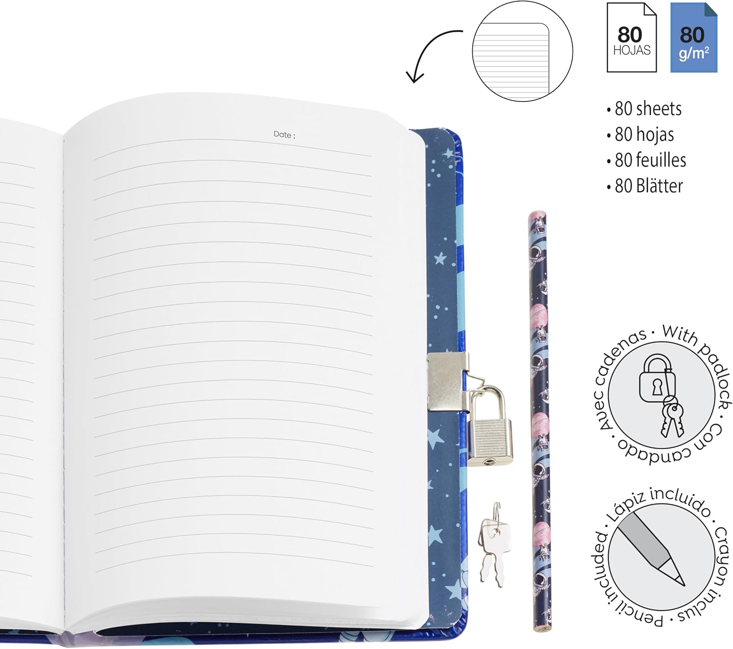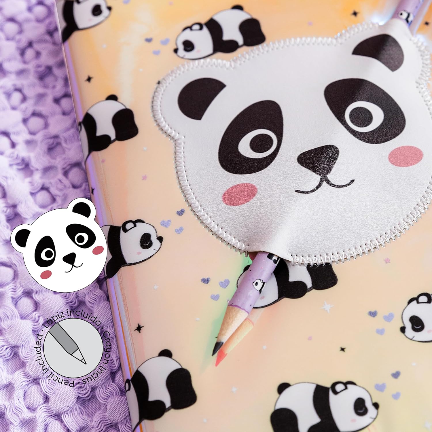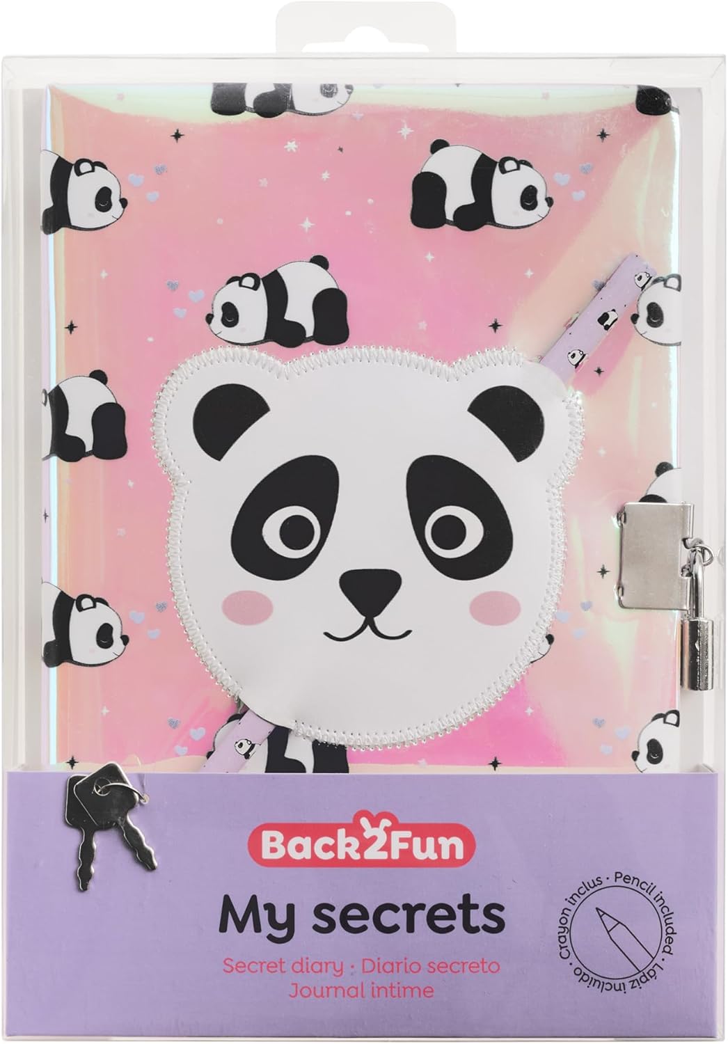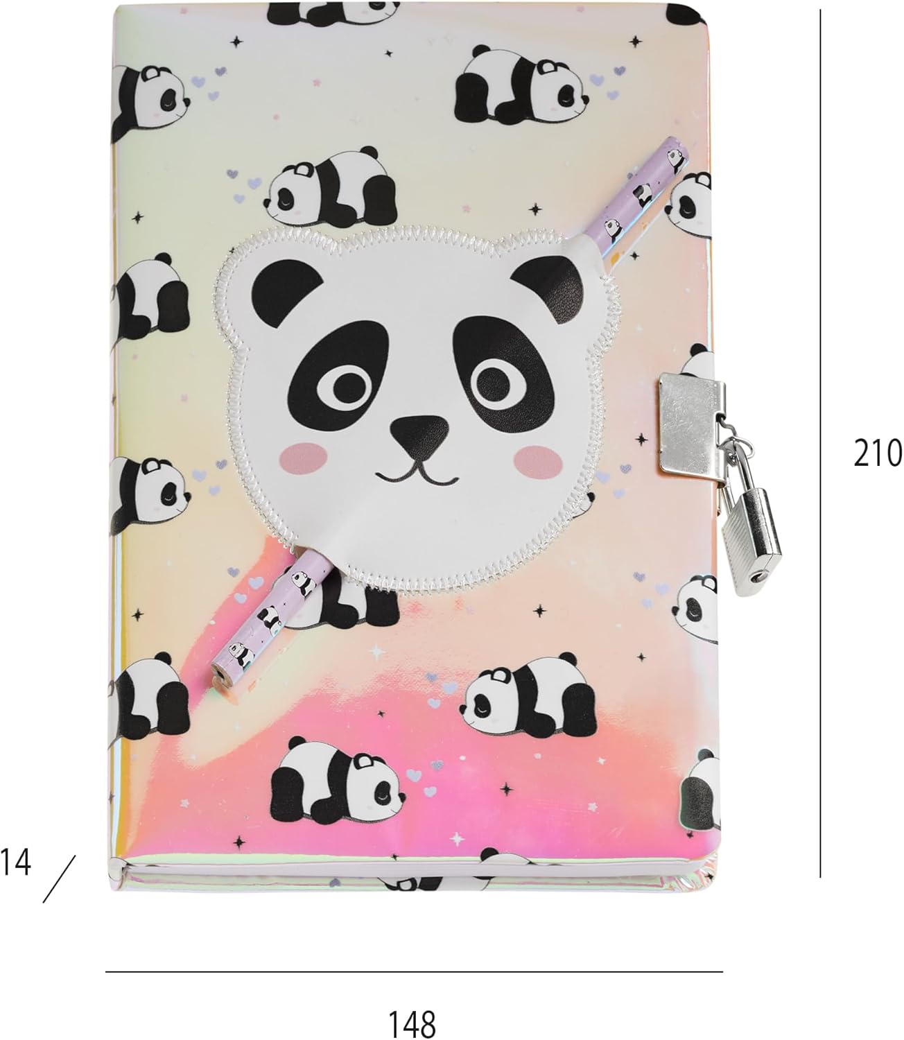 Diario con serratura, chiave e matita, ideale per scrivere pensieri personali, sogni o segreti. Include lucchetto in metallo con due chiavi e una matita abbinata per iniziare subito a scrivere. Blocco note per ragazze e ragazzi. Perfetto per idee, sentimenti o journaling quotidiano. Uno spazio intimo e creativo per i più piccoli. Diario OLOGRAFICO dalla magica lucentezza. La copertina con finitura olografica crea un effetto luminoso e colorato che rende ogni pagina ancora più speciale. Design robusto e affascinante. 80 fogli di quaderno a righe, simile a DIN A5 (148 x 210 x 14 mm), carta 80 g/m² e linee morbide per scrivere facilmente. Perfetto per la vita di tutti i giorni, le idee, i compiti o gli appunti di ritorno a scuola. BACK2FUN diario segreto panda con faccia da panda su sfondo lucido. Un design fantastico e adorabile per chi ama gli animali e i quaderni con stile.