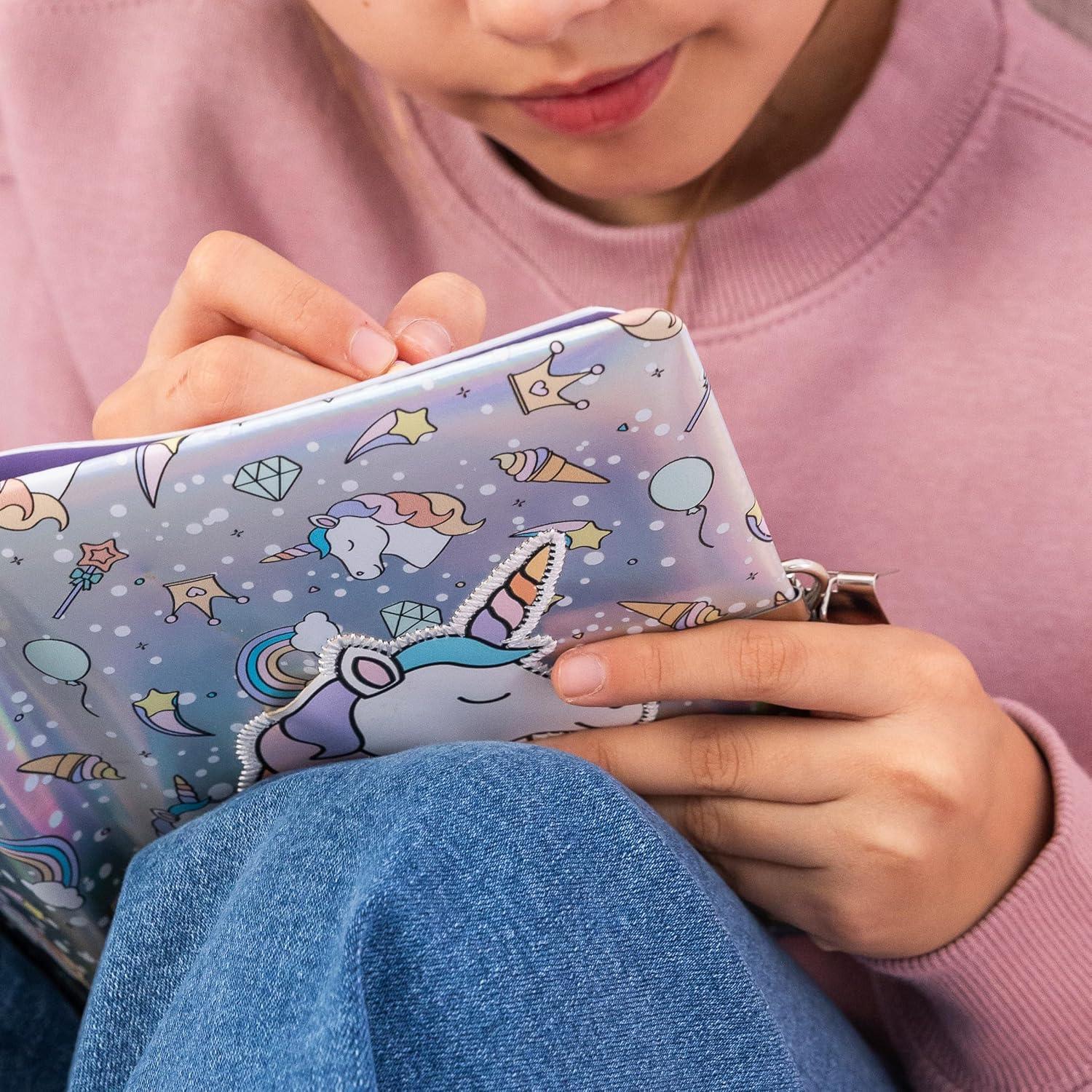 Diario con serratura, chiave e matita, ideale per scrivere pensieri personali, sogni o segreti. Include lucchetto in metallo con due chiavi e una matita abbinata per iniziare subito a scrivere. Blocco note per ragazze e ragazzi. Perfetto per idee, sentimenti o journaling quotidiano. Uno spazio intimo e creativo per i più piccoli. Diario OLOGRAFICO dalla magica lucentezza. La copertina con finitura olografica crea un effetto luminoso e colorato che rende ogni pagina ancora più speciale. Design robusto e affascinante. 80 fogli di quaderno a righe, simile a DIN A5 (148 x 210 x 14 mm), carta 80 g/m² e linee morbide per scrivere facilmente. Perfetto per la vita di tutti i giorni, le idee, i compiti o gli appunti di ritorno a scuola. BACK2FUN Diario segreto di unicorno con design carino su sfondo pastello e dettagli a stella. Ideale per le ragazze che amano gli unicorni, la fantasia e la cancelleria carina.