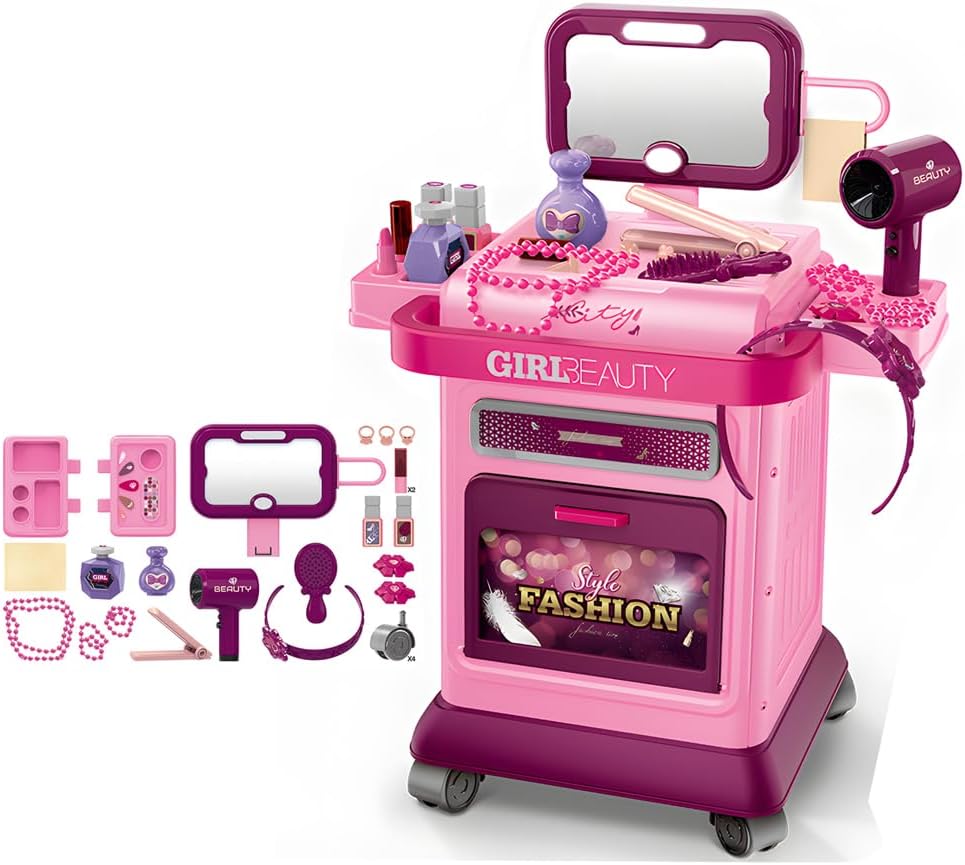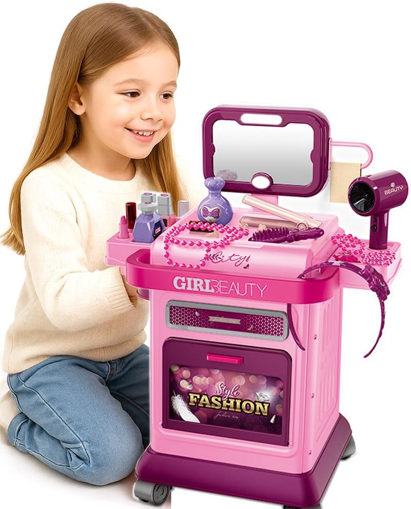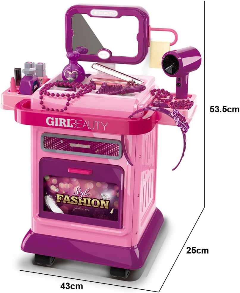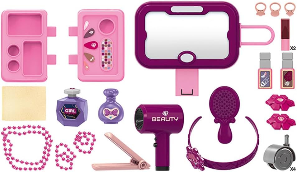 Il set beauty è la postazione perfetta per tutte le piccole amanti del glamour! Include un ampio piano con specchio, asciugacapelli, pettine, profumo, trucchi e gioielli per ricreare un vero salone di bellezza. Ogni accessorio è studiato per stimolare fantasia, creatività e gioco di ruolo. Con tantissimi accessori, questo set offre infinite possibilità di divertimento: le bambine potranno pettinarsi, truccarsi e inventare look sempre nuovi, proprio come in un vero centro estetico. Ideale per sviluppare manualità fine e coordinazione occhio-mano. Una volta chiuso, diventa una valigetta ordinata e portatile, perfetta per essere riposta o portata in vacanza, a casa di amici o dai nonni.
