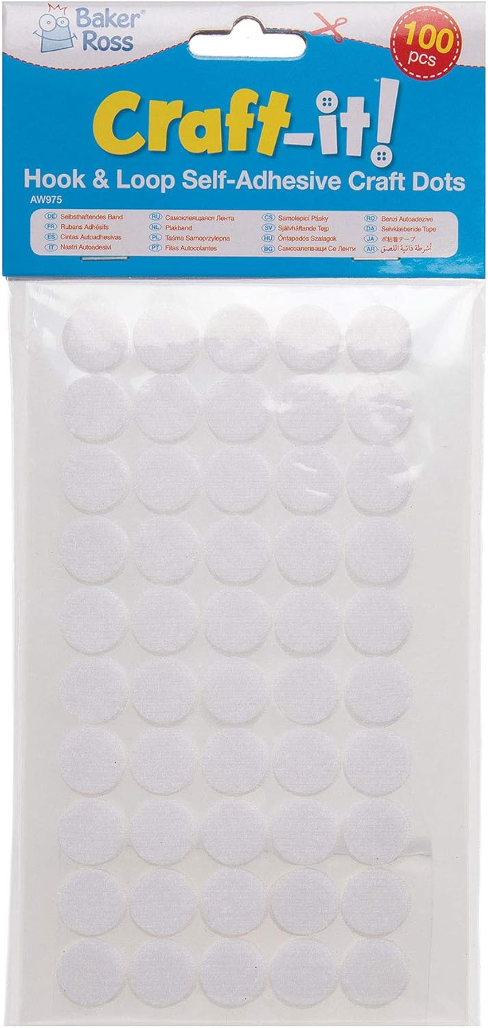 Attacco perfetto per migliorare le tue attività fai-da-te con un semplice retro autoadesivo per una maggiore presa. Ideale per poster, decorazioni, grafici e altro ancora. Ogni confezione include 100 punti ciascuno con gancio e anello. Premere insieme per chiudere e sbucciare per aprire. REALIZZATO DA ESPERTI: Baker Ross progetta e consegna i migliori oggetti di artigianato e giocattoli a scuole, gruppi e genitori da oltre 40 anni. Tutti i giocattoli e i prodotti Baker Ross sono conformi agli standard generali di sicurezza e, ove applicabile, viene indicata l'età minima.