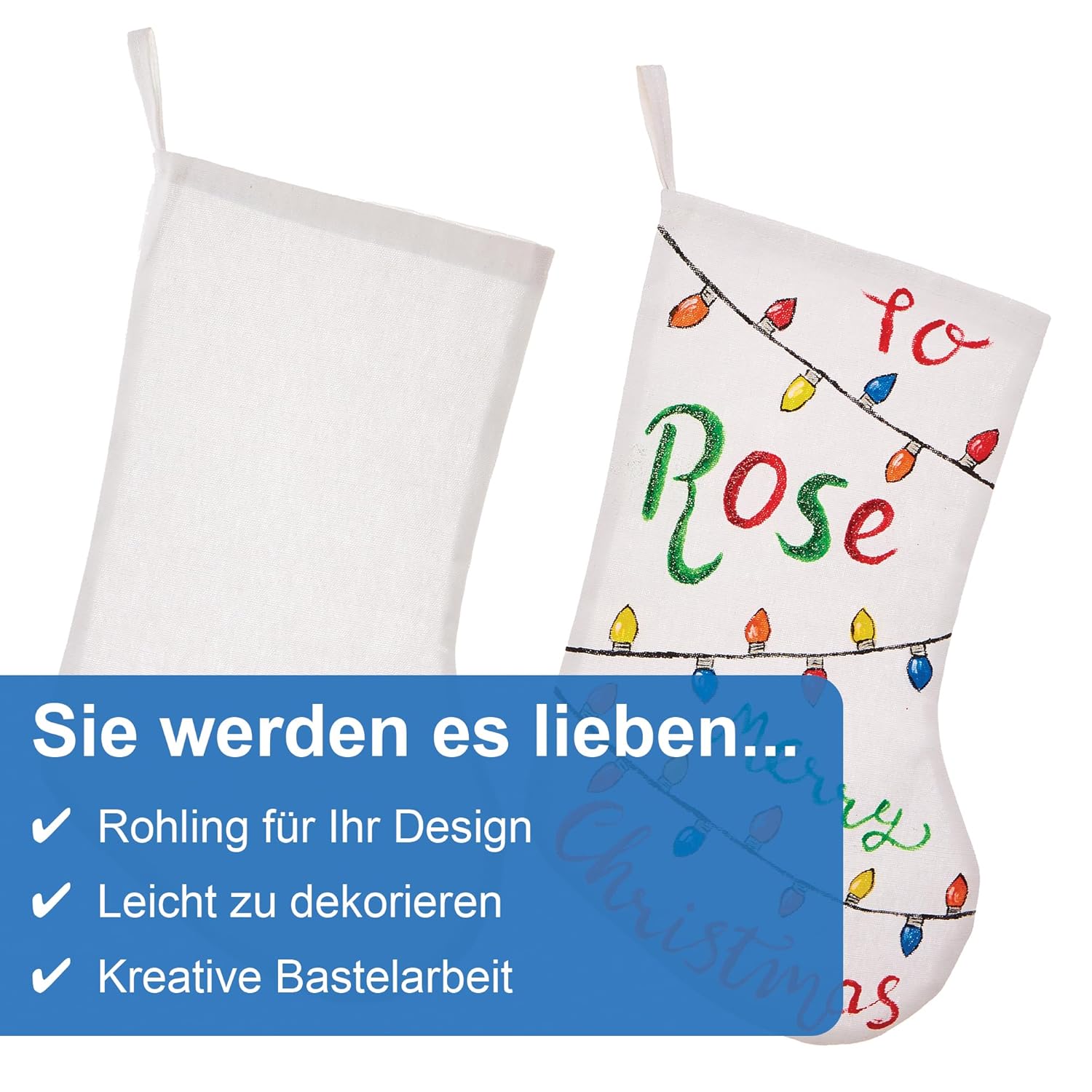 Calza natalizia vuota: questa confezione multipla di calze in tessuto è perfetta per decorare con i tuoi disegni e modelli. Le calze sono semplici e possono essere dipinte, disegnate e colorate. Calza vuota: i ragazzi e le ragazze si divertiranno sicuramente a personalizzare queste calze grezze di Natale. Queste calze possono essere utilizzate per una serie di progetti creativi a scuola, a casa e in classe. Pittura e tintura: crea le tue calze con i colori per tessuti, le penne e i colori tie-dye Baker Ross (non inclusi). Il pacchetto Decora la tua calza può essere utilizzato come introduzione all'artigianato tessile. Incluso nella confezione: Questa confezione contiene 3 calze. Misura 39 cm. Realizzato da esperti: Baker Ross progetta e fornisce i migliori materiali e giocattoli per arti e mestieri a scuole, gruppi e genitori da oltre 40 anni. Tutti i prodotti sono conformi alle norme generali sulla sicurezza dei prodotti e possono fornire una raccomandazione sull'età.