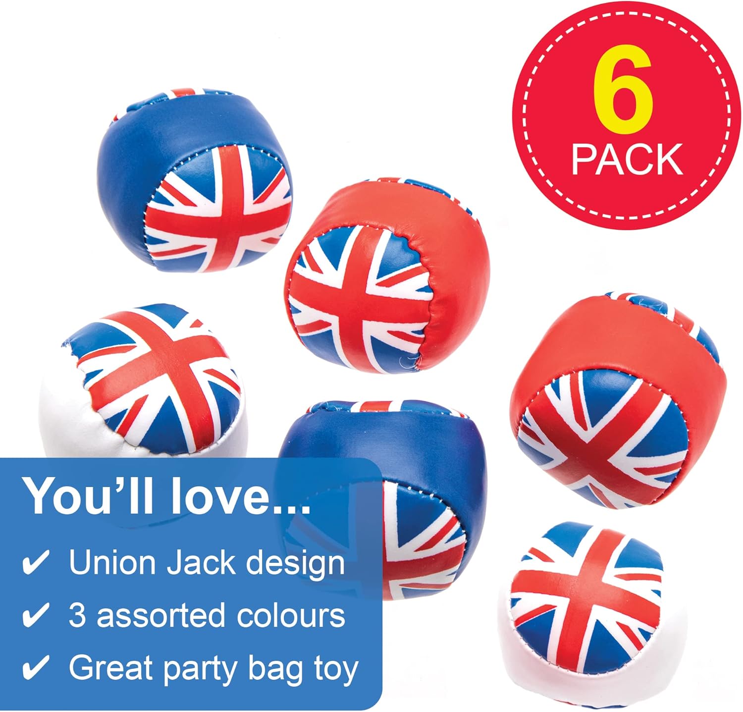 Regali per la borsa per feste di incoronazione: queste brillanti palline morbide Union Jack sono perfette per il tempo di gioco: ci sono così tanti giochi da provare con gli amici Giocattoli per feste per bambini: i bambini possono praticare il lancio e la cattura, dare loro un calcio e segnare un gol, fare i conti con la giocoleria o condividerli con i loro amici. Souvenir dell"incoronazione dell"Union Jack: Mettili in sacchetti per feste, regalali per commemorare l"incoronazione del re o tenili a portata di mano per ore di divertimento ovunque tu sia. Incluso nella confezione: 6 palline morbide ciascuna stampate con un Union Jack 3 colori assortiti Rosso, Bianco e Blu. 5 cm di diametro. Realizzato da esperti: Baker Ross progetta e fornisce le migliori forniture artistiche e artigianali, e giocattoli a scuole, gruppi e genitori da oltre 40 anni. Tutti i prodotti sono conformi alle normative generali sulla sicurezza dei prodotti e alle raccomandazioni sull'età indicate, ove applicabili