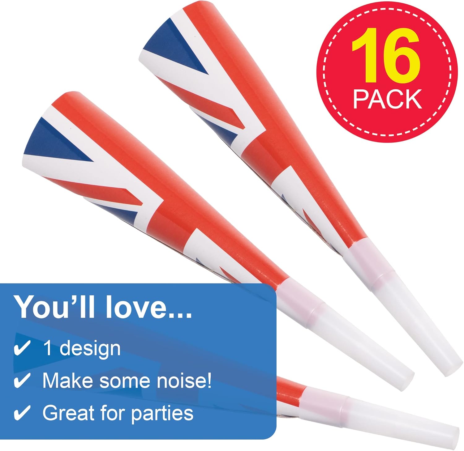 Decorazioni per feste giubilarie: fai un po 'di rumore alla tua festa del giubileo di platino e celebra il giubileo di platino della regina con queste corna da festa Union Jack. Forniture per feste Union Jack: ballerai sulla tua melodia sbarazzante non appena inizi a suonare, emettendo suoni forti e generalmente avrai una giornata brillante. Souvenir del giubileo di Union Jack: fai scoppiare queste corna da festa della Union Jack sul tavolo del partito per commemorare il Giubileo del Platino della Regina. Fai risaltare la tua festa da tutto il resto e abbinalo alla nostra gamma di feste Union Jack. Incluso nella confezione: 16 corna da festa. Dimensioni: lunghezza 20 cm. Realizzato da esperti: Baker Ross progetta e fornisce le migliori forniture artistiche e artigianali, e giocattoli per scuole, gruppi e genitori da oltre 40 anni. Tutti i prodotti sono conformi alle normative generali sulla sicurezza dei prodotti e, ove applicabile, raccomandazione dell'età dello stato