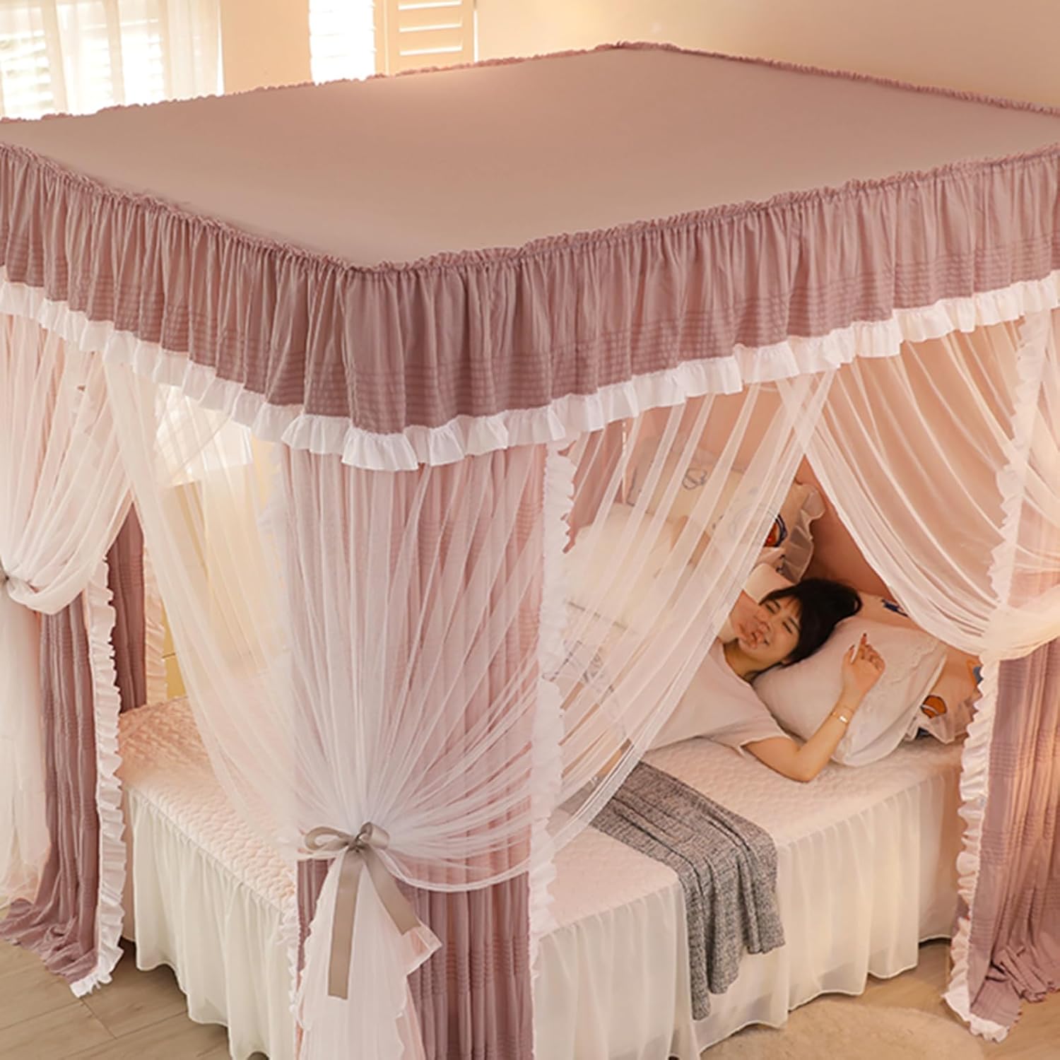 - Tenda a doppio strato: zanzariera a baldacchino con uno strato esterno in rete per bloccare i piccoli insetti e uno strato interno in rete traspirante con una tasca portaoggetti integrata. - Telaio rinforzato: tenda per letto a baldacchino con 4 montanti angolari e telaio in acciaio per un supporto robusto che rimane stabile anche quando ti muovi di notte. - e blocca la luce: tenda da letto Princessen con volant a 4 angoli che blocca efficacemente la polvere e filtra la luce quando è chiusa. Design con tenda scorrevole: tende a baldacchino a quattro angoli con binario scorrevole fluido e silenzioso per una facile apertura e chiusura con una sola mano. - Nota: ricordatevi di misurare le dimensioni del vostro letto prima dell'acquisto e che la tenda è lavabile ma non lavabile a secco o candeggiabile.