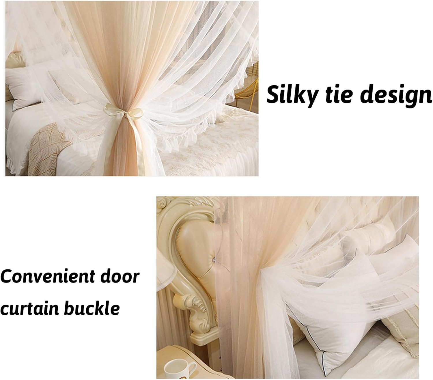 Design in filato a doppio strato: tende per letto a baldacchino a quattro angoli Il filato a doppio strato migliora sia l'aspetto che la consistenza, creando uno spazio per dormire da sogno. Design rialzato: il design rialzato offre spazio verticale, eliminando la sensazione di oppressione e garantendo spazio sufficiente per sedersi e muoversi nel letto. Rete rinforzata: baldacchino a 4 angoli per letto da bambina. Blocca efficacemente zanzare e altri insetti da tutte le angolazioni, consentendo un sonno indisturbato. Design a tripla porta per un ingresso e un'uscita comodi: poster angolare anti-insetti per letto a 4 angoli La struttura a tre porte consente un ingresso e un'uscita facili da entrambi i lati del letto. Comodo gancio per porta: dotata di un comodo gancio per porta, la tenda zanzariera si fissa ordinatamente quando è aperta, facilitando l'uso del letto.