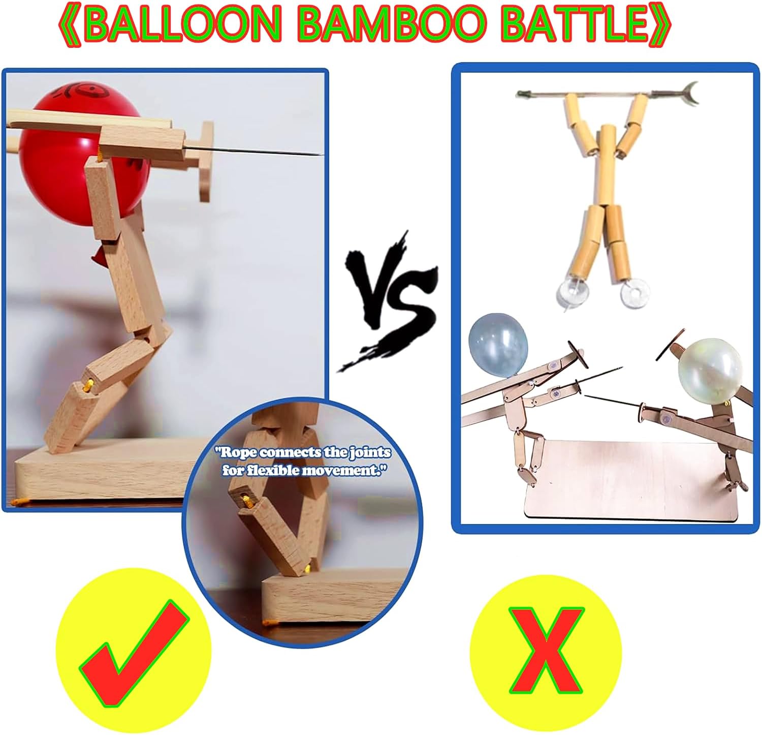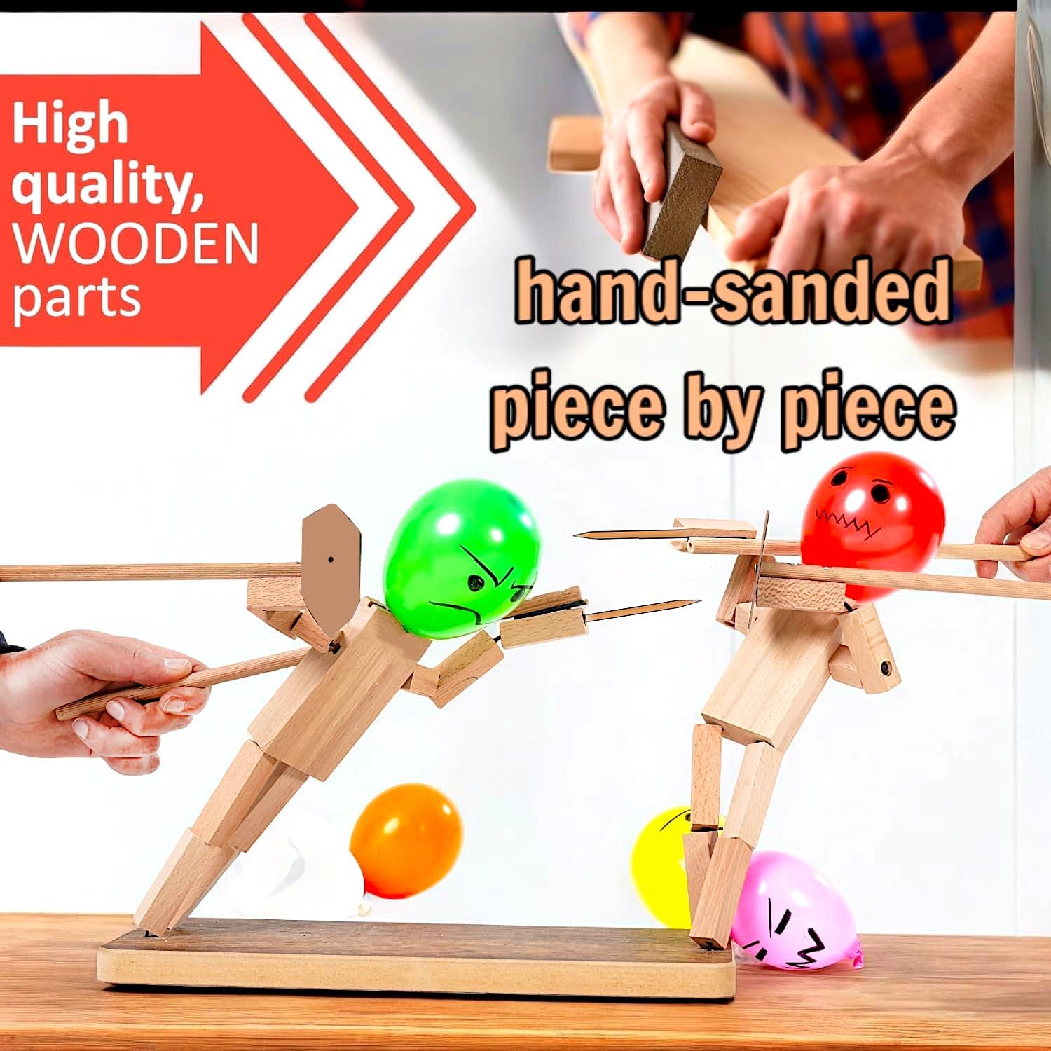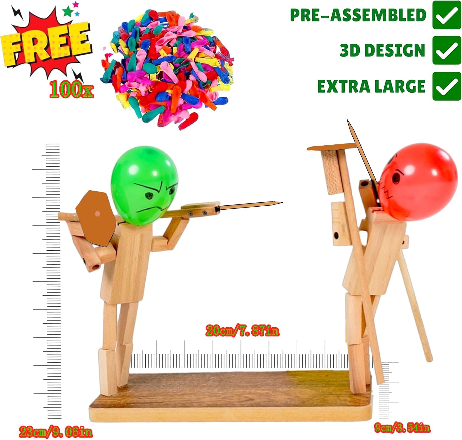 🎈🤺 Migliora la tua esperienza di gioco: Questo "Balloon Bamboo Man Battle" è un innovativo e veloce gioco di combattimento robot in legno per due giocatori. Un emozionante duello con bambole di recinzione in legno fatte a mano ed elaborate sarà una lotta in mongolfiera carica di adrenalina. 🎈🤺 Artigianato artistico e durata: Ammira la meticolosa artigianalità e la qualità resiliente di ogni bambola di legno. Realizzate in robusto bambù, queste bambole mostrano un'eccezionale artigianalità che garantisce sia fascino estetico che intrattenimento a lungo termine. 🎈🤺 Regole del gioco: Balloon man gioco di battaglia, Pierce il pallone dell'avversario per vincere! L'uomo palloncino tiene una spada e uno scudo in ogni mano che può controllarlo per attaccare e bloccare, rendendolo un giocattolo molto adatto per l'interazione genitore-bambino. Il gioco a palloncino veloce è facile da giocare, ma richiede abilità e strategie per vincere. 🎈🤺 Emoziona ad ogni turno: Preparati per un'esperienza elettrizzante! Balloon Fighter Battle è pieno di frenetica azione competitiva in cui si compete contro un amico e cercare di superarlo in astuzia e colpire il pallone in una serie di sfide emozionanti. Perfetto per dare un tocco divertente a qualsiasi evento. 🎈🤺 Perfetto Party Game: Perfetto per feste o riunioni casuali, questo è un modo per creare momenti indimenticabili e condividere la passione di giochi amichevoli mentre si godono i capricci di aerei da combattimento in legno con teste di palloncino.