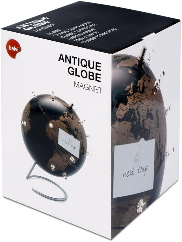 CON 12 MAGNETI. Magneti inclusi con i quali è possibile segnalare luoghi e mettere note o pianificare il tuo viaggio. EDUCATVO. Impara e localizza tutti i luoghi del mondo. Lingua inglese. ROTANTE. Ruota su un asse inclinato per ricreare la rotazione effettiva della Terra. DECORATIVO. Le rifiniture e il disegno decorano il tuo ambiente di lavoro o il tuo soggiorno. Dimensioni: 28,5x22,8x22,8 cm Werkstoff: Metall