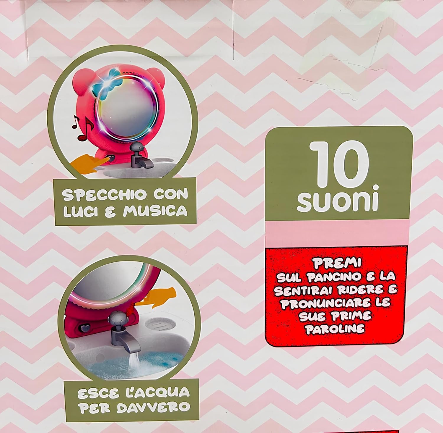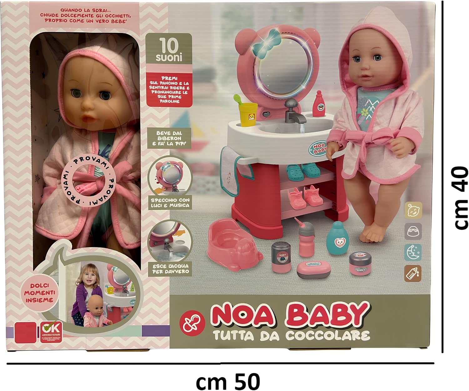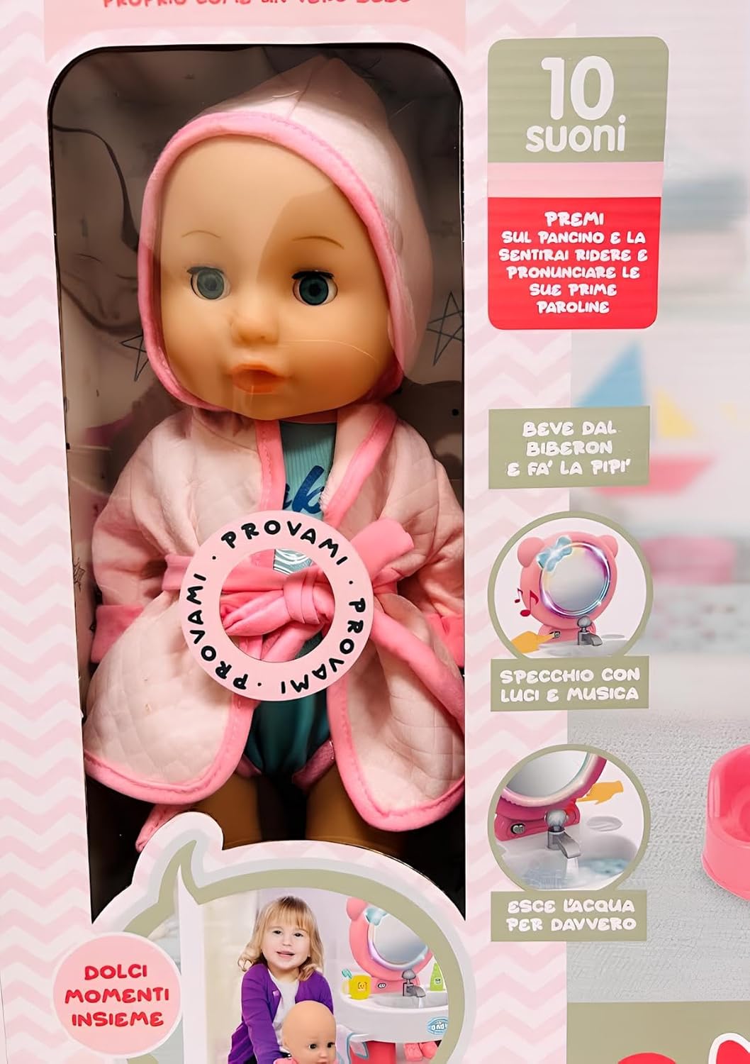 Questa bambola che beve e fa pipì parlante è un gioco interattivo completo che regala ai bambini un’esperienza realistica e coinvolgente: basta darle il biberon incluso e la vedranno davvero bere e fare la pipì nel vasino, proprio come un vero bebè. Un bambolotto cm 35 ricco di funzioni educative, perfetto per stimolare il gioco di imitazione e la fantasia dei più piccoli, che potranno accudirla come una vera mamma o un vero papà. Il bambolotto è dotato di 10 suoni realistici che accompagnano il gioco, rendendo l’esperienza ancora più emozionante: premi sul suo pancino e la sentirai ridere, piangere, chiamare mamma e papà e pronunciare le sue prime paroline, proprio come un neonato interattivo. Questa funzione sonora lo rende un giocattolo educativo ideale per lo sviluppo del linguaggio, dell’empatia e delle capacità sociali dei bambini. La bambola parlante è accompagnata da una splendida specchiera luminosa con luci e musica, che arricchisce il set con un tocco di magia e di realismo. Lo specchio con effetti luminosi e melodie trasforma il momento del gioco in un’esperienza unica, favorendo la creatività e l’immaginazione. I bambini potranno divertirsi a imitare la routine quotidiana, tra igiene, cura e preparazione, come se stessero davvero accudendo un piccolo bebè. Il set include un innovativo lavandino con rubinetto funzionante: basta riempirlo e dall’erogatore uscirà davvero l’acqua, per un gioco realistico che permette ai bambini di lavare le manine della bambola, sciacquare gli accessori e riprodurre le attività quotidiane. Questa caratteristica speciale rende il prodotto unico tra i bambolotti con accessori bagno, stimolando la manualità e il gioco interattivo. La confezione contiene numerosi accessori per il bagnetto e la cura della bambola: vasino, biberon, contenitori, scarpe, accappatoio morbido con cappuccio e tanti oggetti che trasformano il gioco in un’esperienza completa. Ogni dettaglio è pensato per rendere la bambola più realistica e per regalare ore di divertimento. Il vasino per bambolotto e la funzione pipì offrono un’esperienza educativa che insegna ai bambini le basi della cura e dell’igiene. Il bambolotto interattivo con 10 suoni è adatto rappresenta un’idea regalo perfetta per compleanni, feste o Natale. La maxi scatola regalo elegante e colorata contiene tutto il necessario per iniziare a giocare subito, rendendo questo prodotto una scelta ideale per genitori che vogliono stimolare la fantasia dei propri figli con un gioco sicuro, educativo e di grande qualità. Con la bambola Tutta da Coccolare i bambini potranno vivere dolci momenti insieme, prendendosi cura del loro nuovo bebè. Grazie alla combinazione di funzioni speciali – suoni, pipì, biberon, specchio luminoso musicale e lavandino con acqua – questo set diventa uno dei giocattoli più completi e interattivi per bambine e bambini, capace di unire gioco di ruolo, apprendimento e divertimento in un unico prodotto .