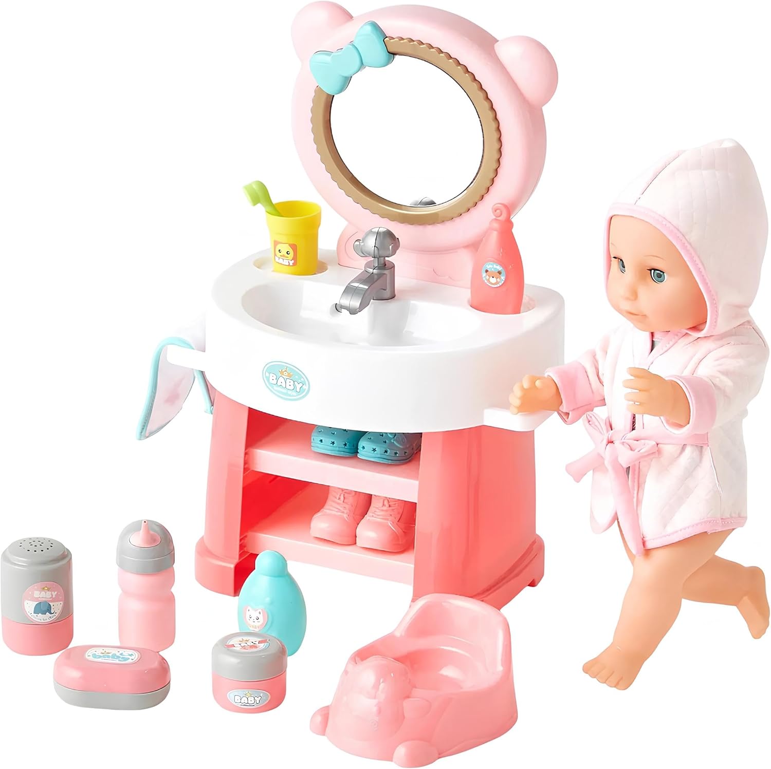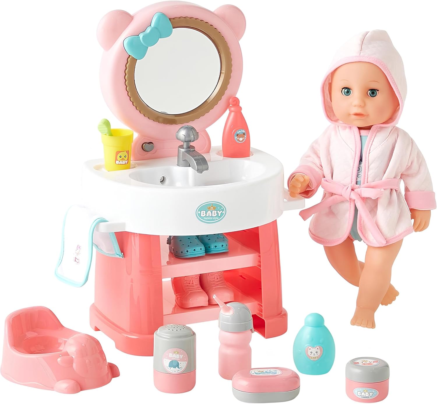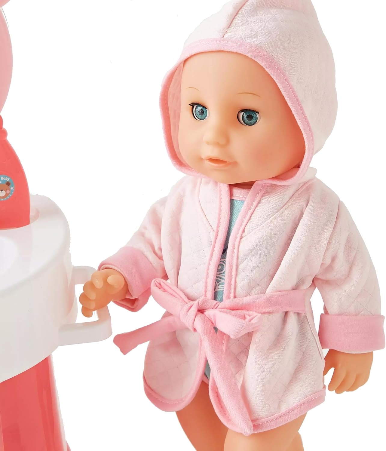 Questa bambola che beve e fa pipì parlante è un gioco interattivo completo che regala ai bambini un’esperienza realistica e coinvolgente: basta darle il biberon incluso e la vedranno davvero bere e fare la pipì nel vasino, proprio come un vero bebè. Un bambolotto cm 35 ricco di funzioni educative, perfetto per stimolare il gioco di imitazione e la fantasia dei più piccoli, che potranno accudirla come una vera mamma o un vero papà. Il bambolotto è dotato di 10 suoni realistici che accompagnano il gioco, rendendo l’esperienza ancora più emozionante: premi sul suo pancino e la sentirai ridere, piangere, chiamare mamma e papà e pronunciare le sue prime paroline, proprio come un neonato interattivo. Questa funzione sonora lo rende un giocattolo educativo ideale per lo sviluppo del linguaggio, dell’empatia e delle capacità sociali dei bambini. La bambola parlante è accompagnata da una splendida specchiera luminosa con luci e musica, che arricchisce il set con un tocco di magia e di realismo. Lo specchio con effetti luminosi e melodie trasforma il momento del gioco in un’esperienza unica, favorendo la creatività e l’immaginazione. I bambini potranno divertirsi a imitare la routine quotidiana, tra igiene, cura e preparazione, come se stessero davvero accudendo un piccolo bebè. Il set include un innovativo lavandino con rubinetto funzionante: basta riempirlo e dall’erogatore uscirà davvero l’acqua, per un gioco realistico che permette ai bambini di lavare le manine della bambola, sciacquare gli accessori e riprodurre le attività quotidiane. Questa caratteristica speciale rende il prodotto unico tra i bambolotti con accessori bagno, stimolando la manualità e il gioco interattivo. La confezione contiene numerosi accessori per il bagnetto e la cura della bambola: vasino, biberon, contenitori, scarpe, accappatoio morbido con cappuccio e tanti oggetti che trasformano il gioco in un’esperienza completa. Ogni dettaglio è pensato per rendere la bambola più realistica e per regalare ore di divertimento. Il vasino per bambolotto e la funzione pipì offrono un’esperienza educativa che insegna ai bambini le basi della cura e dell’igiene. Il bambolotto interattivo con 10 suoni è adatto rappresenta un’idea regalo perfetta per compleanni, feste o Natale. La maxi scatola regalo elegante e colorata contiene tutto il necessario per iniziare a giocare subito, rendendo questo prodotto una scelta ideale per genitori che vogliono stimolare la fantasia dei propri figli con un gioco sicuro, educativo e di grande qualità. Con la bambola Tutta da Coccolare i bambini potranno vivere dolci momenti insieme, prendendosi cura del loro nuovo bebè. Grazie alla combinazione di funzioni speciali – suoni, pipì, biberon, specchio luminoso musicale e lavandino con acqua – questo set diventa uno dei giocattoli più completi e interattivi per bambine e bambini, capace di unire gioco di ruolo, apprendimento e divertimento in un unico prodotto .