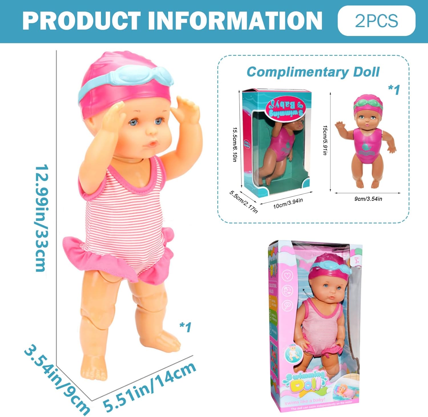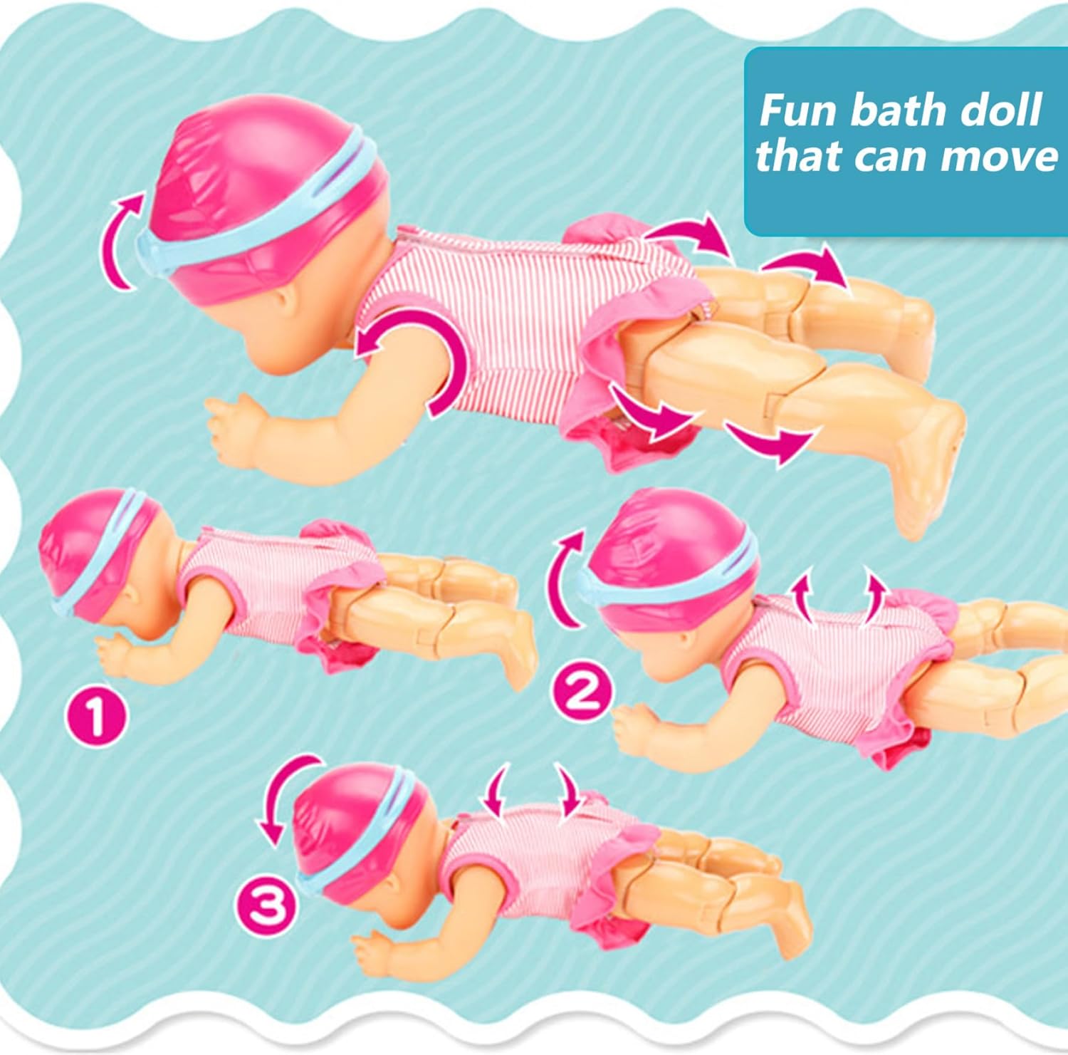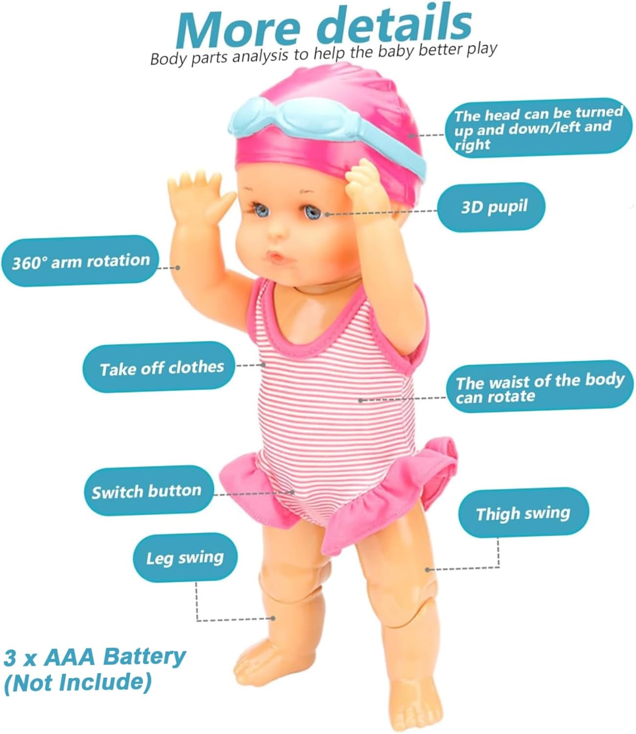 Perfetta per il divertimento in acqua: ottima per compleanni, vacanze o qualsiasi occasione speciale, questa bambola da nuoto è adorabile e premurosa per i bambini che amano il bagnetto, le attività in piscina e i giochi acquatici, la gioia fantasiosa e il gioco. Sicurezza e adatta ai bambini: realizzata con materiali atossici e privi di BPA, questa bambola garantisce un tempo di gioco sicuro per neonati e bambini piccoli, rendendola una scelta affidabile per i genitori che cercano giocattoli acquatici sicuri. Bambola interattiva realistica: questa bambola che nuota è dotata di articolazioni mobili realistiche e azione di nuoto alimentata a batteria, offrendo un'esperienza interattiva coinvolgente che cattura l'immaginazione del bambino e incoraggia il gioco di cura. Design impermeabile e stabile: progettata appositamente per i giochi in acqua, questa bambola impermeabile è perfetta per la piscina o la vasca da bagno, realizzata con materiali di qualità che resistono ai danni dell'acqua e garantiscono divertimento. Un costume da bagno staccabile incluso: la bambola viene fornita con un costume da bagno rimovibile e carino, che consente ai bambini di vestire o spogliare facilmente la bambola e promuovere giochi di ruolo creativi e lo sviluppo motorio.. Regala una bambolina come.